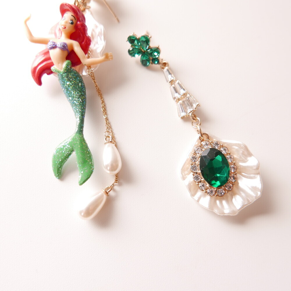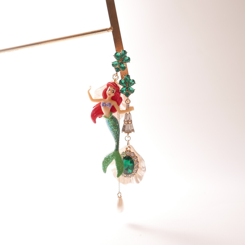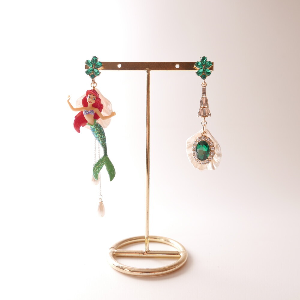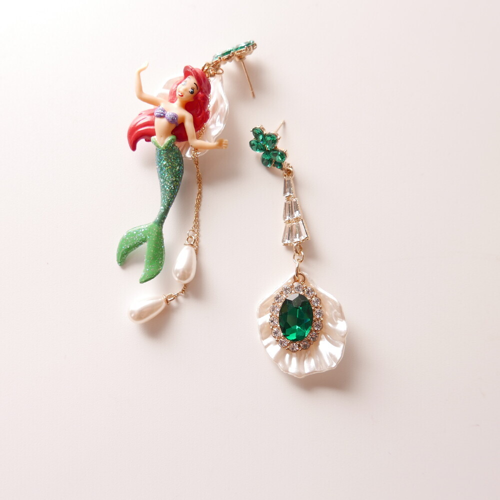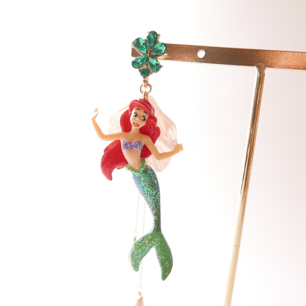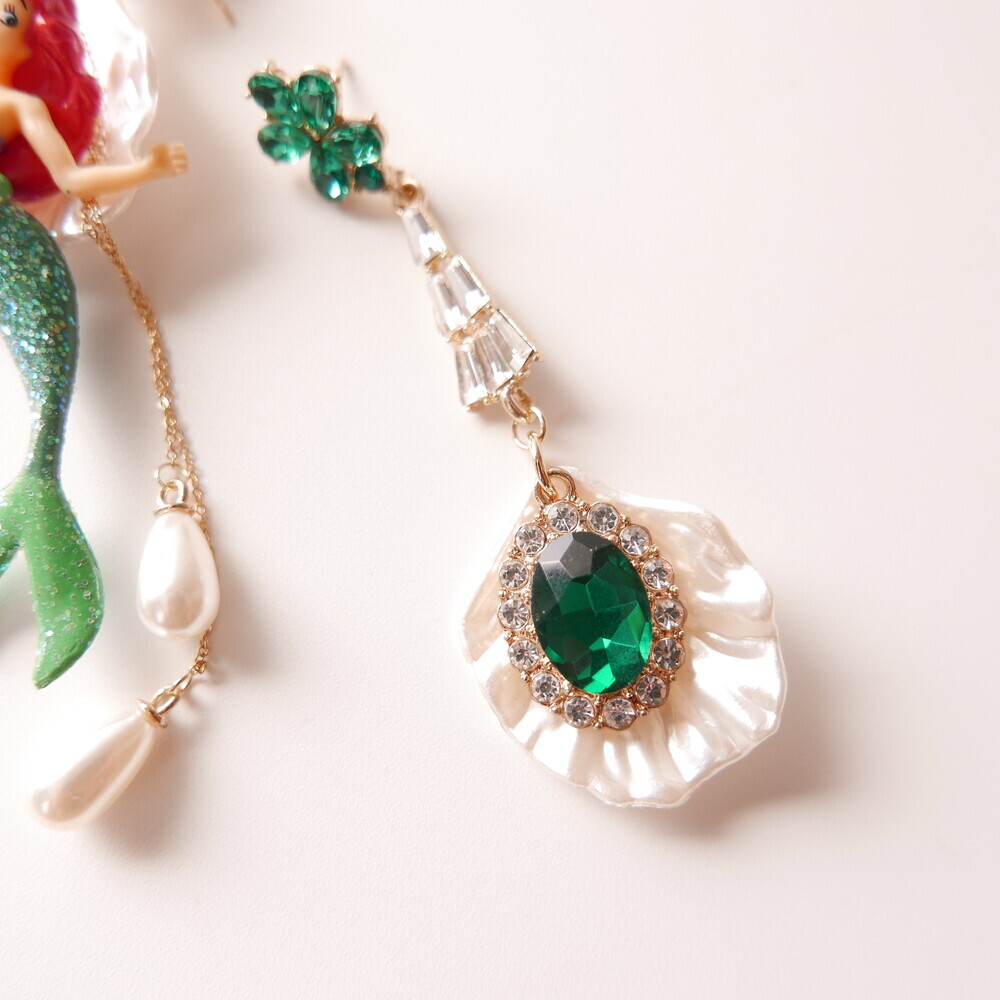 Inspired by the beloved undersea princess, this asymmetrical pair features Ariel in her shimmering green tail on one side and a seashell adorned with a sparkling emerald gem on the other.