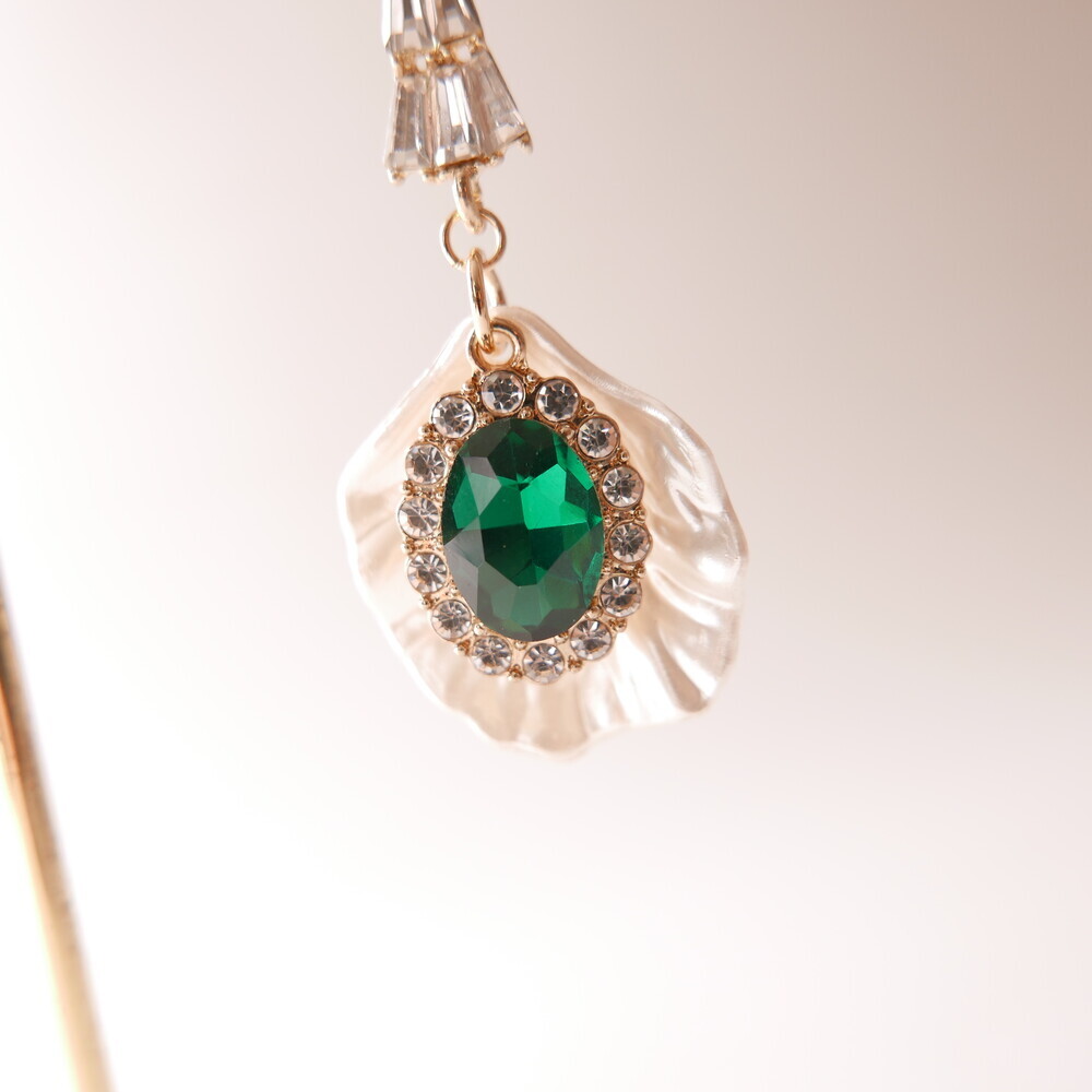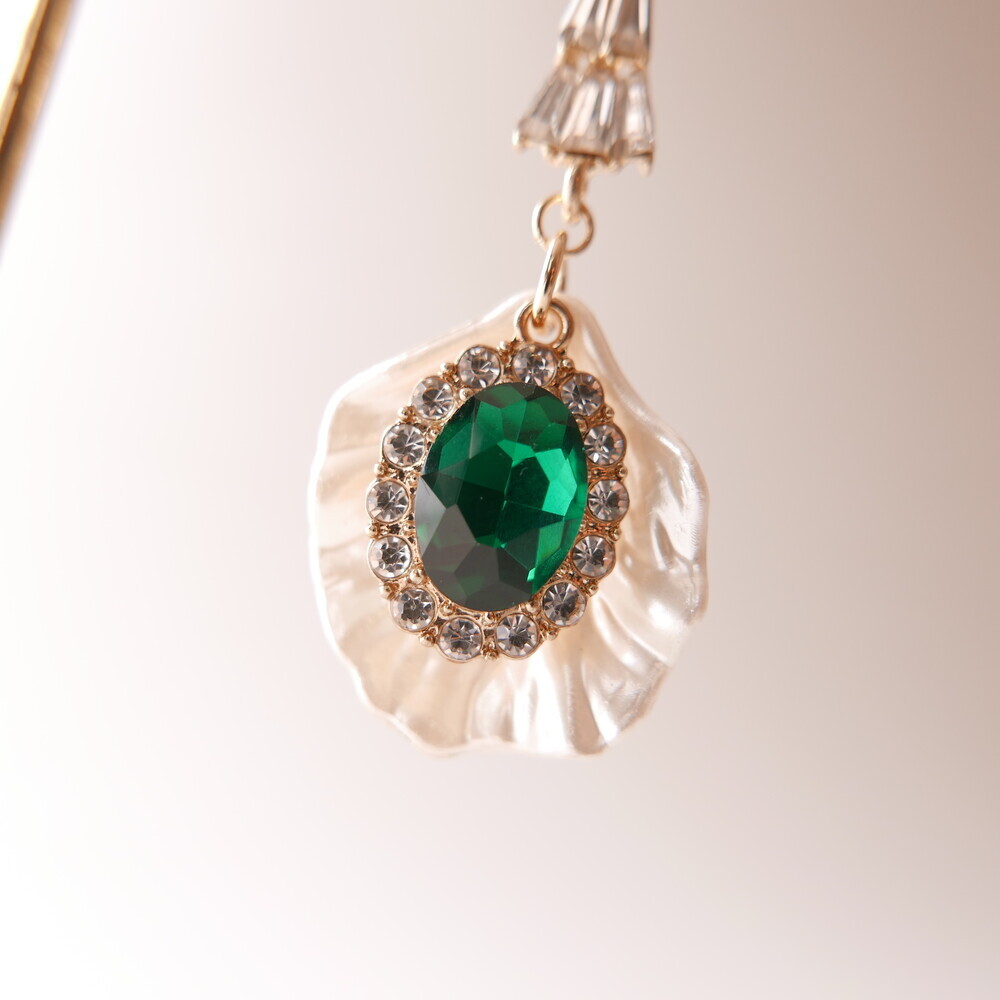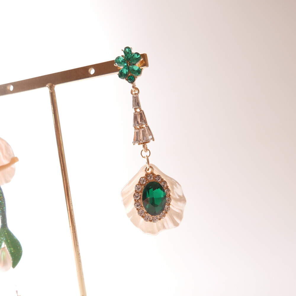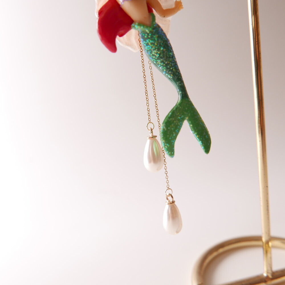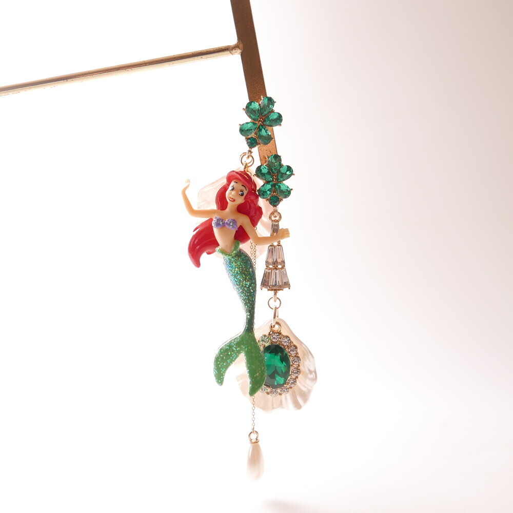 Inspired by the beloved undersea princess, this asymmetrical pair features Ariel in her shimmering green tail on one side and a seashell adorned with a sparkling emerald gem on the other.