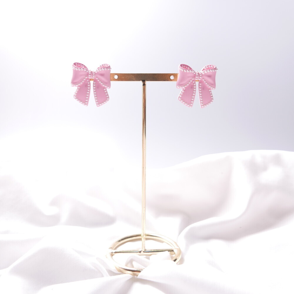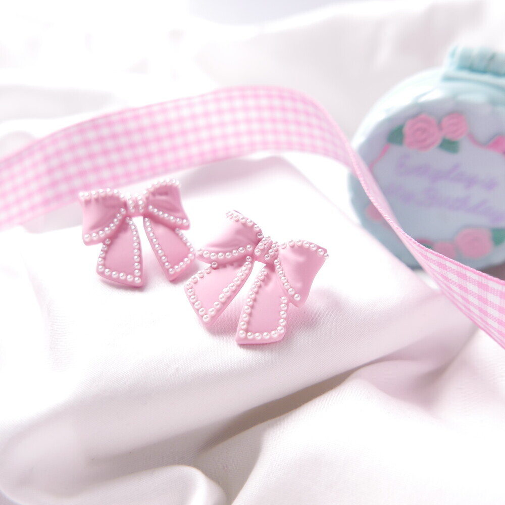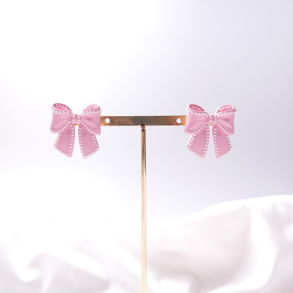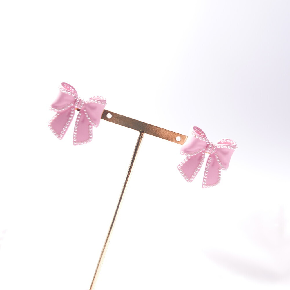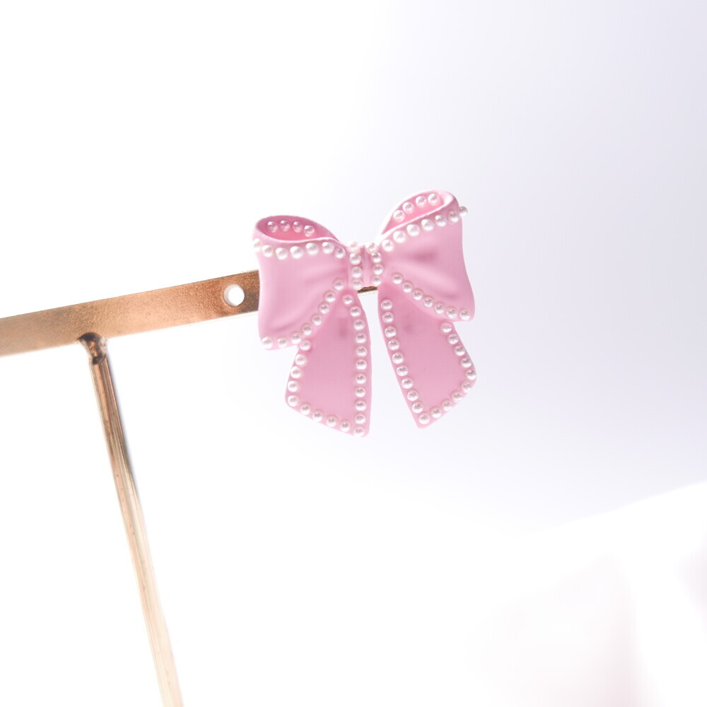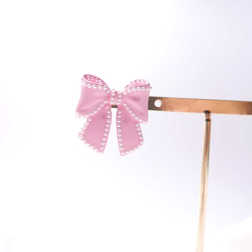 A lovely pastel-pink ribbon adorned with tiny faux pearls along every curve. This earring adds a sweet and feminine accent to any outfit, perfect for a soft, romantic style. The design features gentle pleats and a semi-3D shape, giving the piece volume and charm. Made with silver 92.5% posts for comfort.
