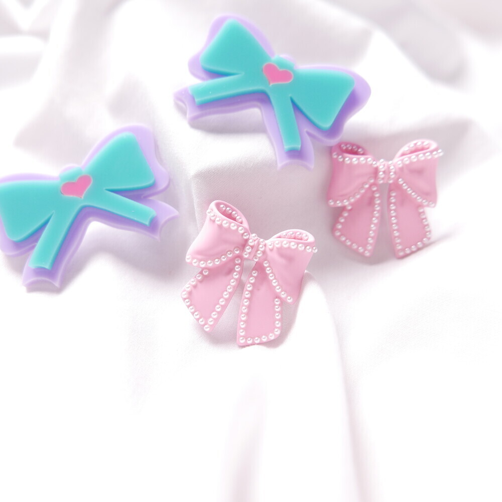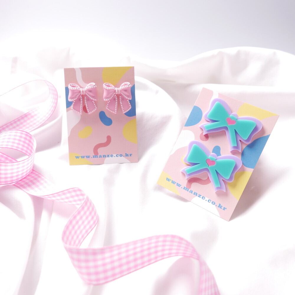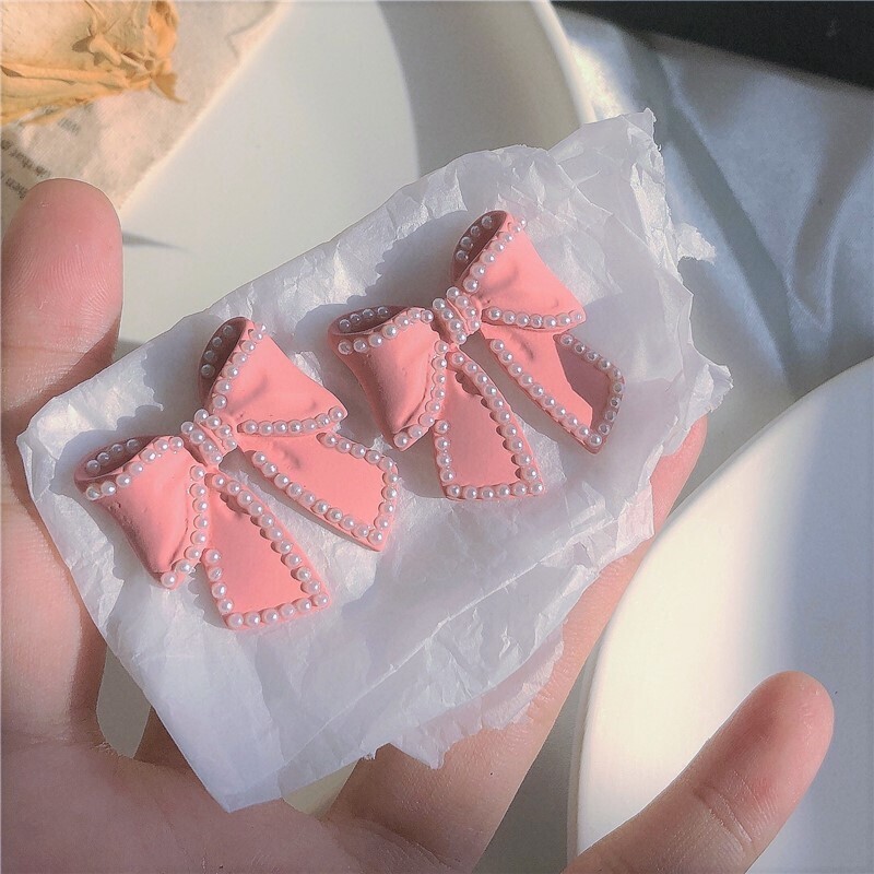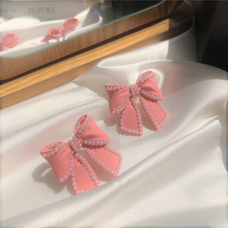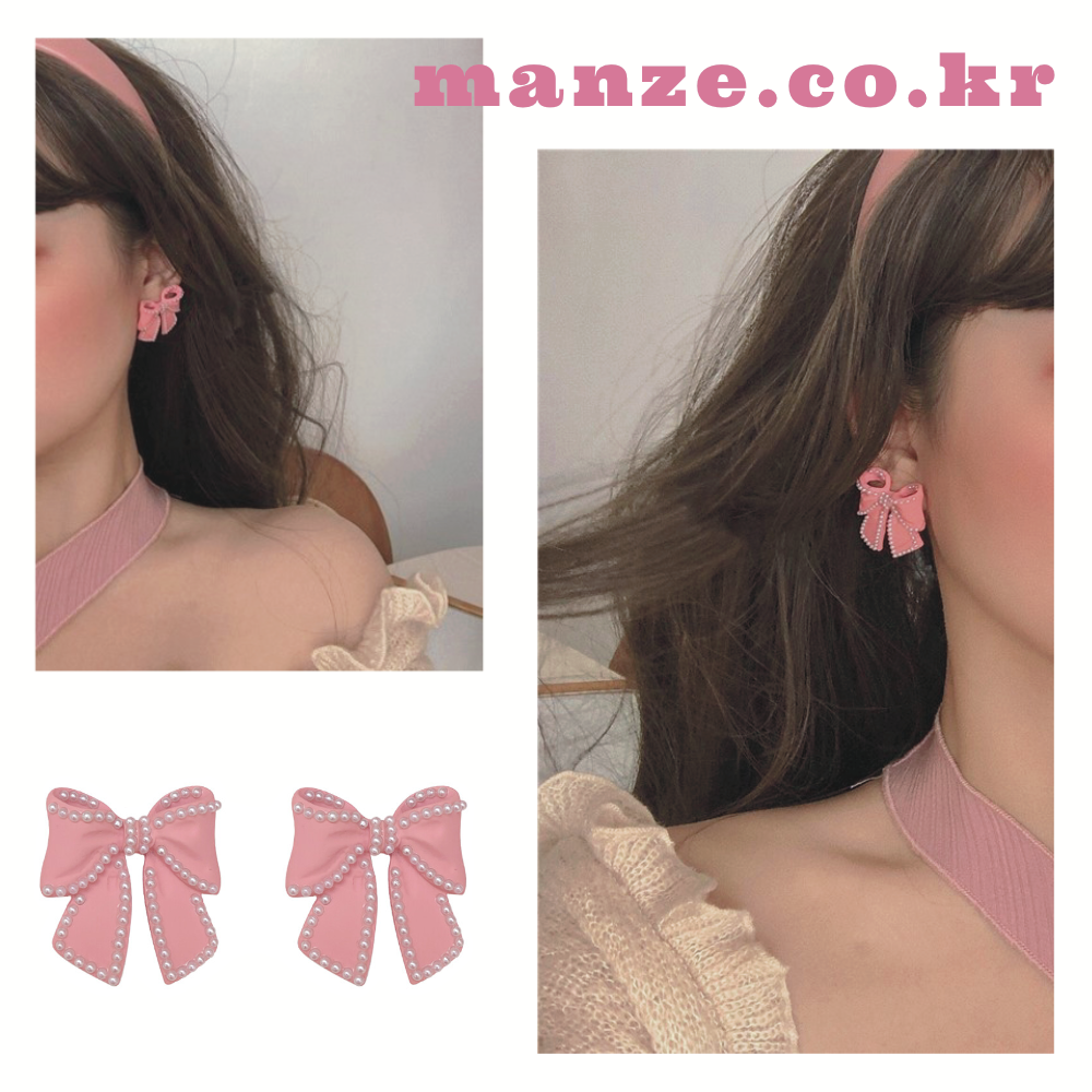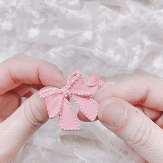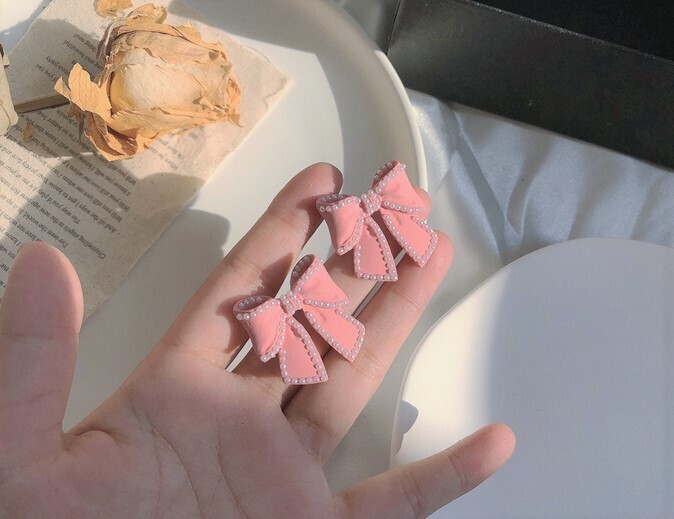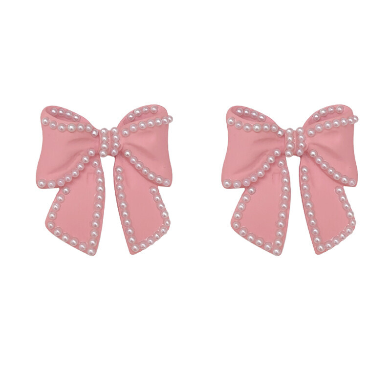 A lovely pastel-pink ribbon adorned with tiny faux pearls along every curve. This earring adds a sweet and feminine accent to any outfit, perfect for a soft, romantic style. The design features gentle pleats and a semi-3D shape, giving the piece volume and charm. Made with silver 92.5% posts for comfort.