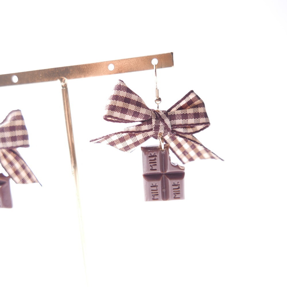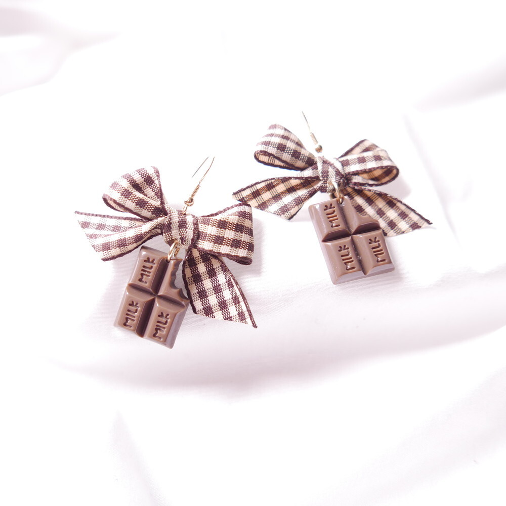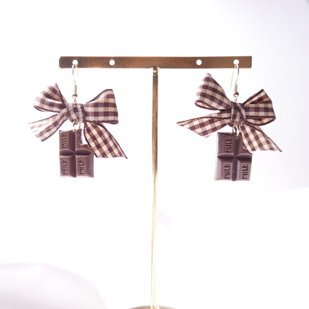 Indulge in cuteness with these Chocolate Earrings featuring adorable bite-sized chocolate bars hanging beneath a lovely gingham ribbon.