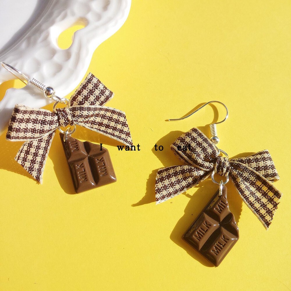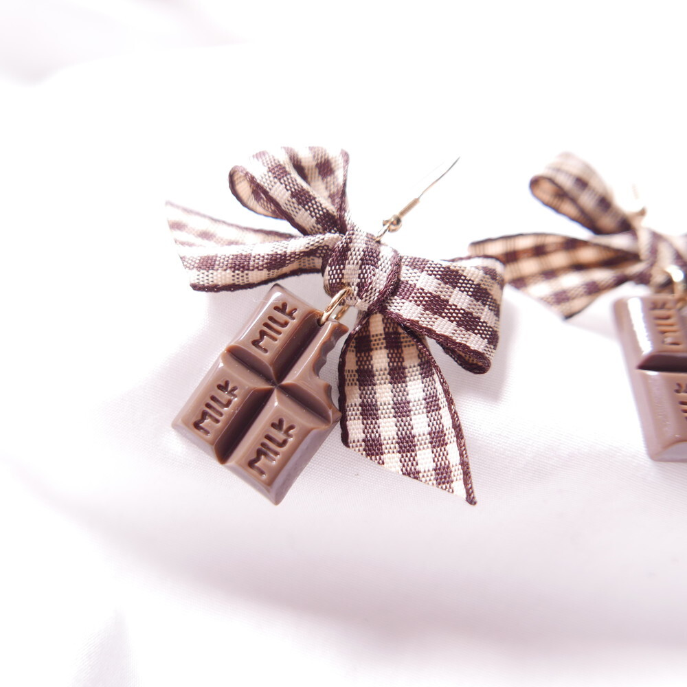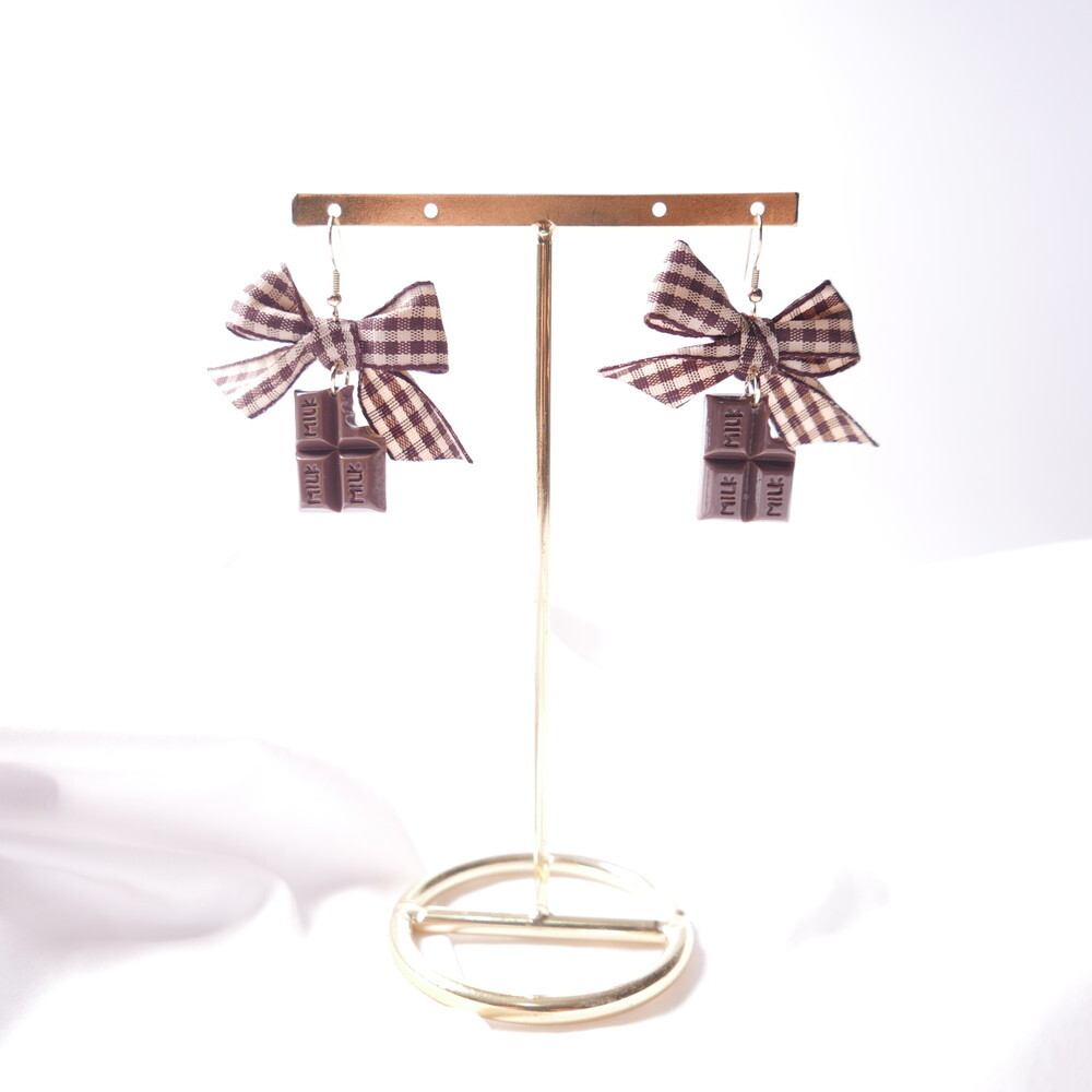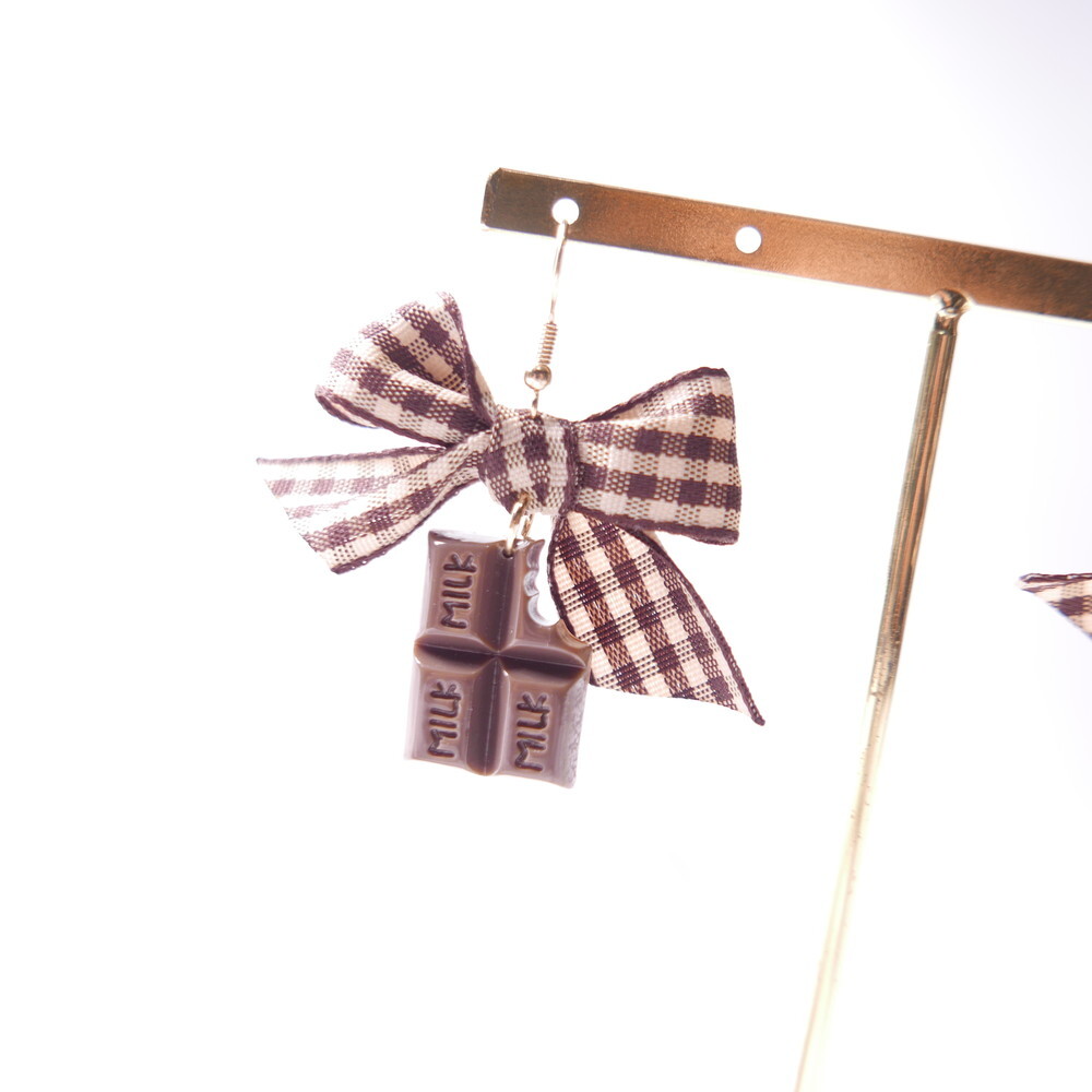 Indulge in cuteness with these Chocolate Earrings featuring adorable bite-sized chocolate bars hanging beneath a lovely gingham ribbon.