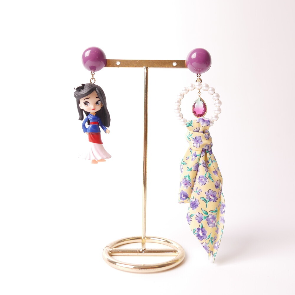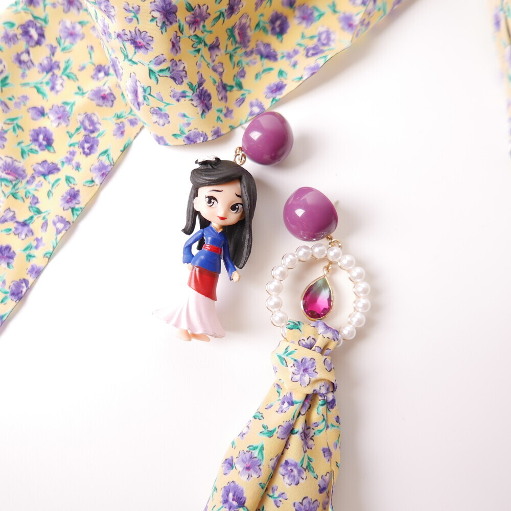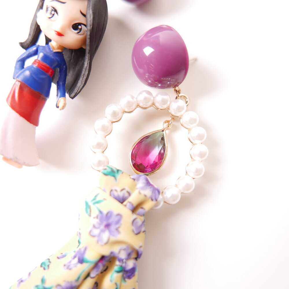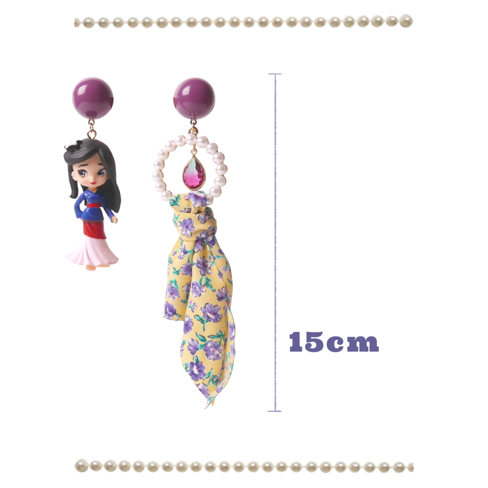 Celebrate bold elegance with our Mulan Bebe earrings! One side features a charming figure of Mulan in her iconic outfit, while the other boasts a floral-patterned scarf drop from a pearl loop with a pink gem accent. Lightweight yet statement-making, this asymmetrical pair blends whimsy with tradition for a uniquely stylish look.