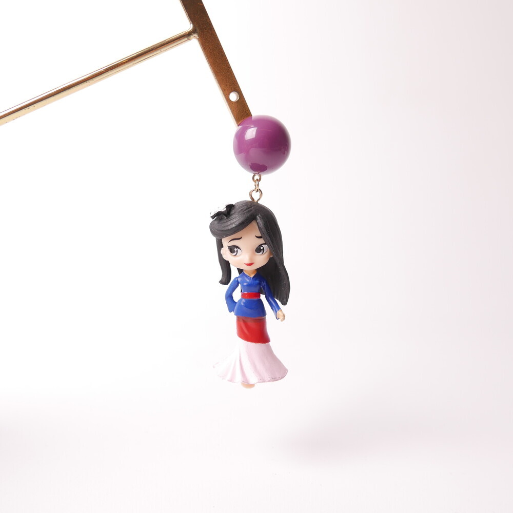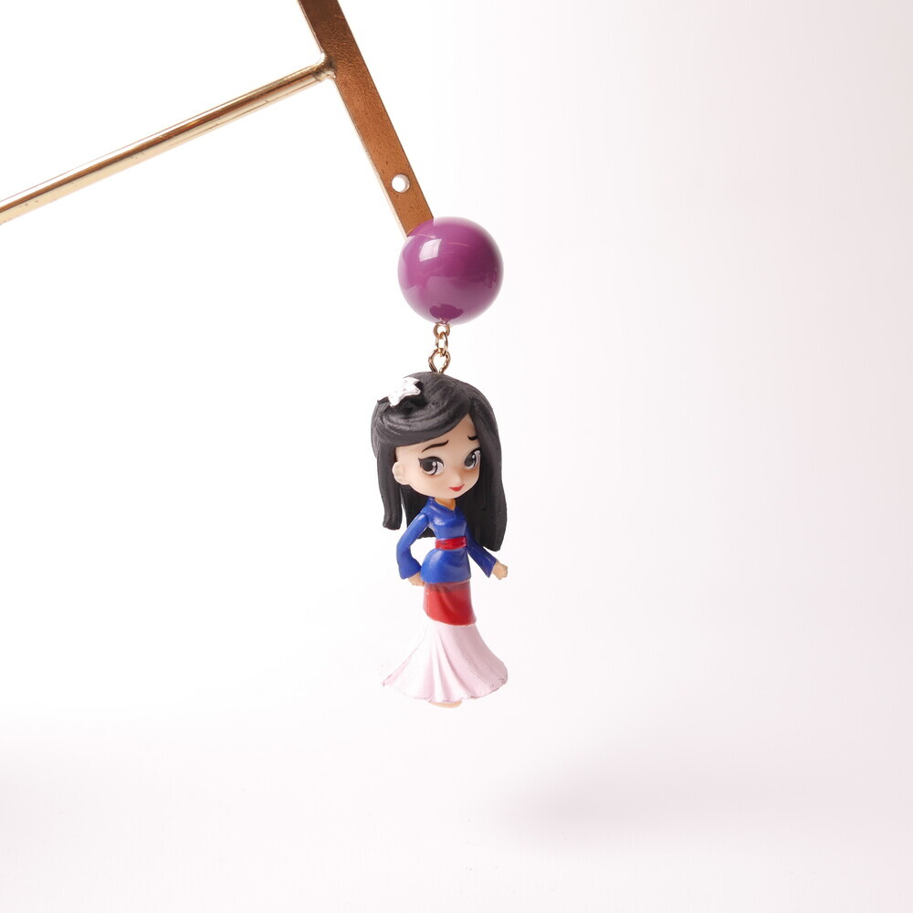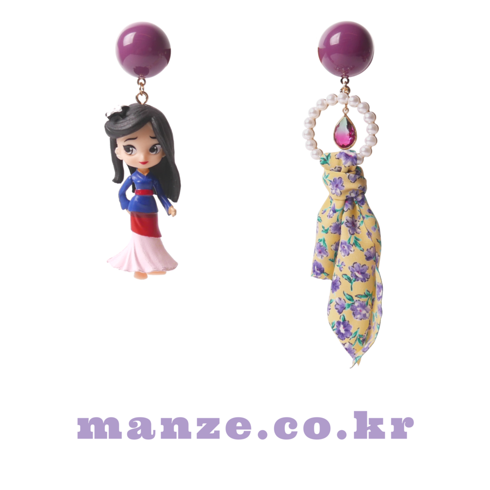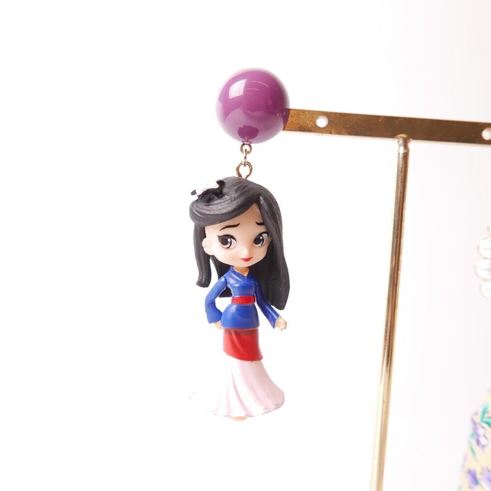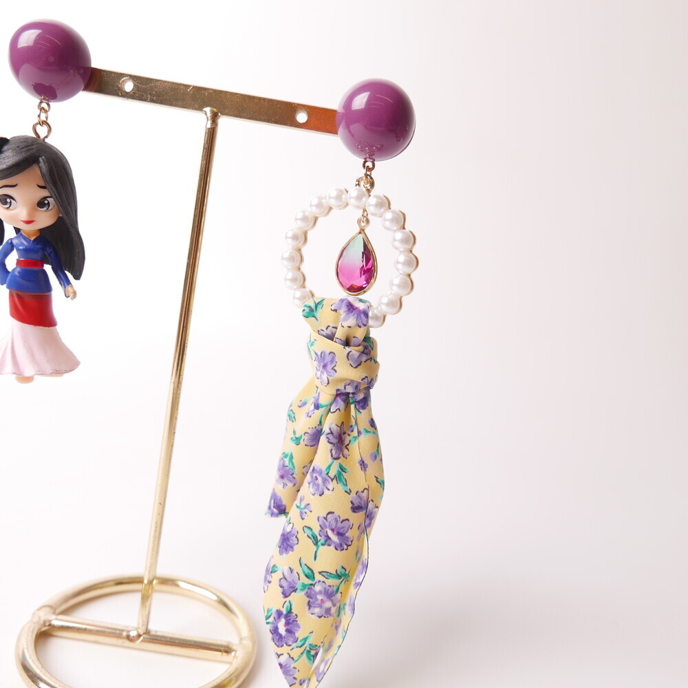 Celebrate bold elegance with our Mulan Bebe earrings! One side features a charming figure of Mulan in her iconic outfit, while the other boasts a floral-patterned scarf drop from a pearl loop with a pink gem accent. Lightweight yet statement-making, this asymmetrical pair blends whimsy with tradition for a uniquely stylish look.