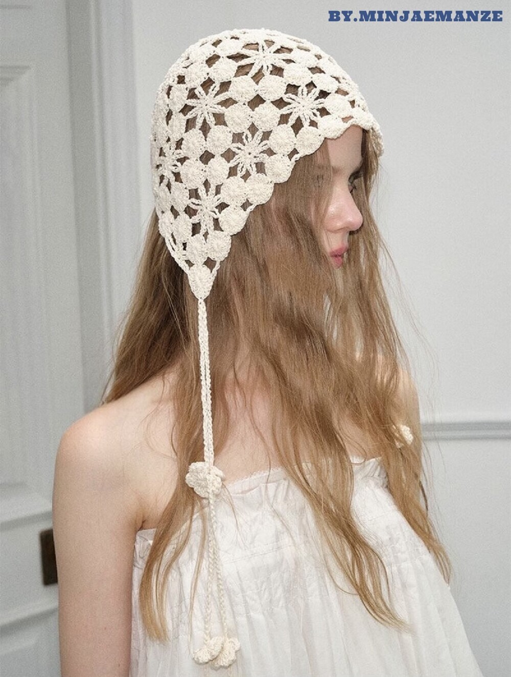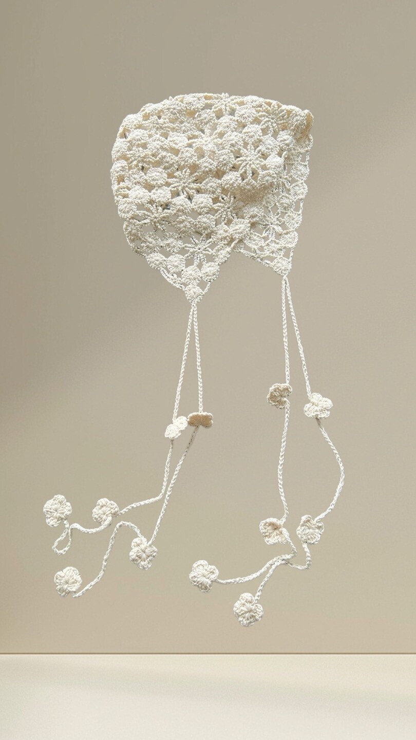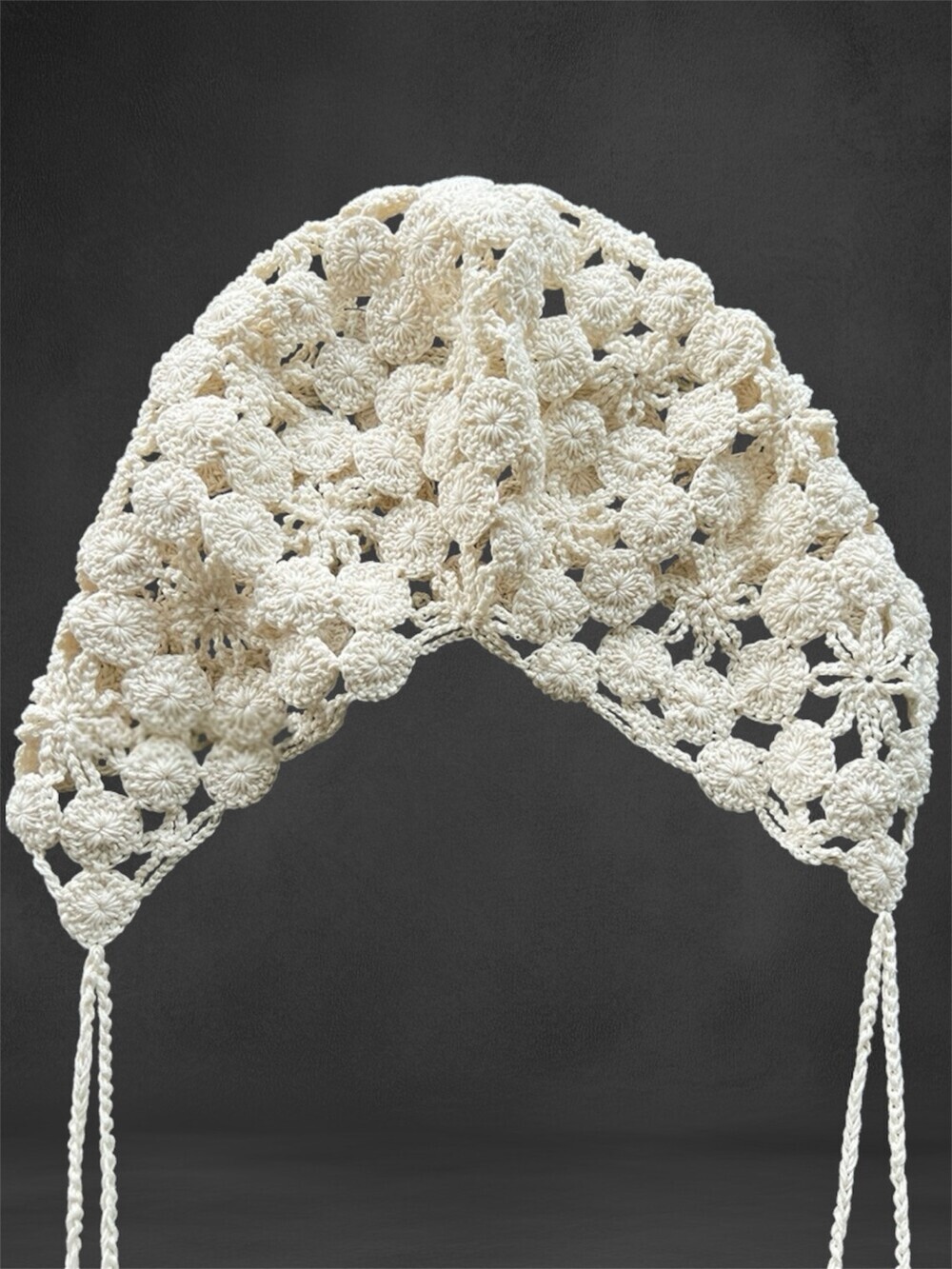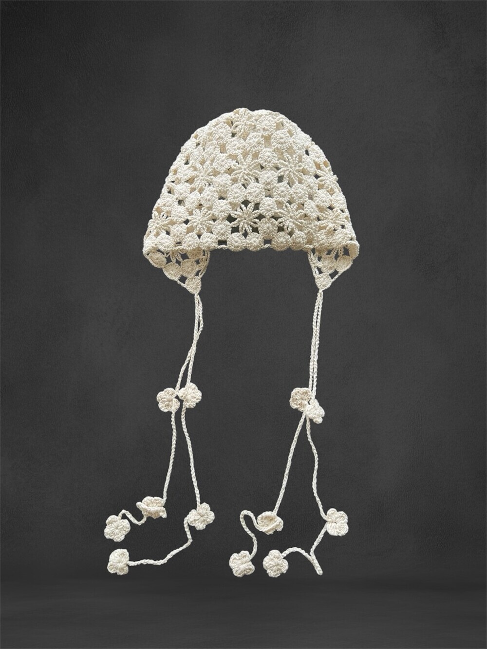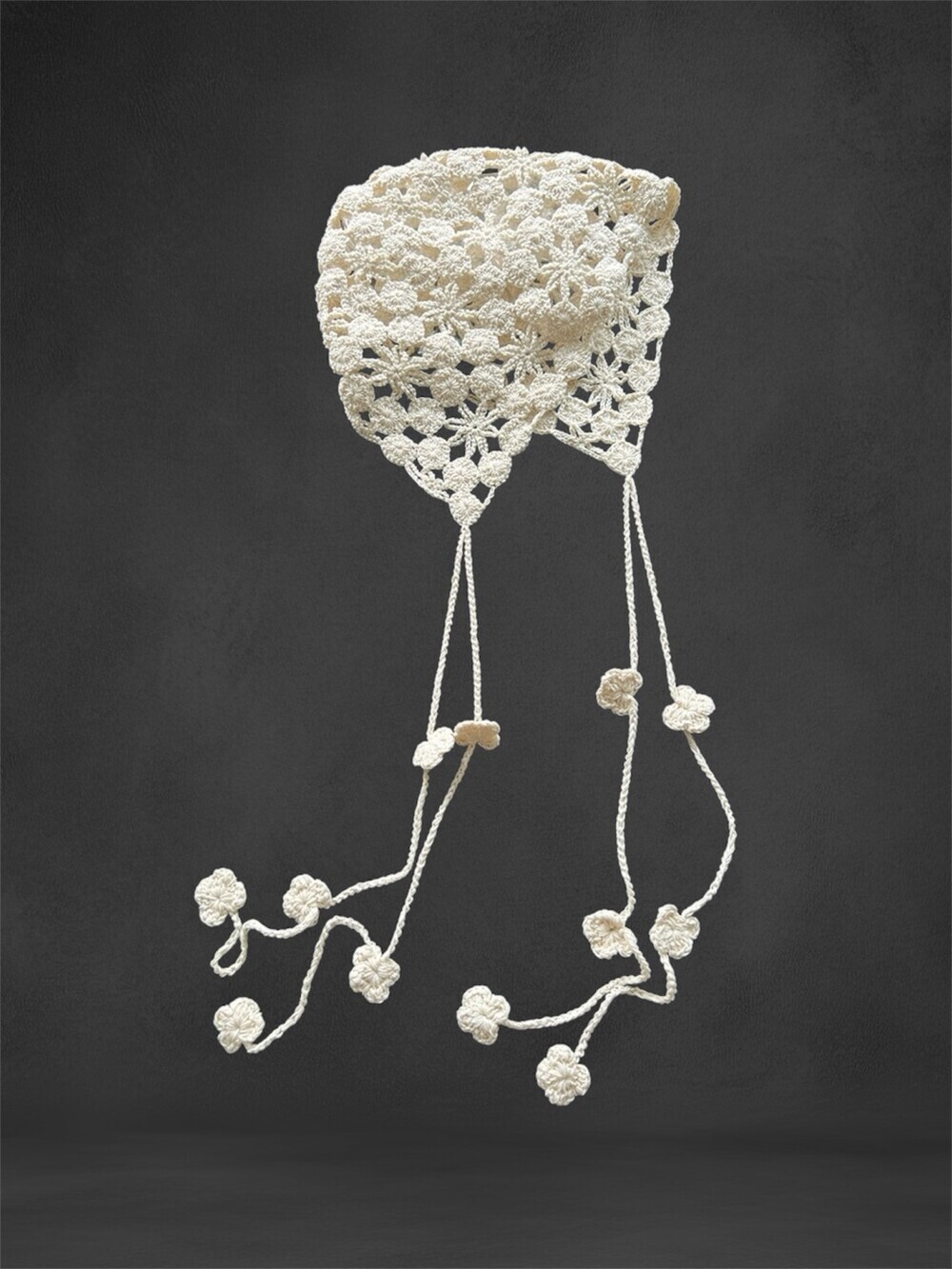 An ivory-colored lace knit bonnet designed with a delicate daisy pattern and extra-long braided ties adorned with tiny crocheted flowers.