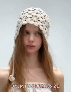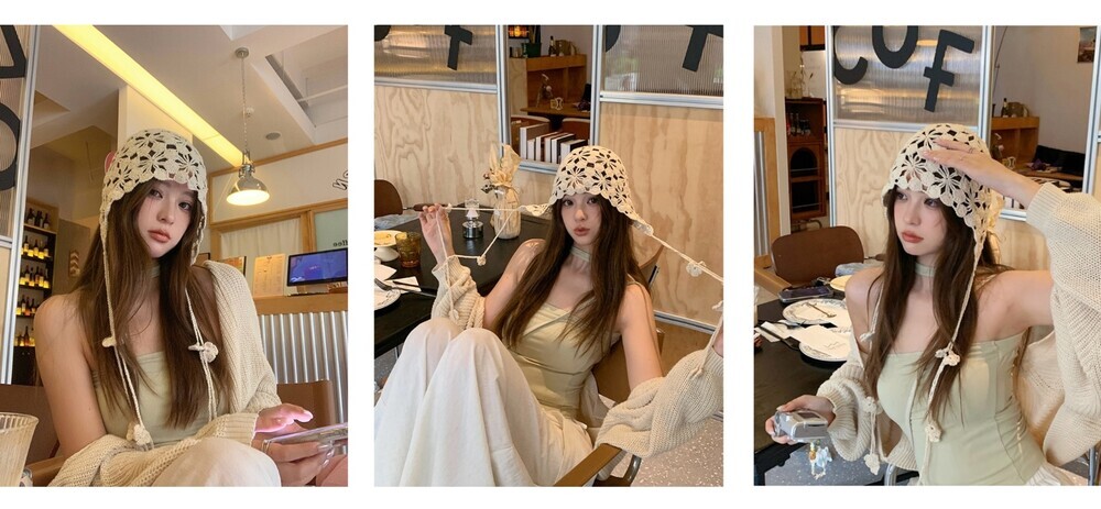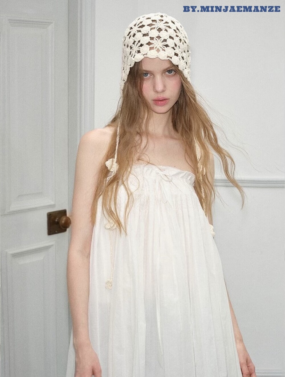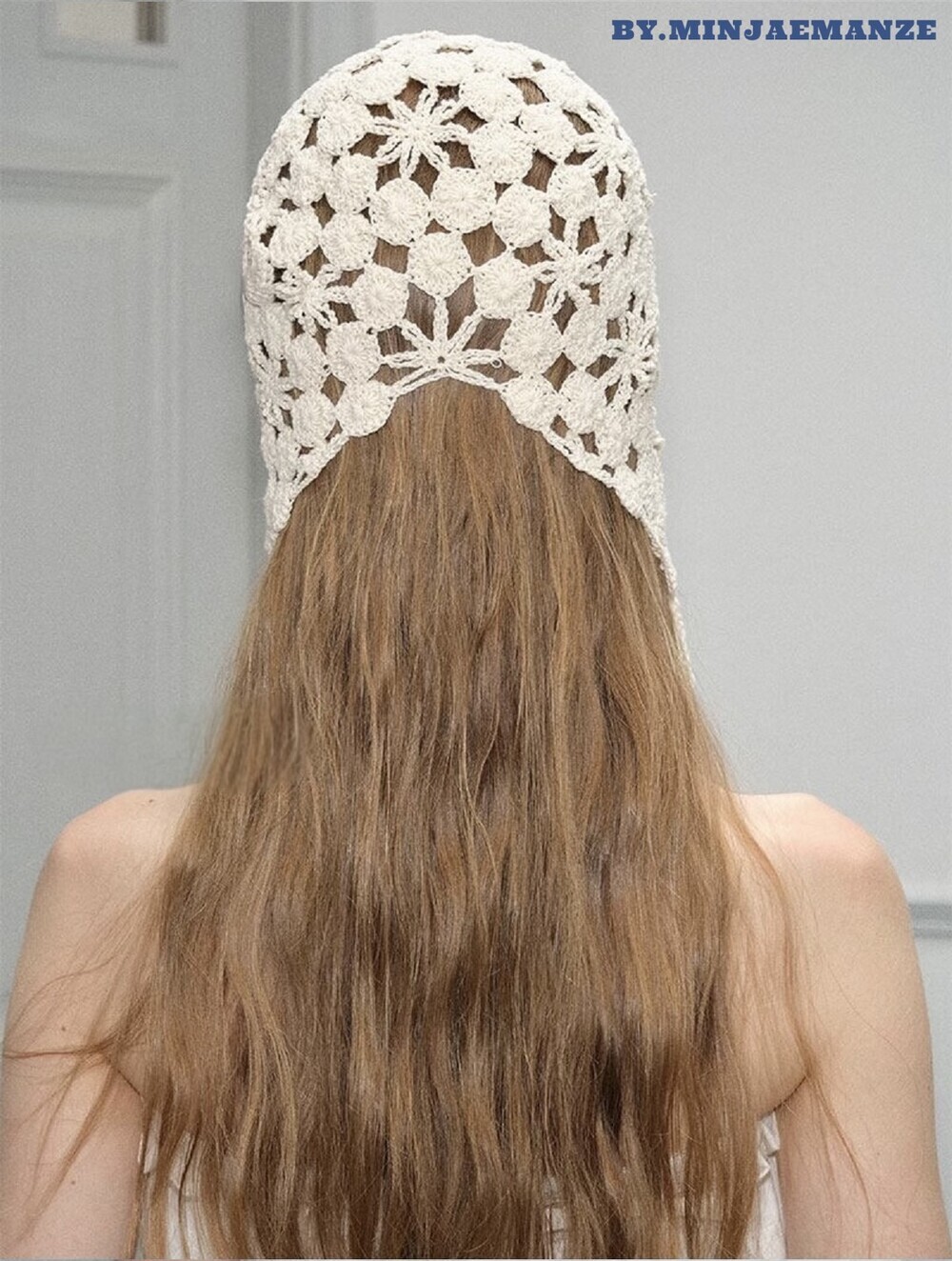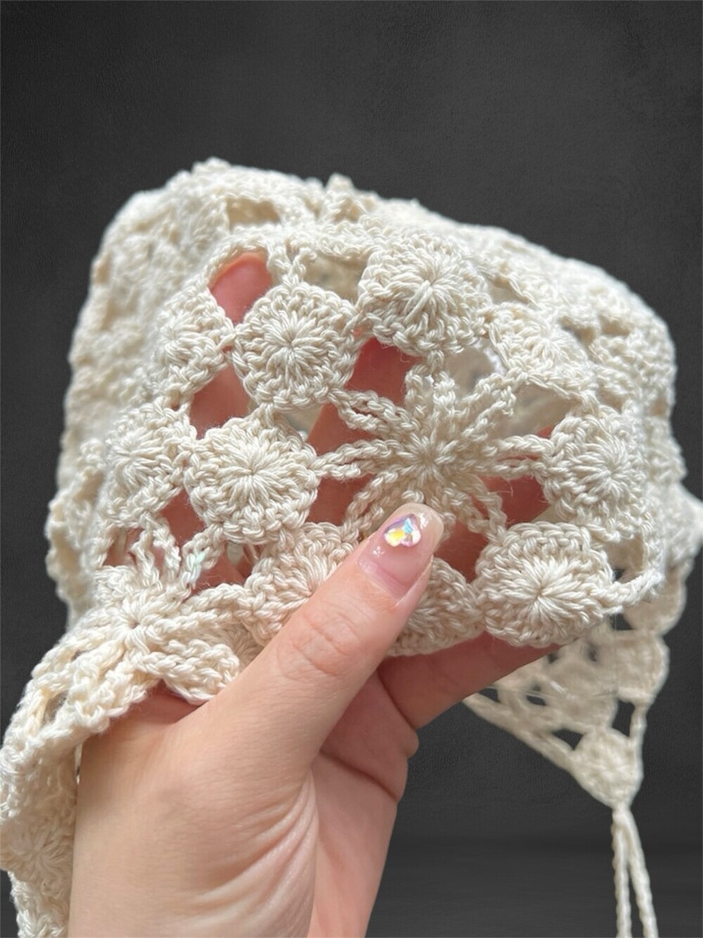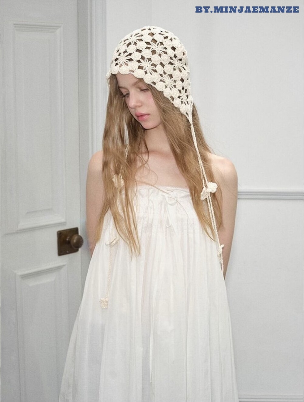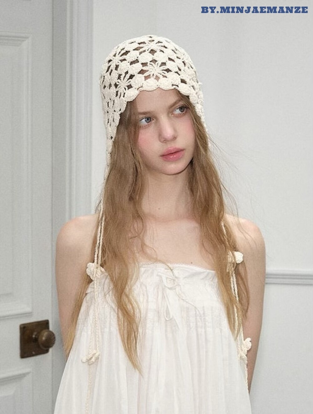 An ivory-colored lace knit bonnet designed with a delicate daisy pattern and extra-long braided ties adorned with tiny crocheted flowers.