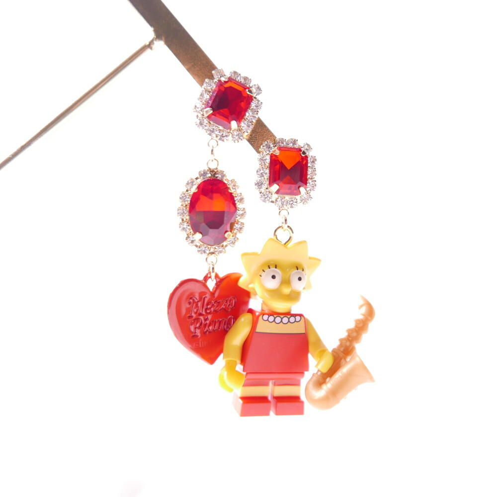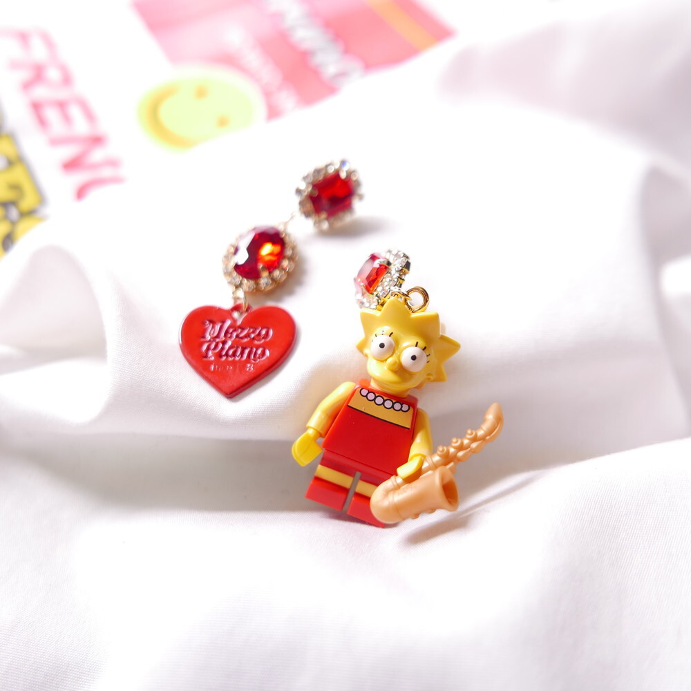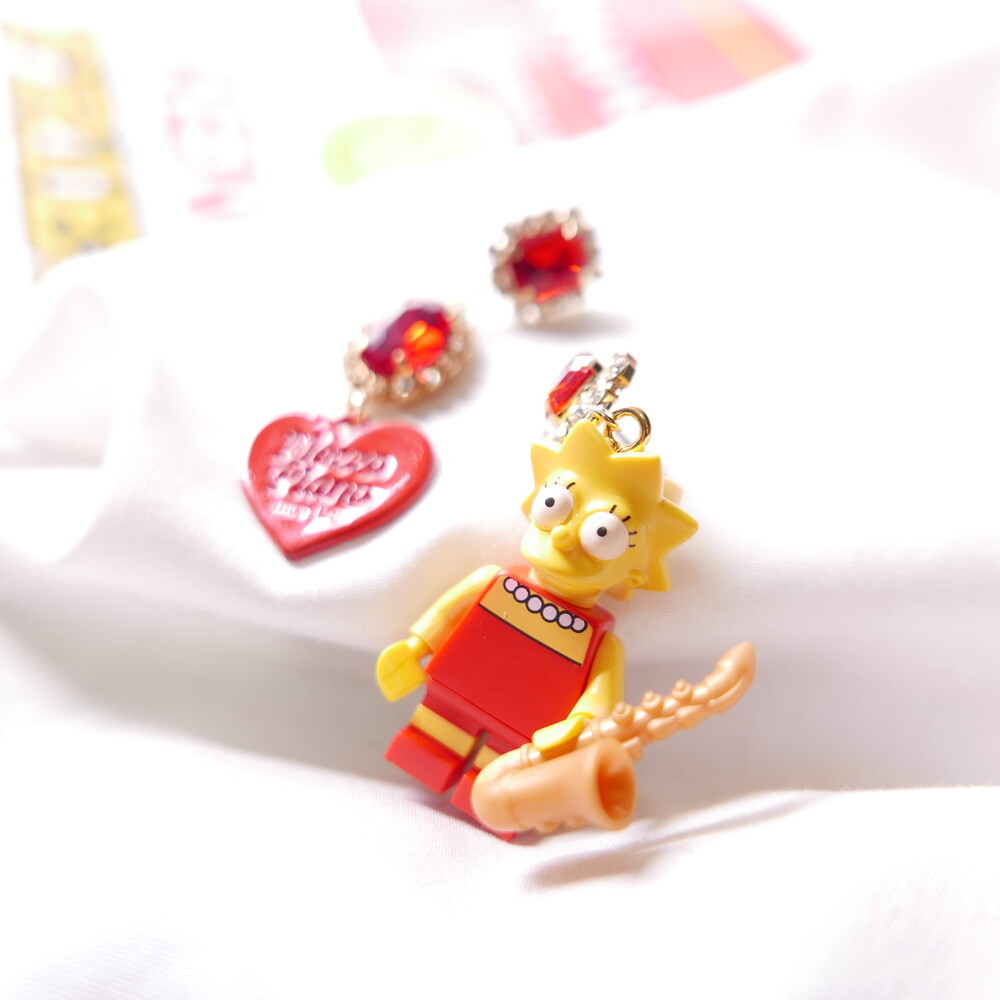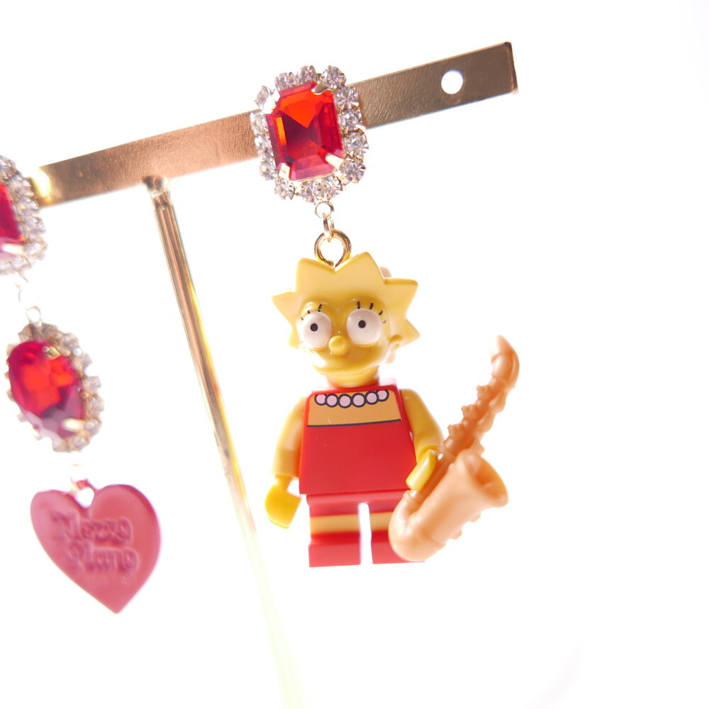 A quirky and colorful tribute to Lisa Simpson, styled in her classic red dress and pearls—complete with her tiny trumpet in hand.