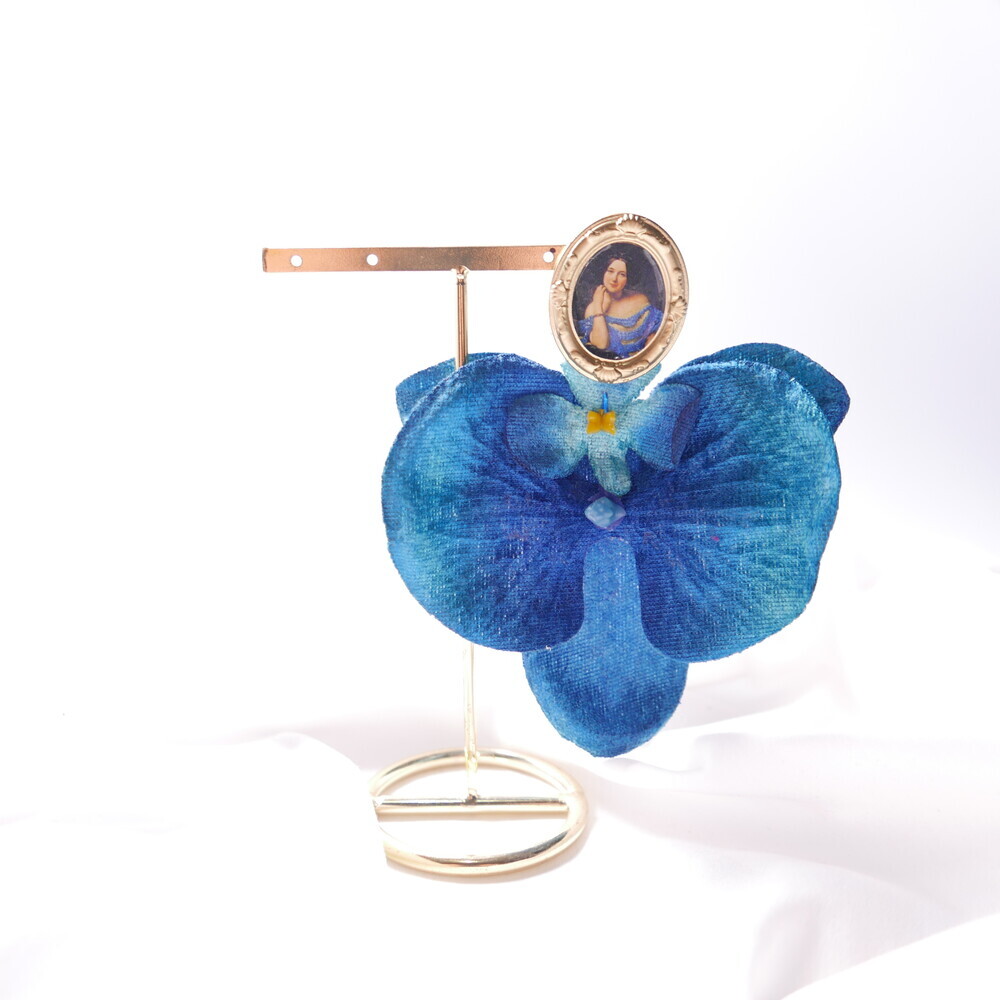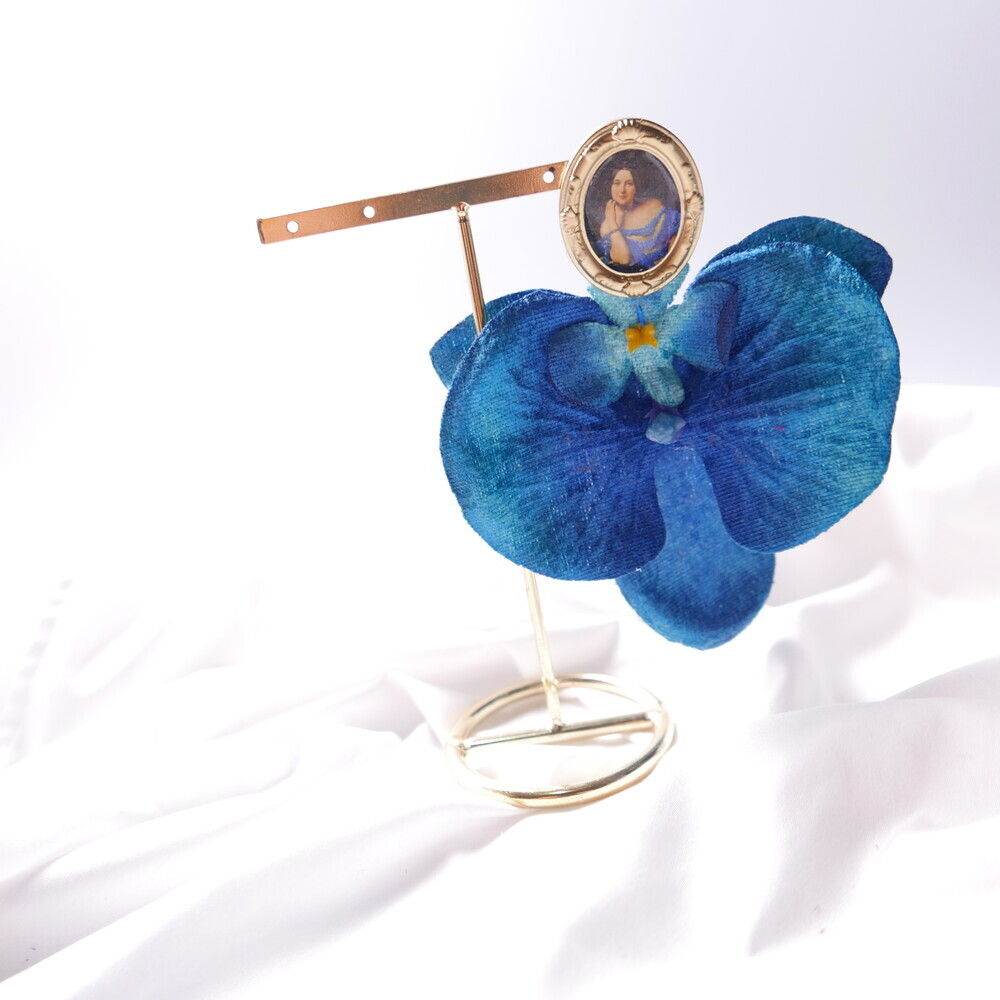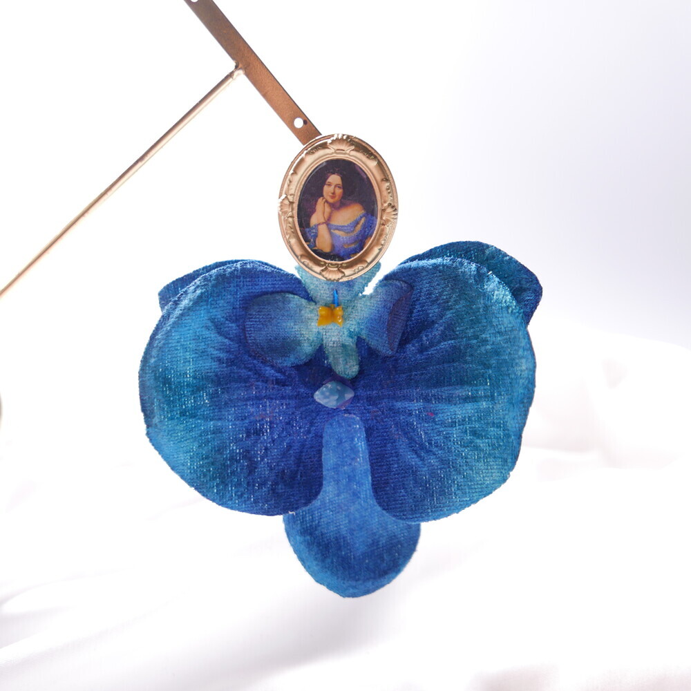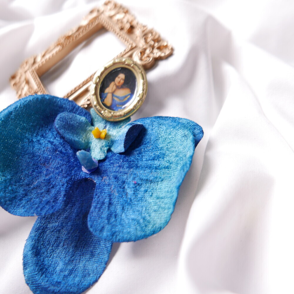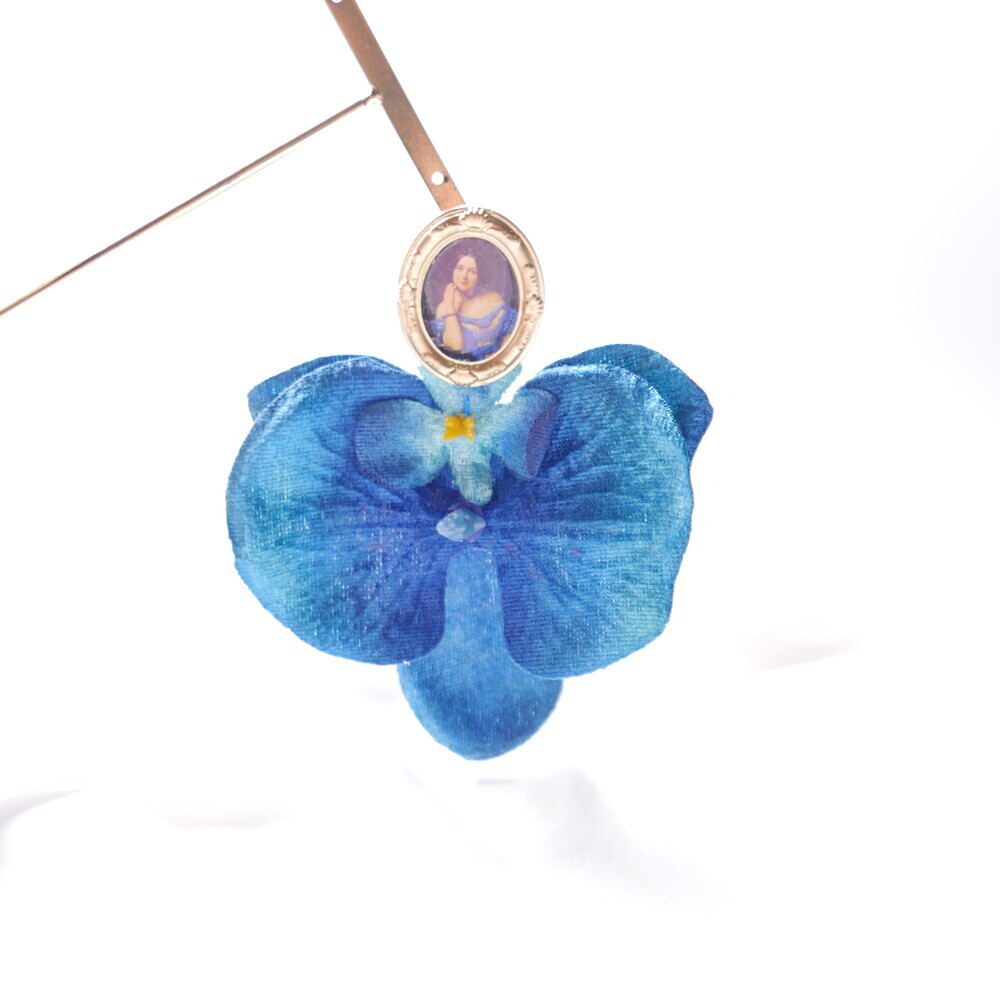 This statement single earring features a dramatic bloom in deep blue, suspended from a vintage-style portrait frame. The oversized flower is bold yet lightweight, creating a striking visual impact with effortless comfort.