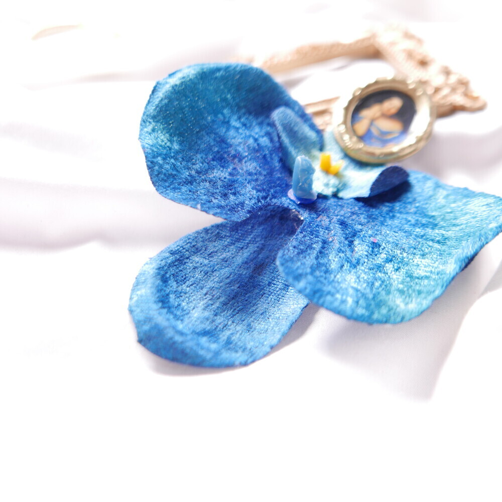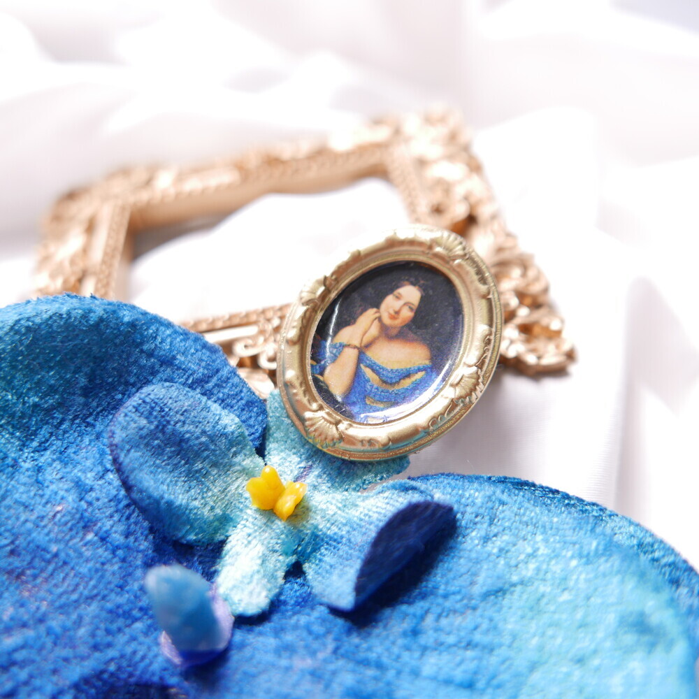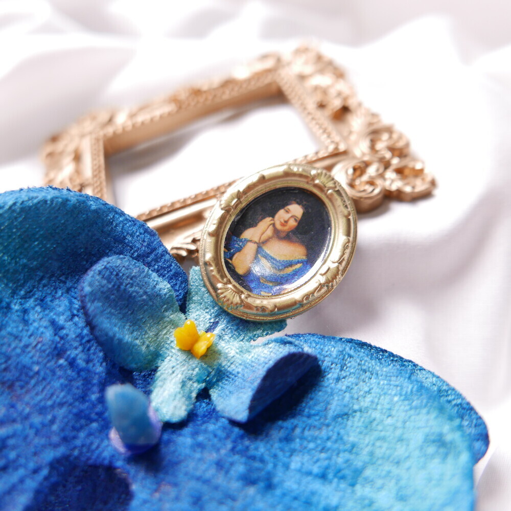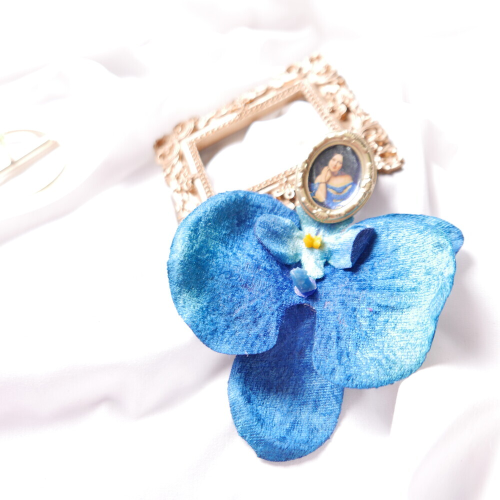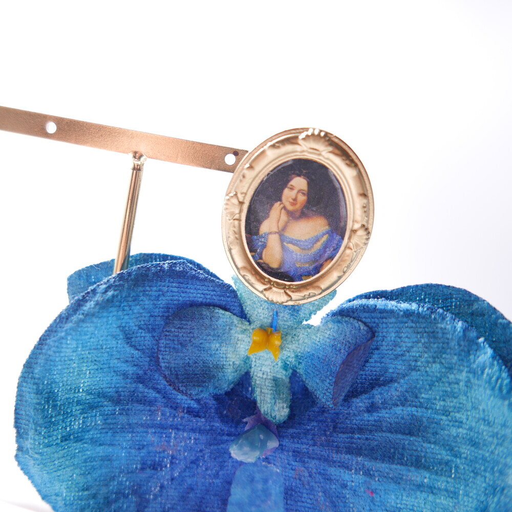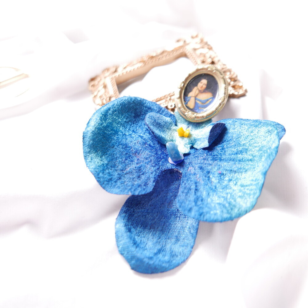 This statement single earring features a dramatic bloom in deep blue, suspended from a vintage-style portrait frame. The oversized flower is bold yet lightweight, creating a striking visual impact with effortless comfort.