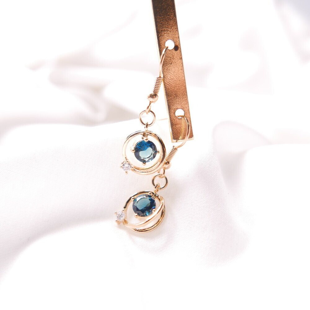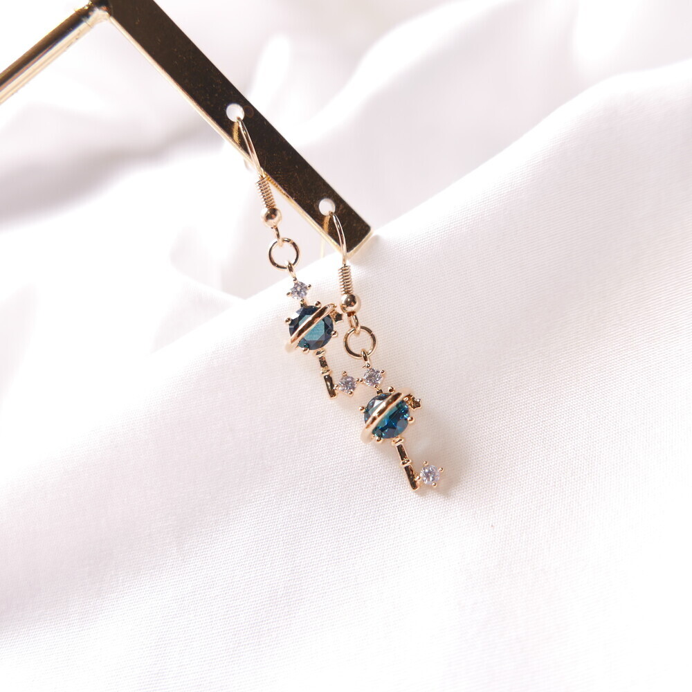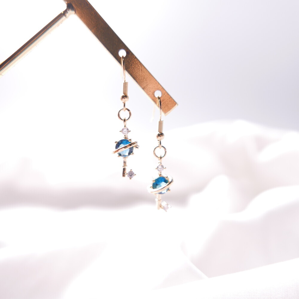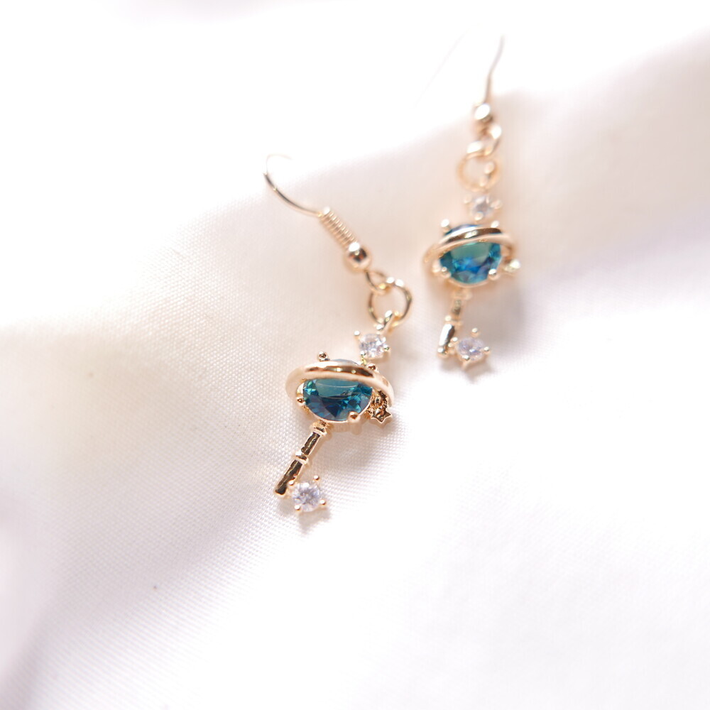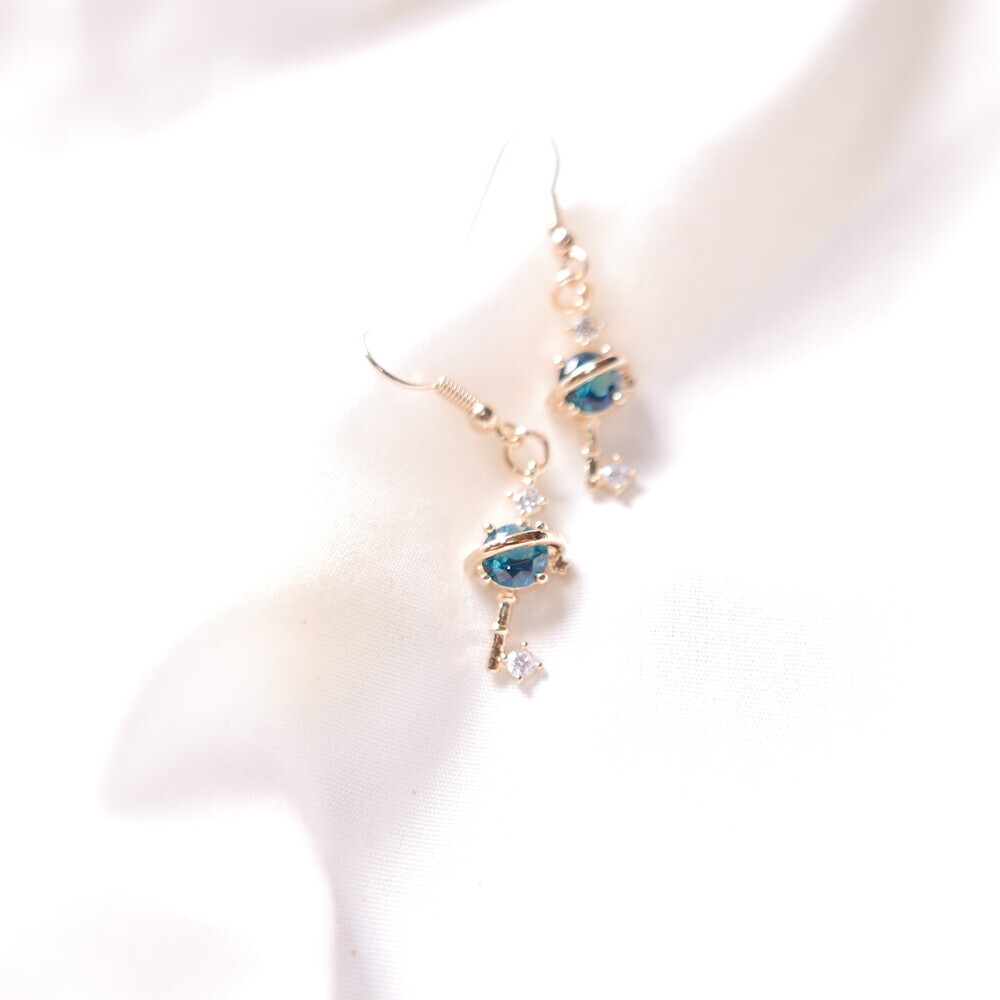 A pair of celestial earrings inspired by cosmic elements—gold accents meet translucent blue gems to create an ethereal look. From the sparkling charm of “Aurora” to the mystic energy of “Key of Spacetime,” this series adds a magical touch to any outfit. Available in multiple variations including clip-ons and silver post options.