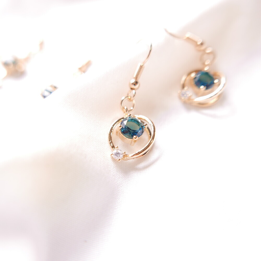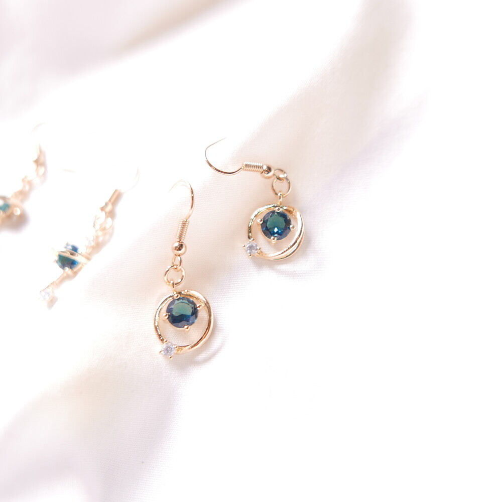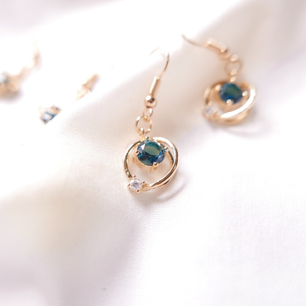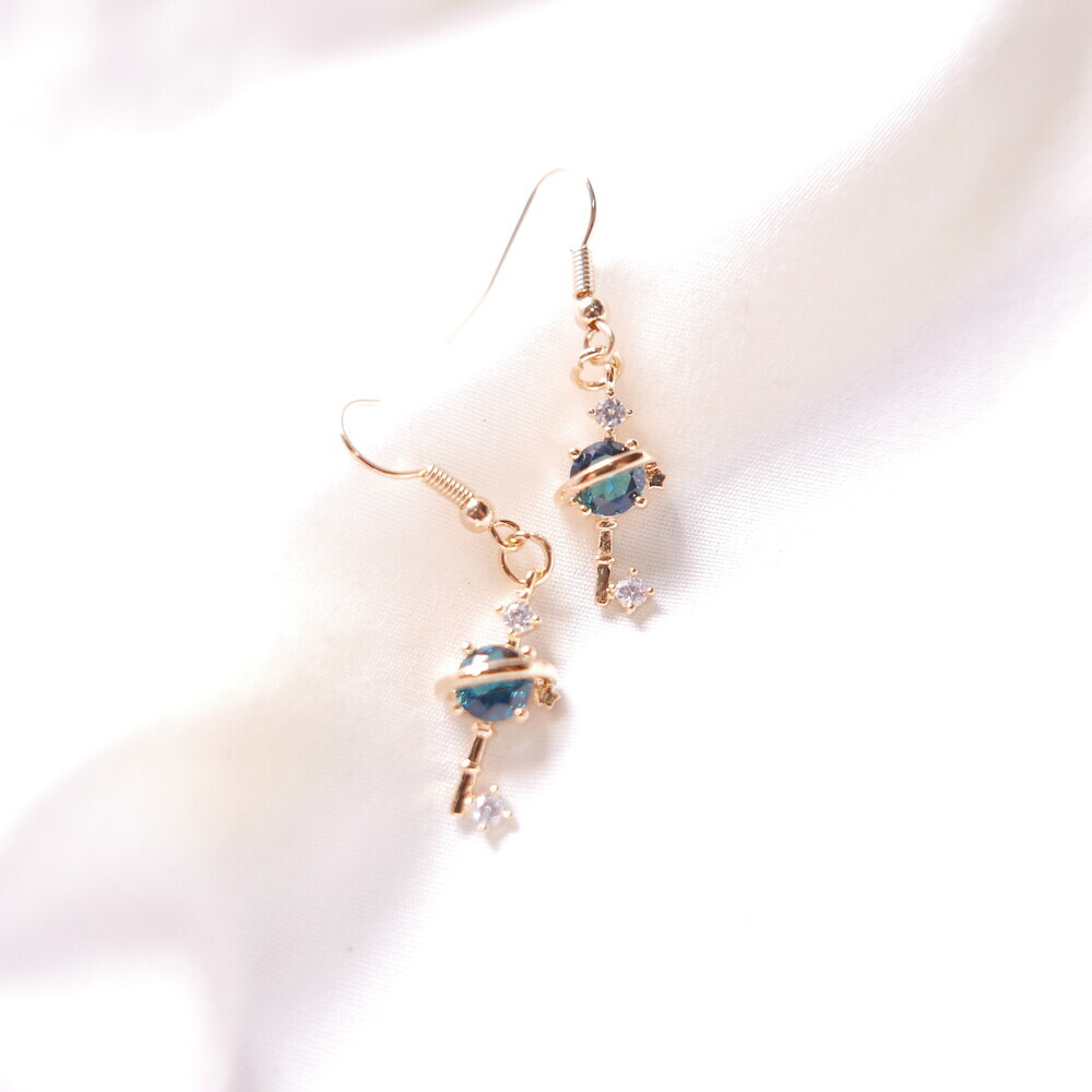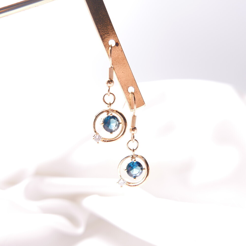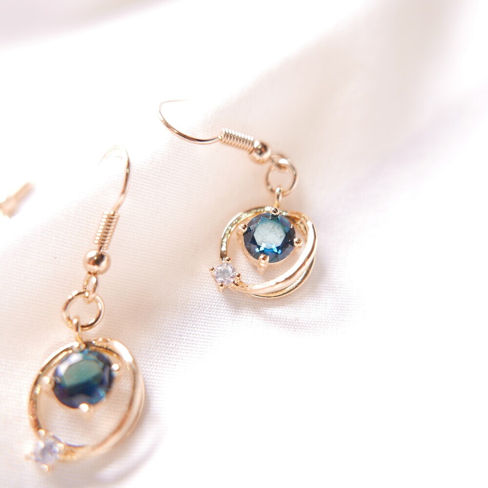 A pair of celestial earrings inspired by cosmic elements—gold accents meet translucent blue gems to create an ethereal look. From the sparkling charm of “Aurora” to the mystic energy of “Key of Spacetime,” this series adds a magical touch to any outfit. Available in multiple variations including clip-ons and silver post options.