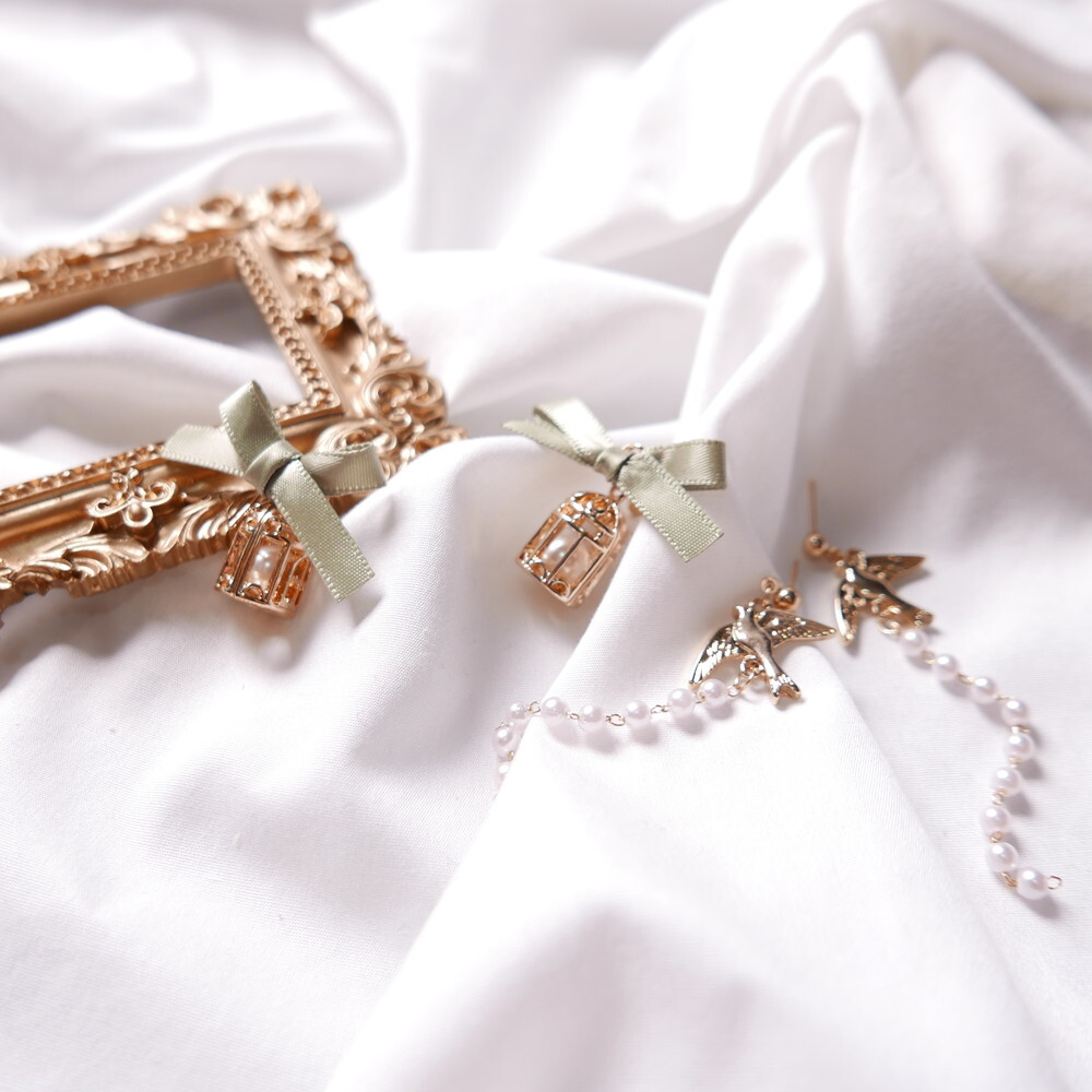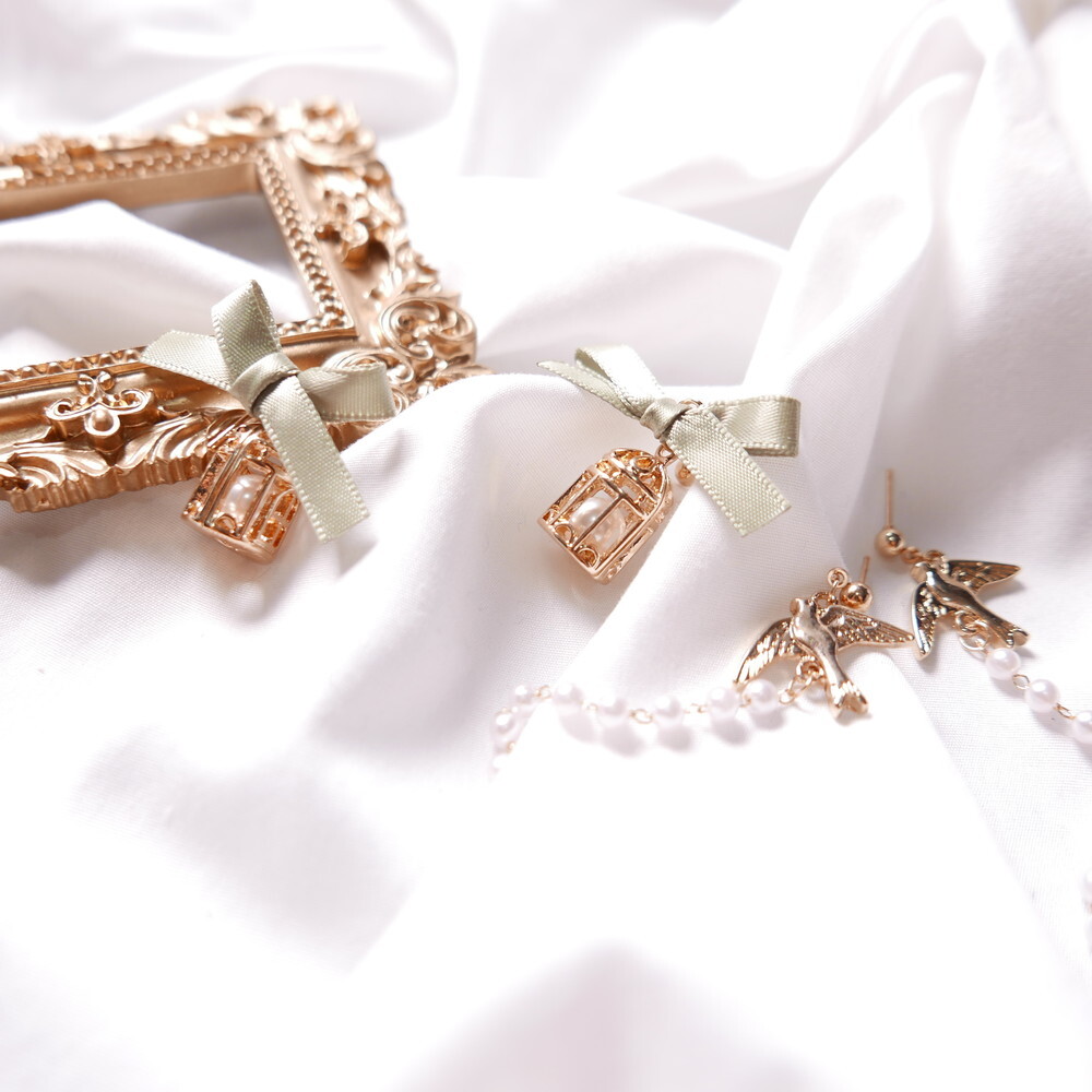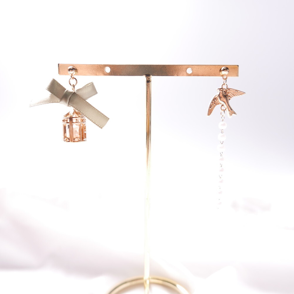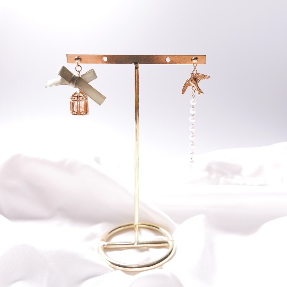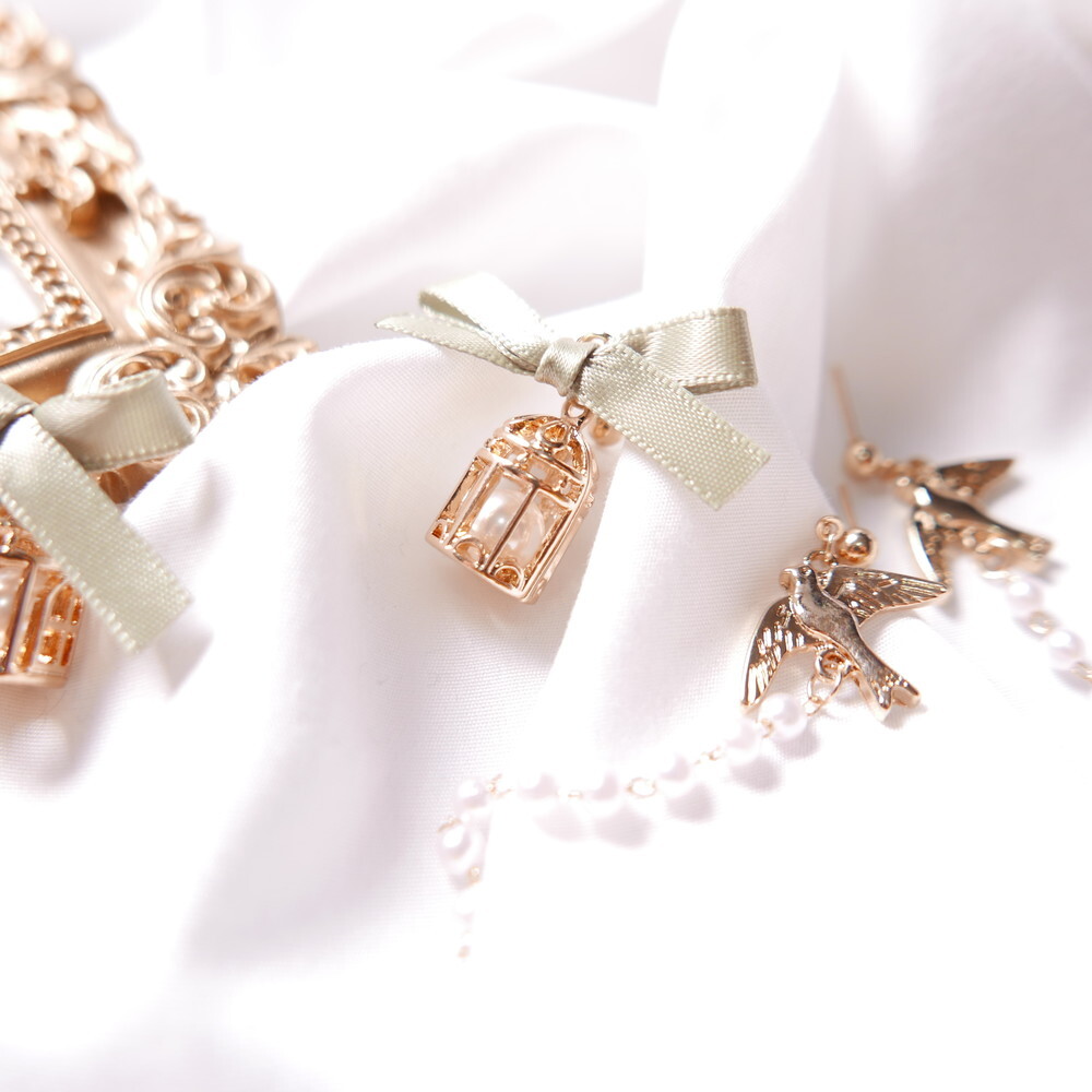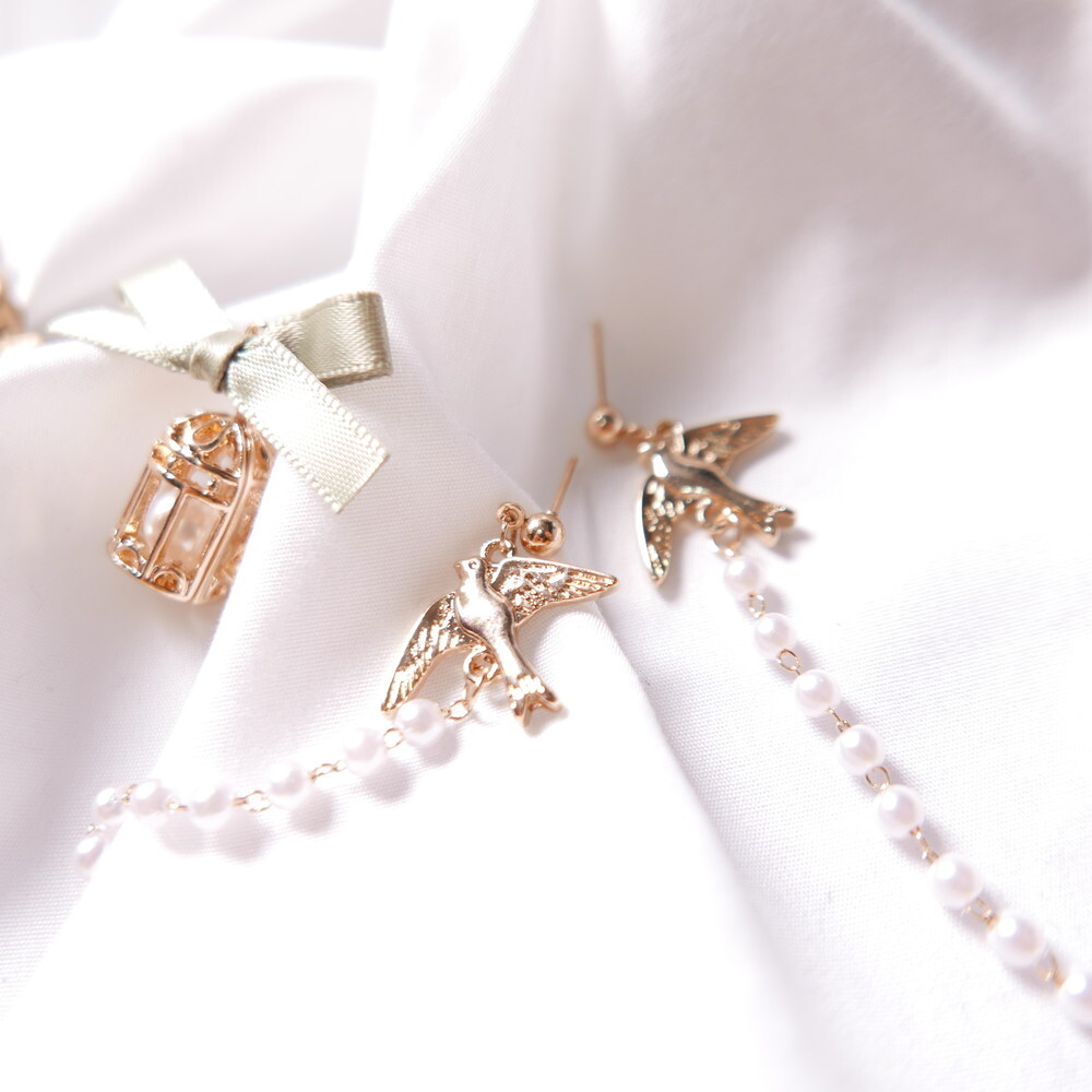 A charming asymmetric pair inspired by whimsical dreams and delicate freedom. One side features a miniature golden birdcage with a soft olive ribbon, while the other side shows a flying bird with cascading pearls. The soft contrast and playful imbalance of the two pieces evoke the feeling of a daydream.