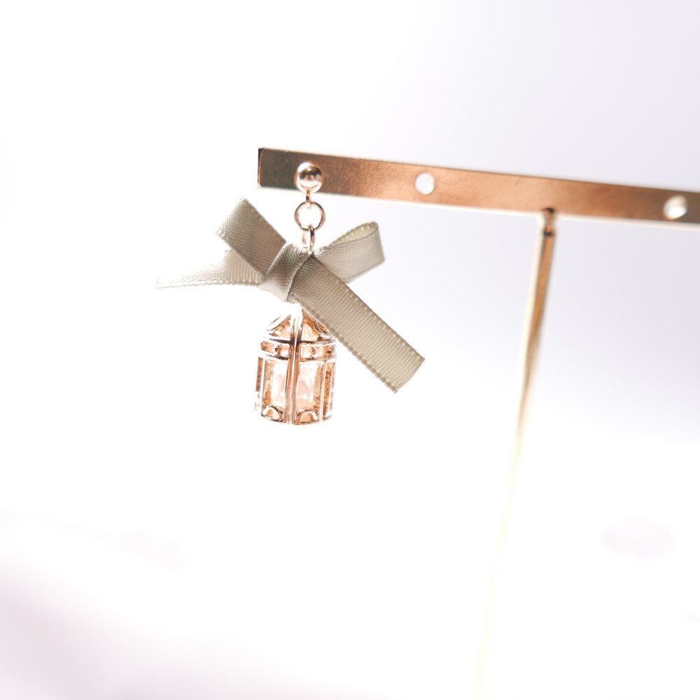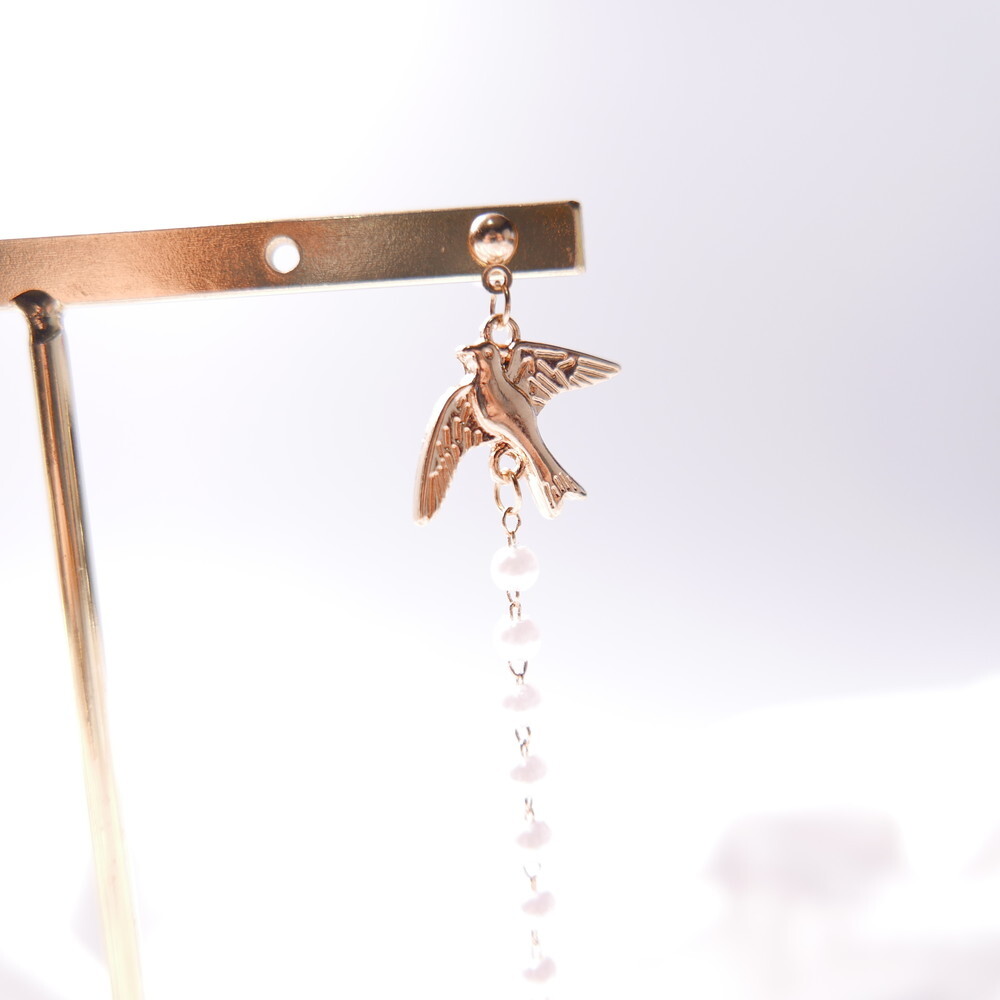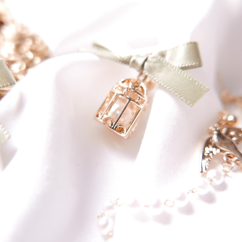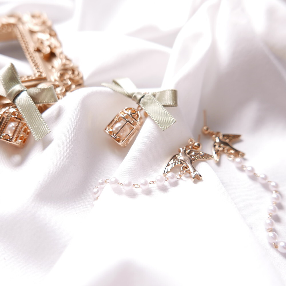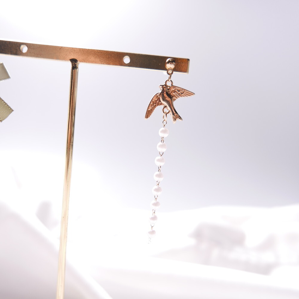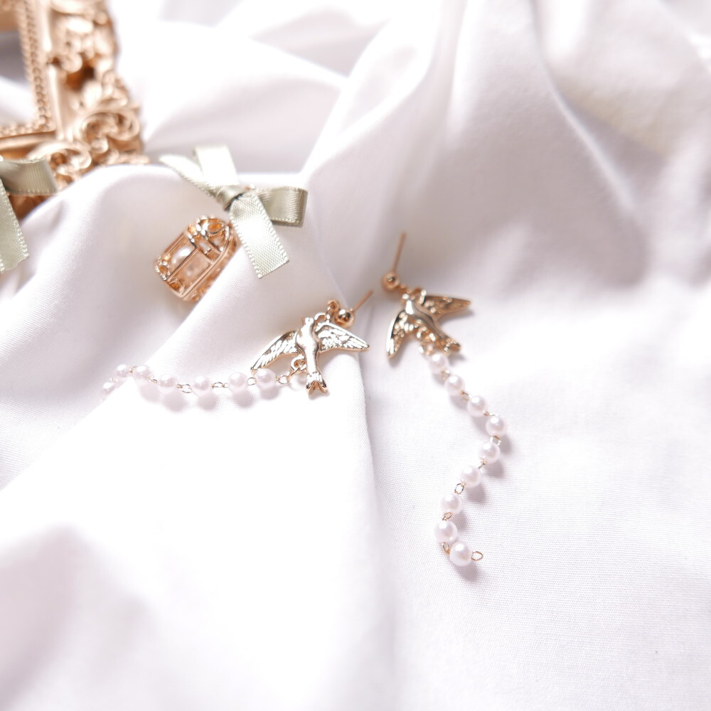 A charming asymmetric pair inspired by whimsical dreams and delicate freedom. One side features a miniature golden birdcage with a soft olive ribbon, while the other side shows a flying bird with cascading pearls. The soft contrast and playful imbalance of the two pieces evoke the feeling of a daydream.