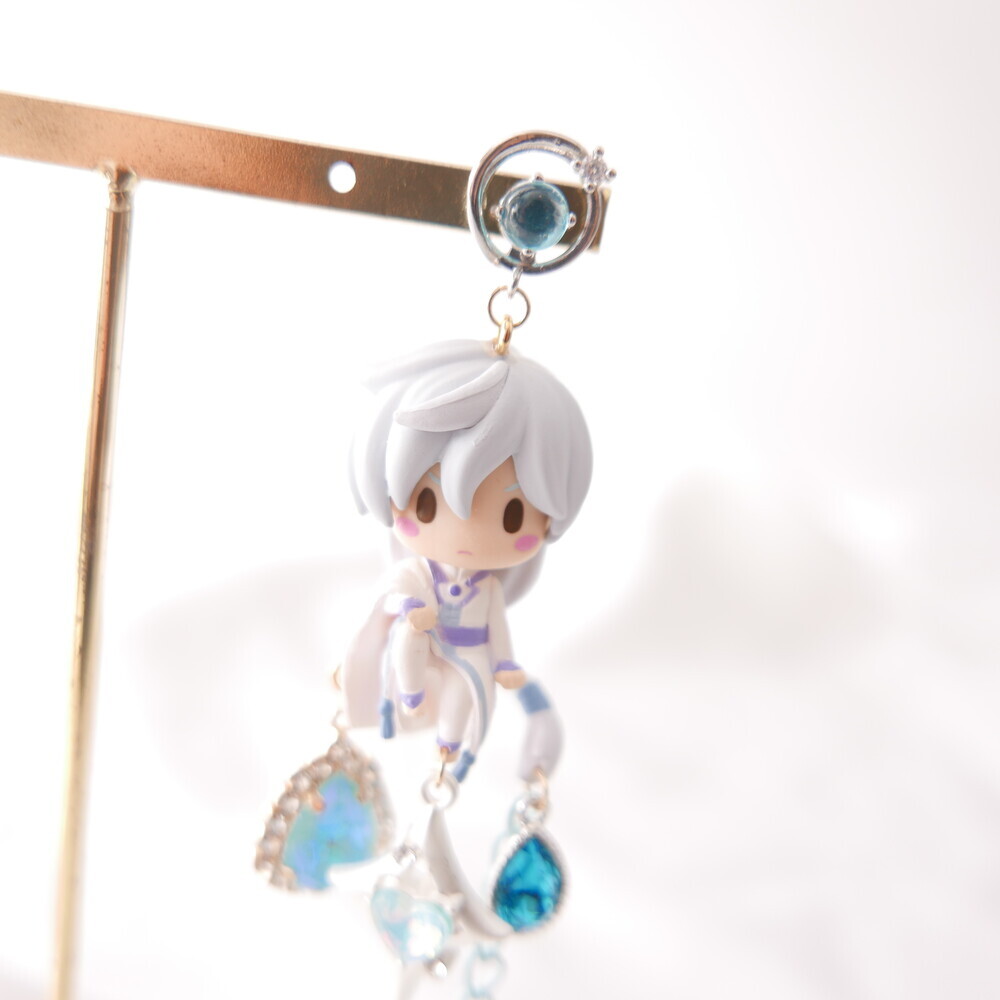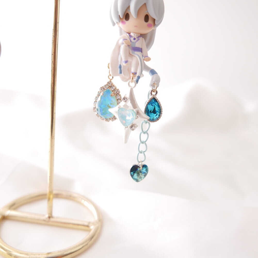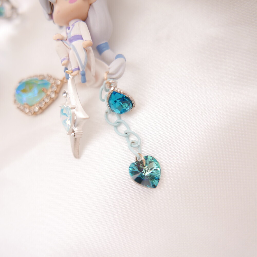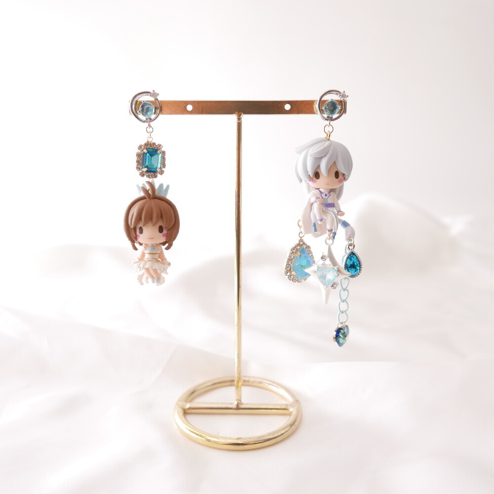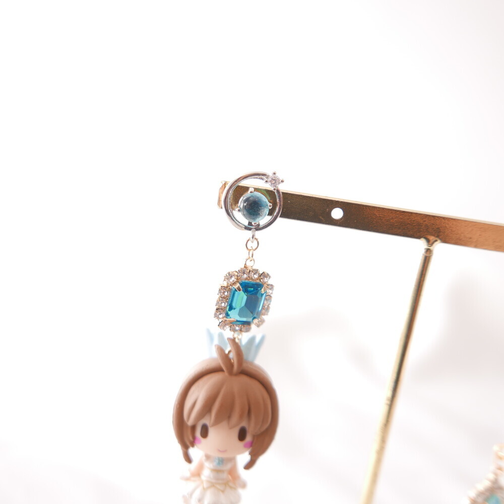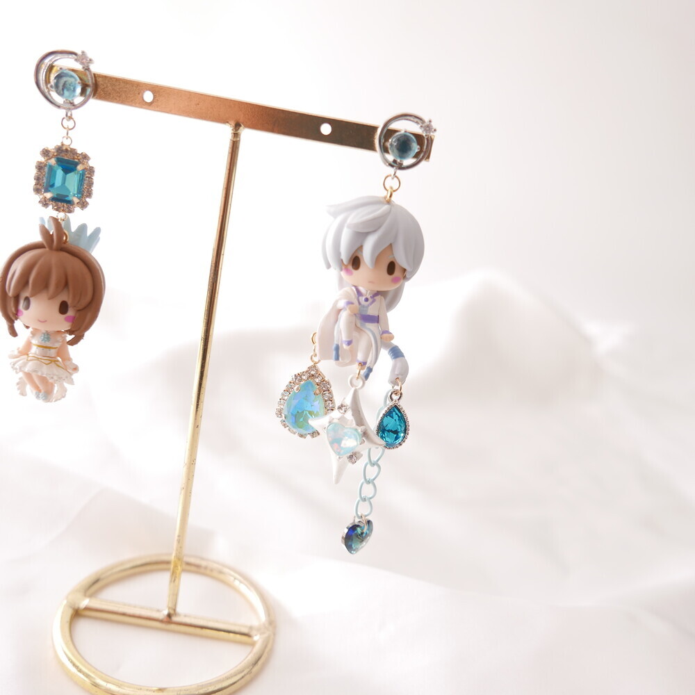 💫 A tale of moonlight and magic. Featuring Sakura and Yue from Cardcaptor Sakura, these asymmetric earrings are adorned with shimmering blue gems, celestial details, and character charms. A graceful tribute to the guardian of the Moon and the magical trials that follow.