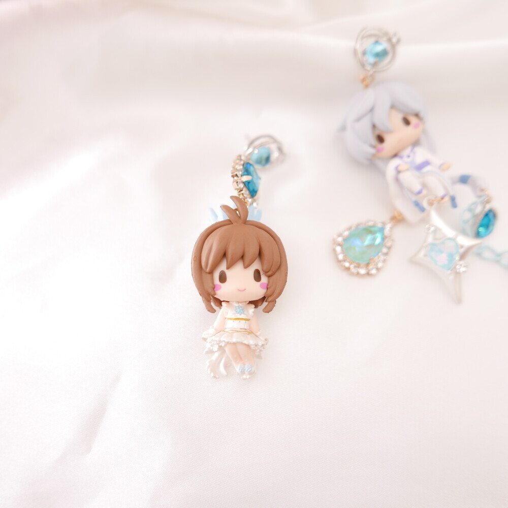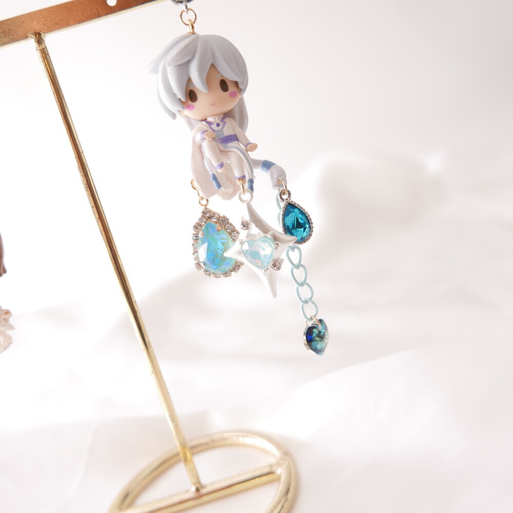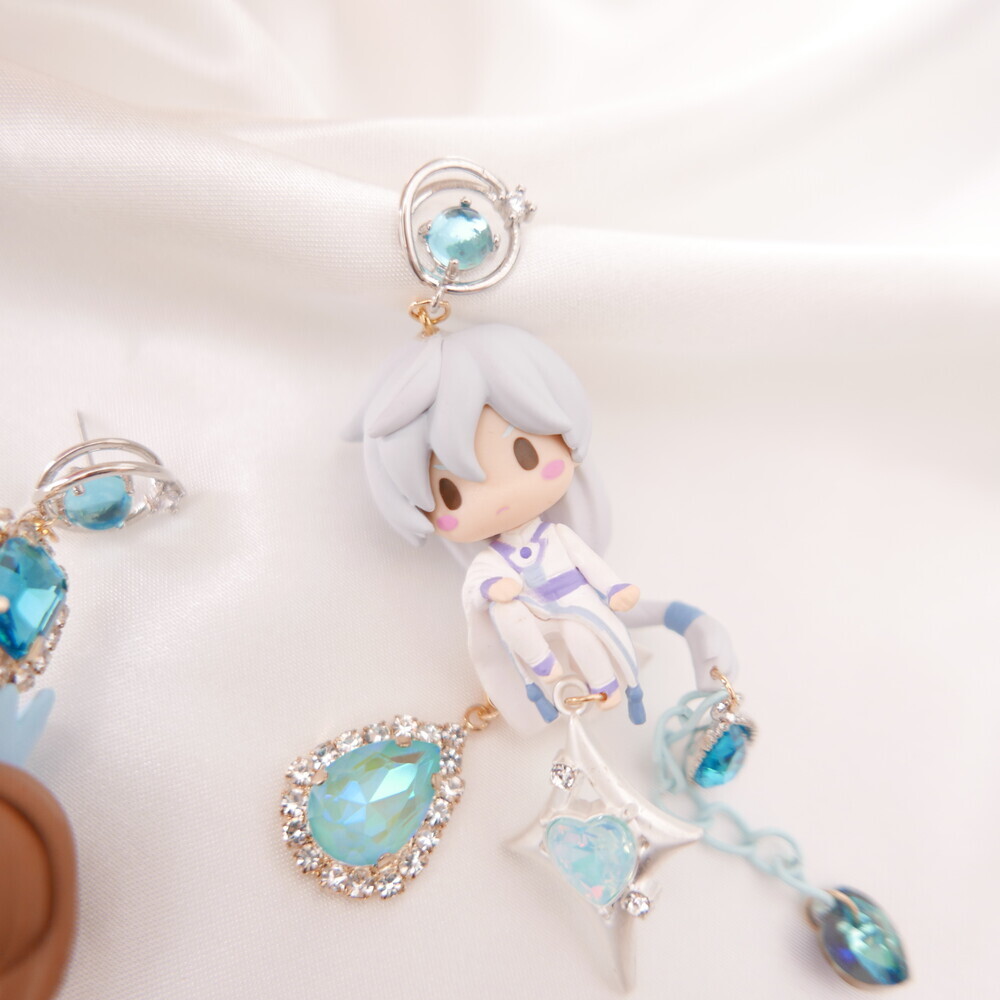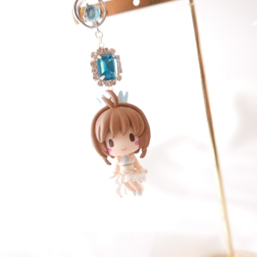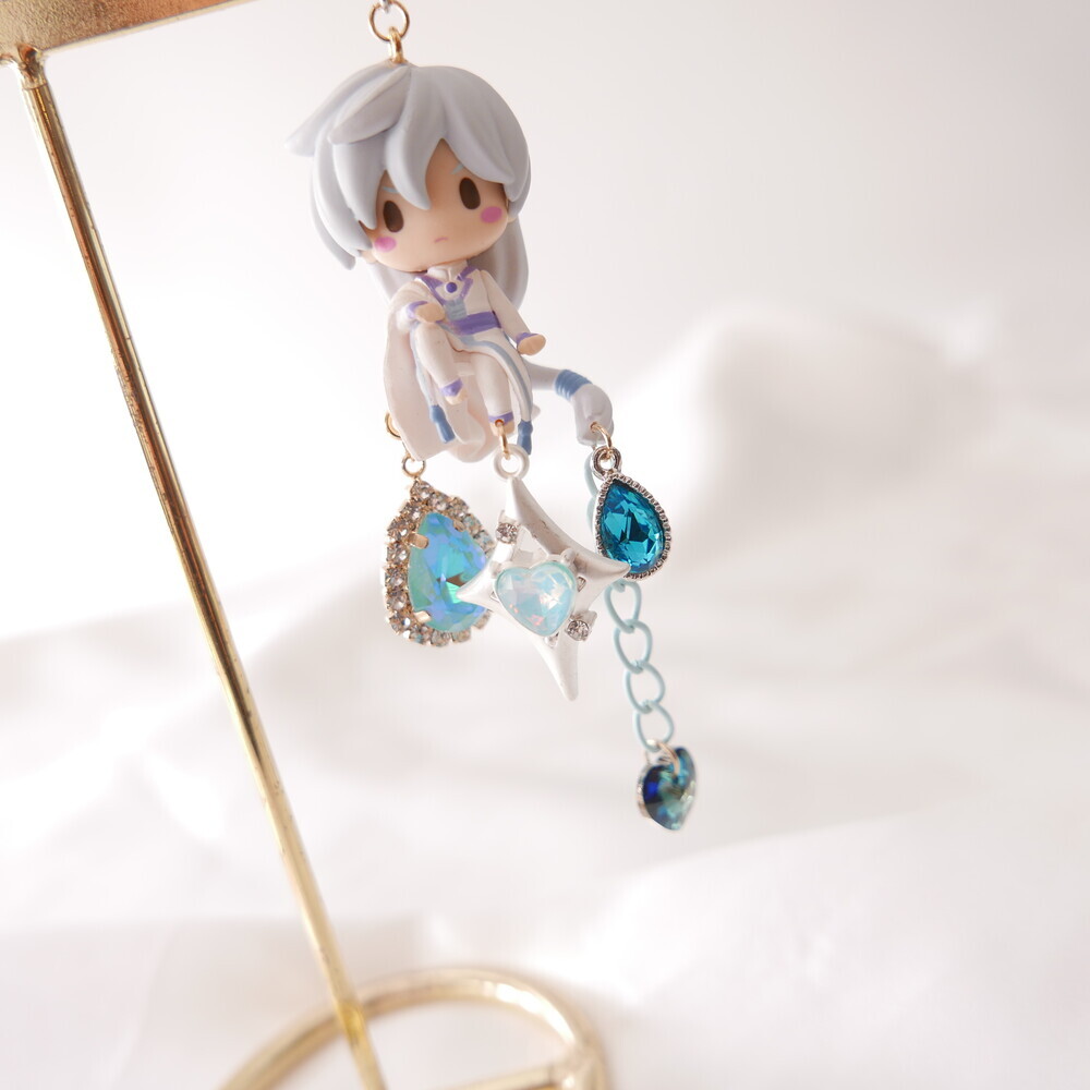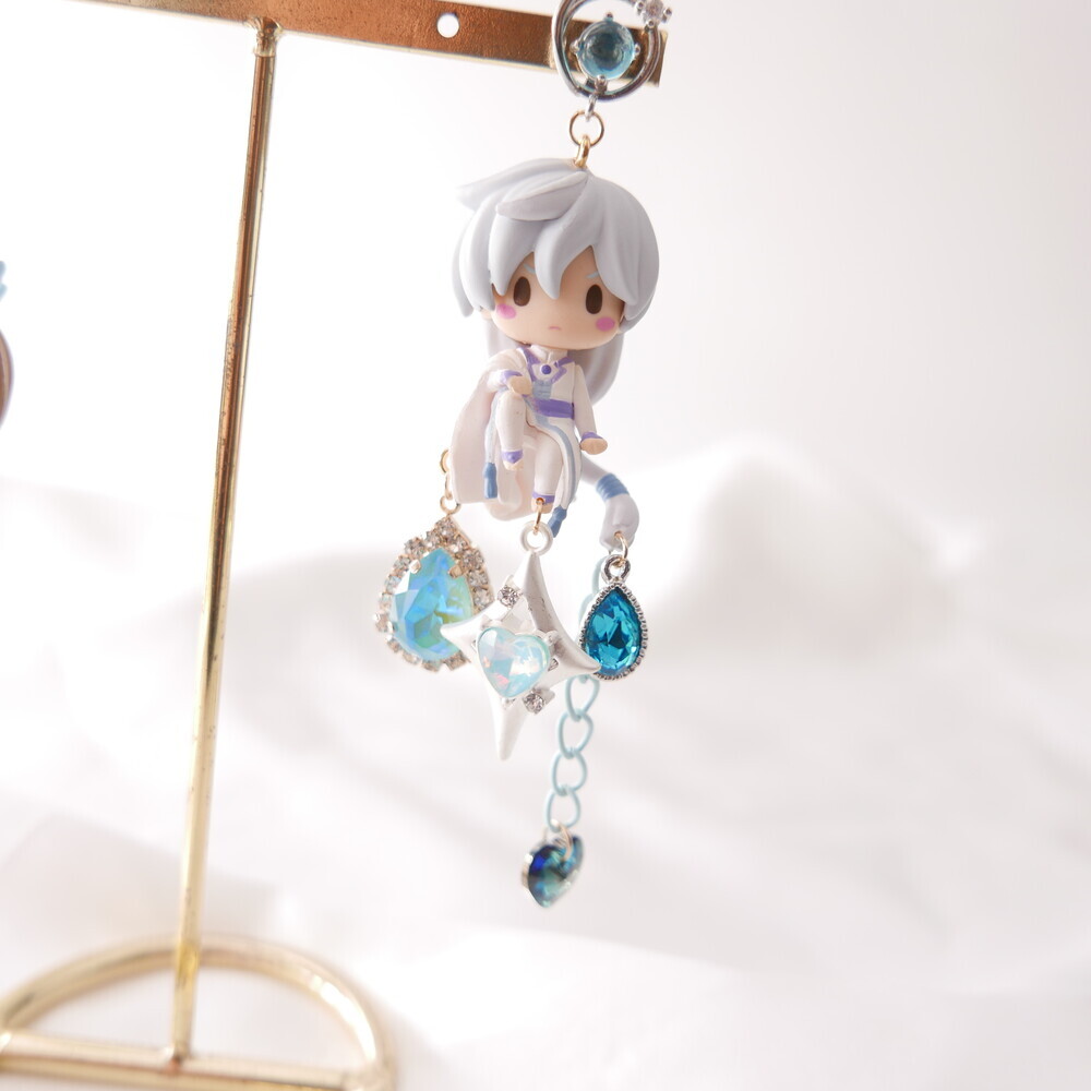 💫 A tale of moonlight and magic. Featuring Sakura and Yue from Cardcaptor Sakura, these asymmetric earrings are adorned with shimmering blue gems, celestial details, and character charms. A graceful tribute to the guardian of the Moon and the magical trials that follow.