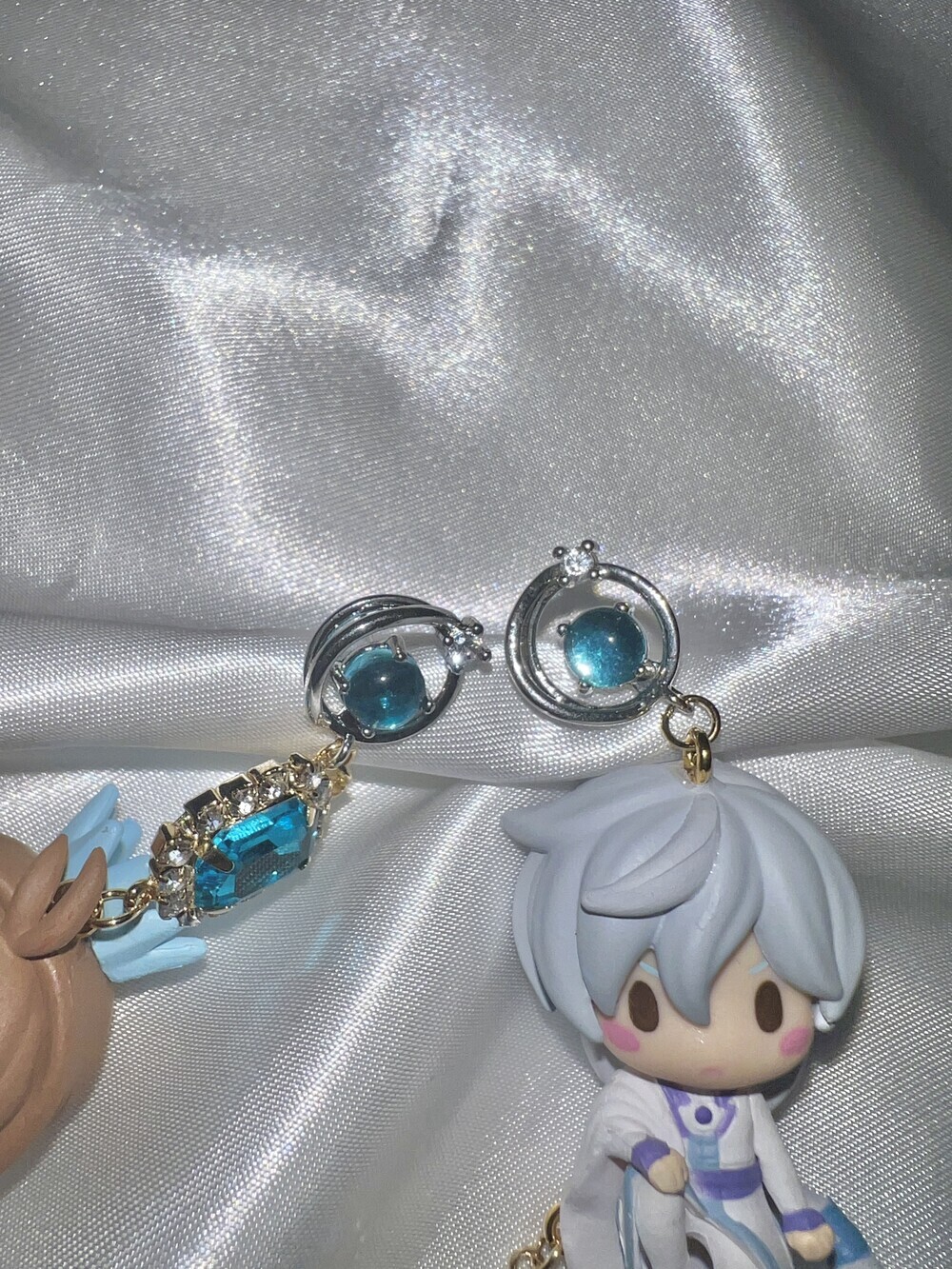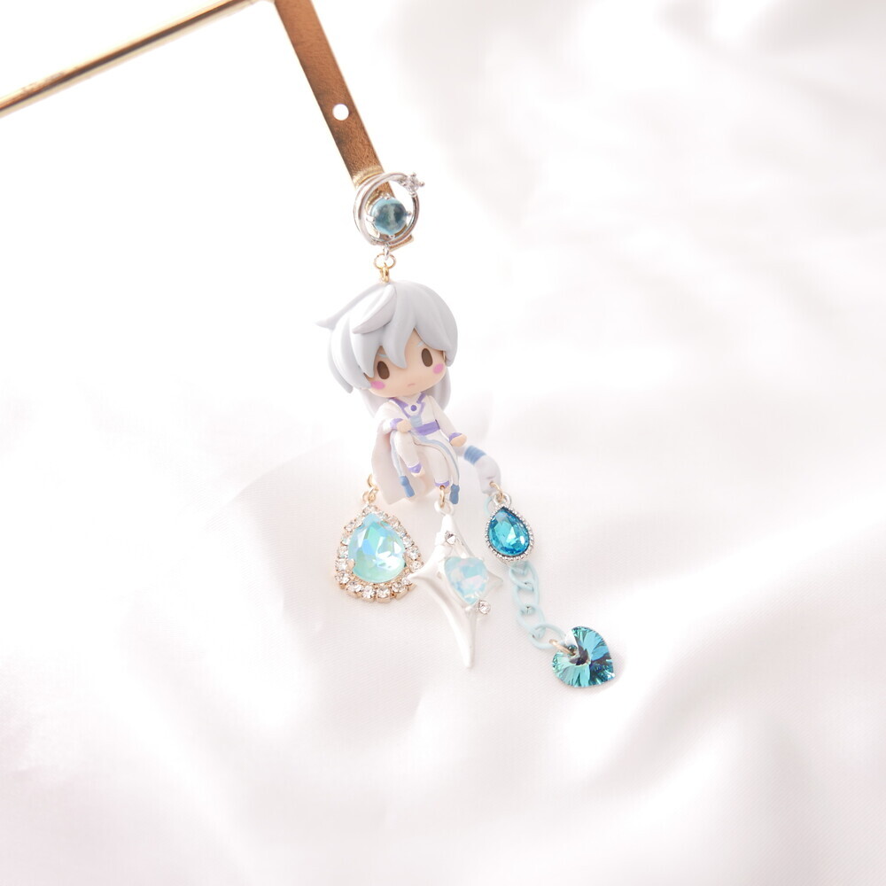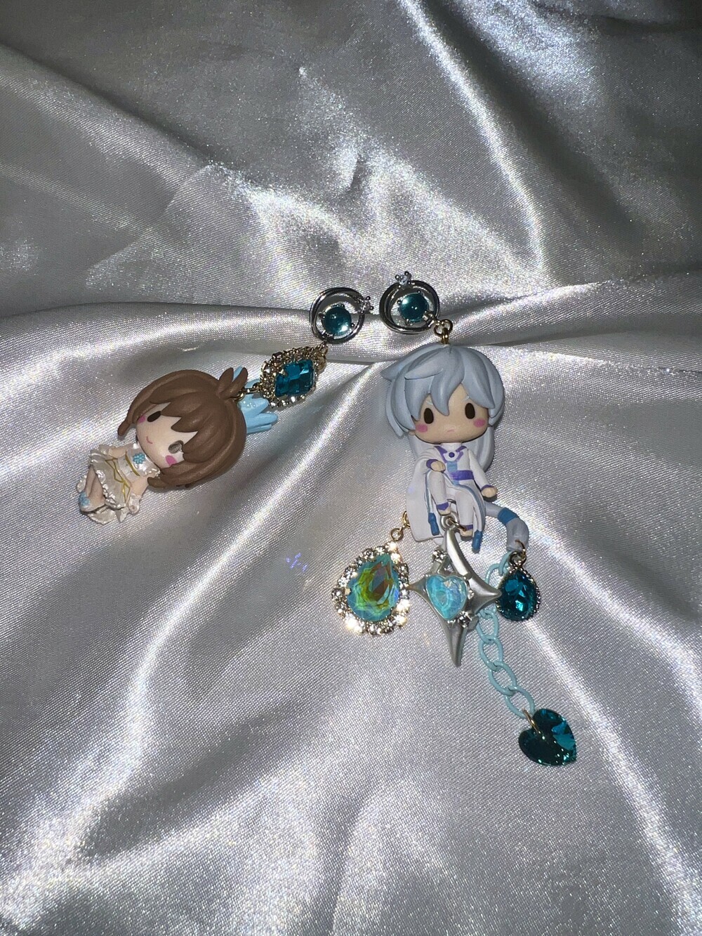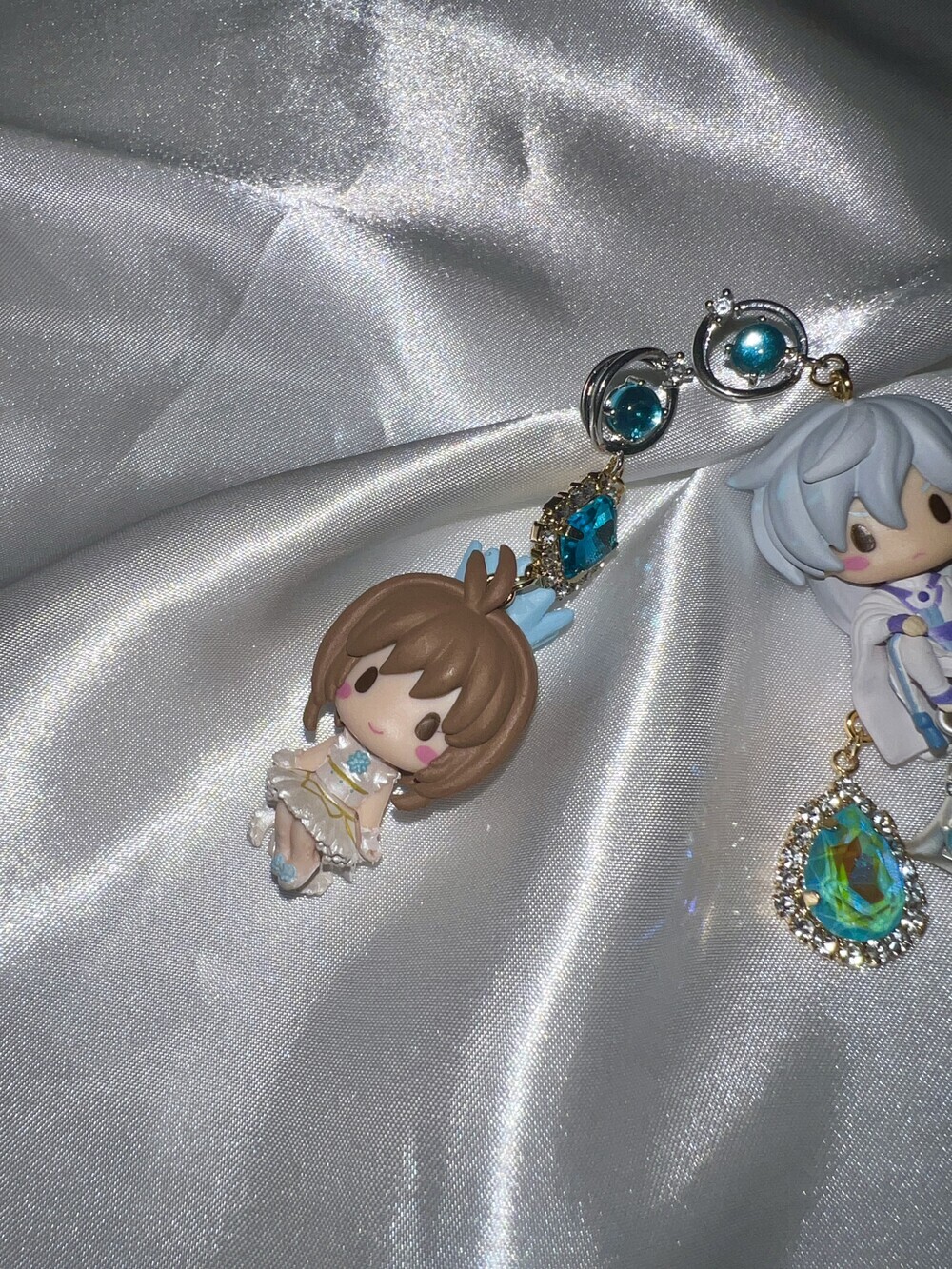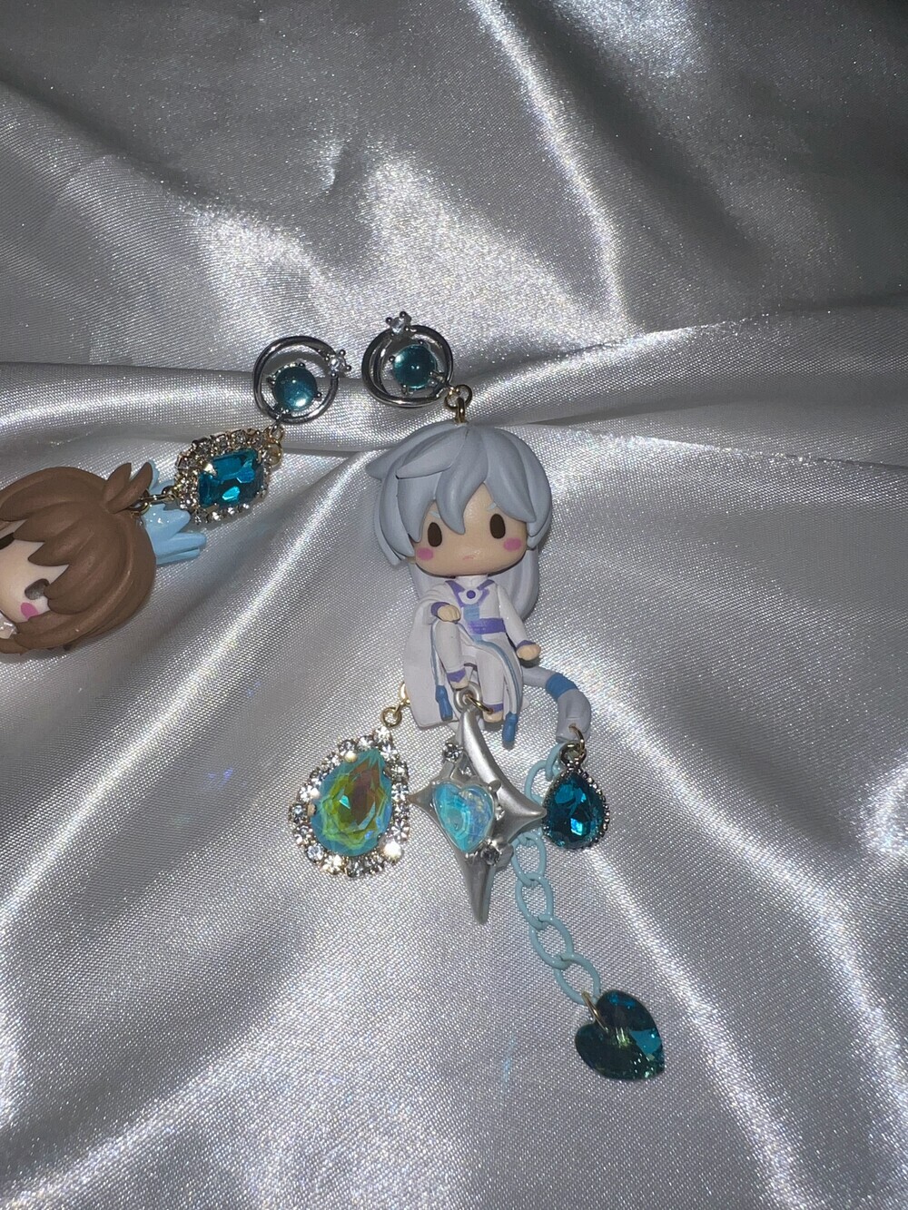💫 A tale of moonlight and magic. Featuring Sakura and Yue from Cardcaptor Sakura, these asymmetric earrings are adorned with shimmering blue gems, celestial details, and character charms. A graceful tribute to the guardian of the Moon and the magical trials that follow.