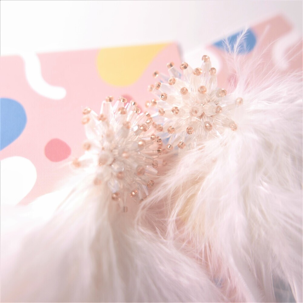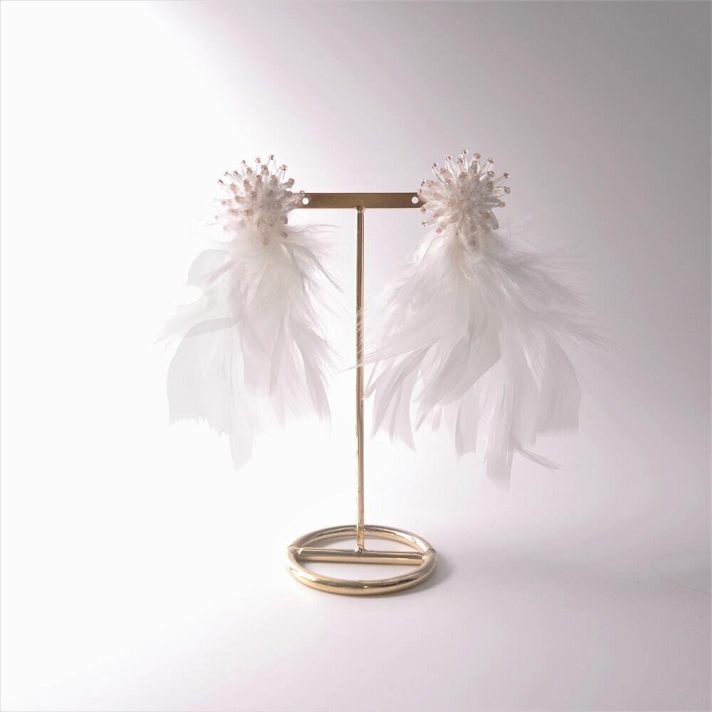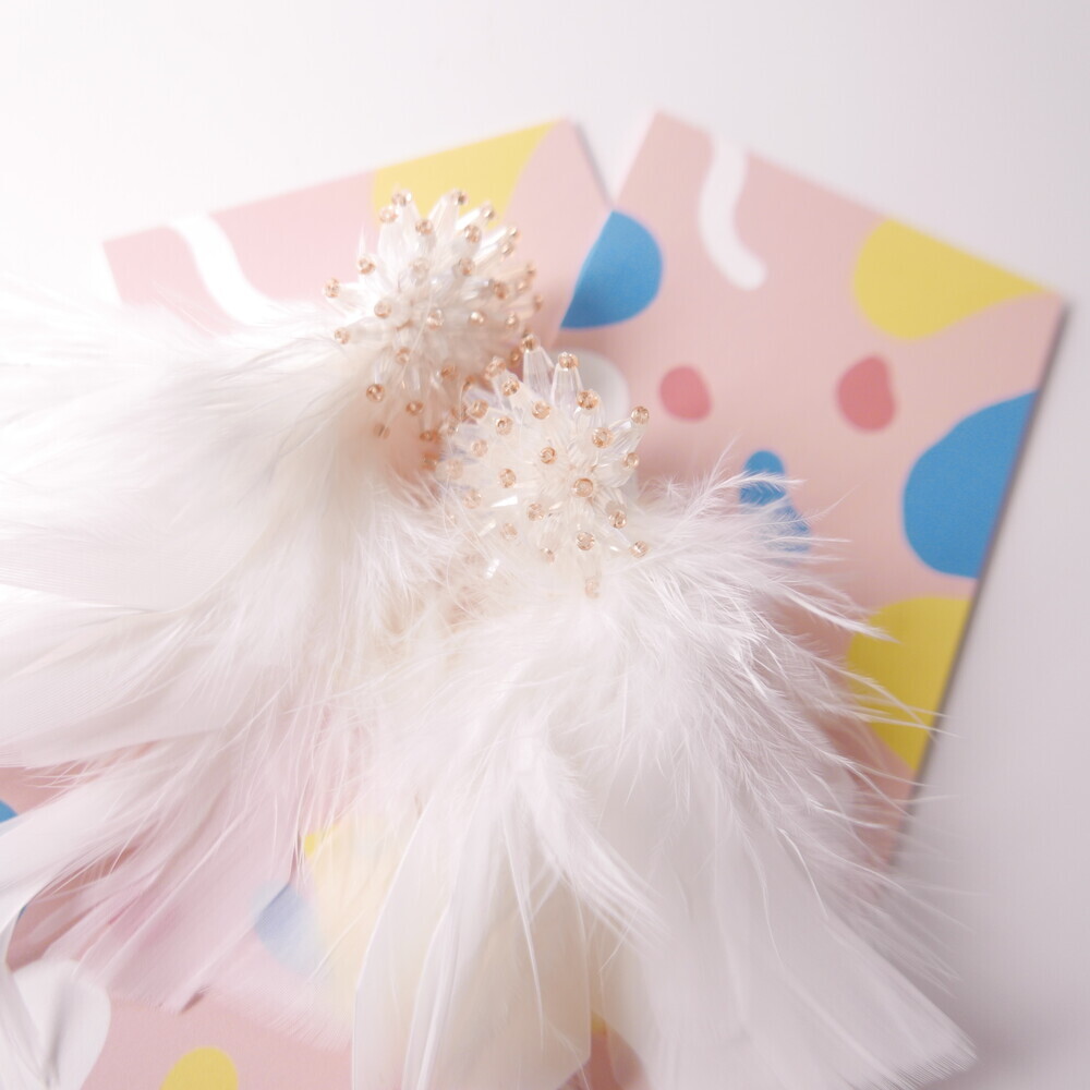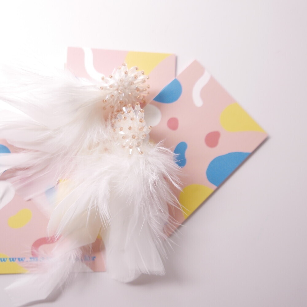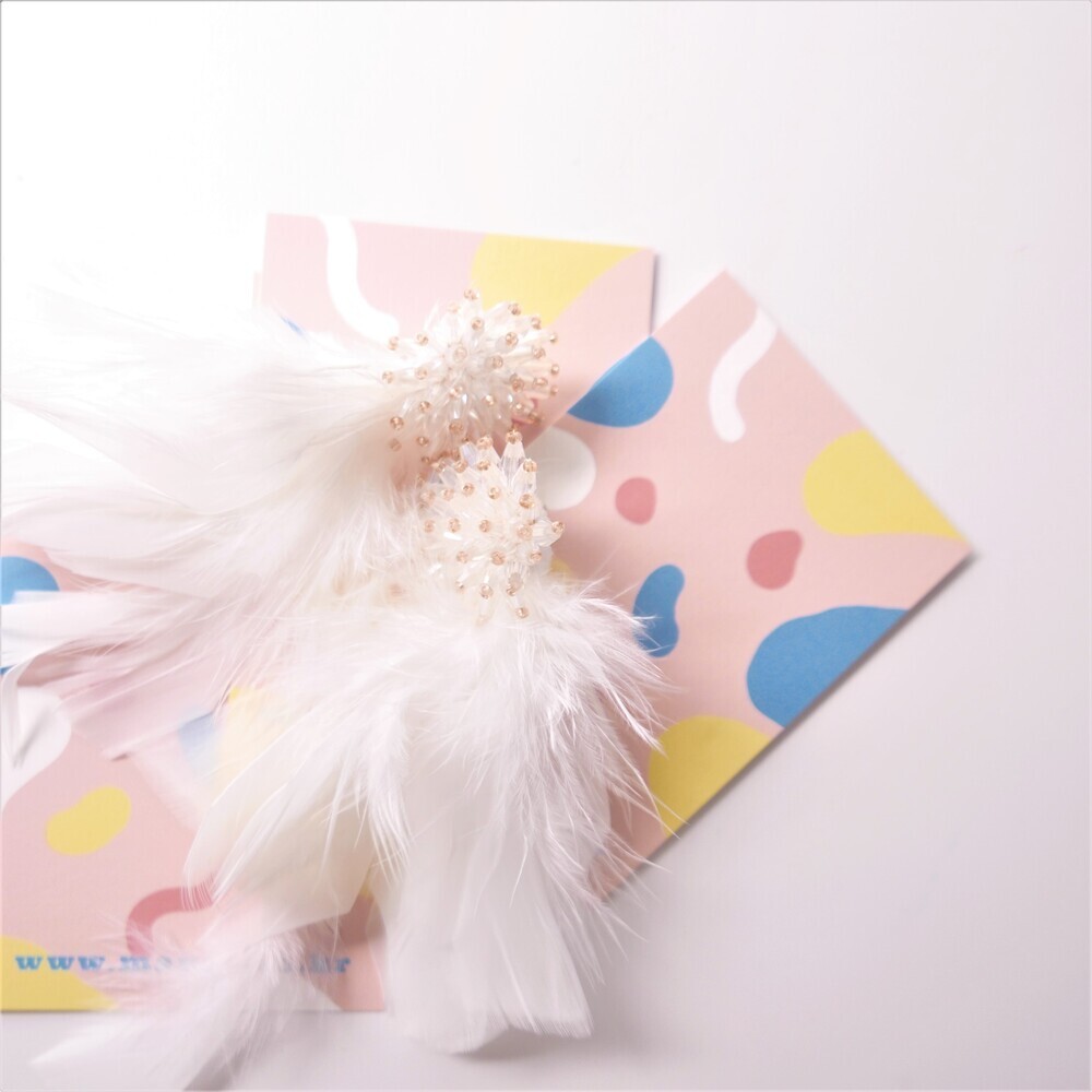 A soft and elegant statement earring crafted with layers of airy white feathers and a beaded cluster at the top. This piece floats gracefully with movement, creating a delicate and ethereal look. Handcrafted with silver 92.5% posts. Please note: this item is made to order and takes 3–4 days for production.