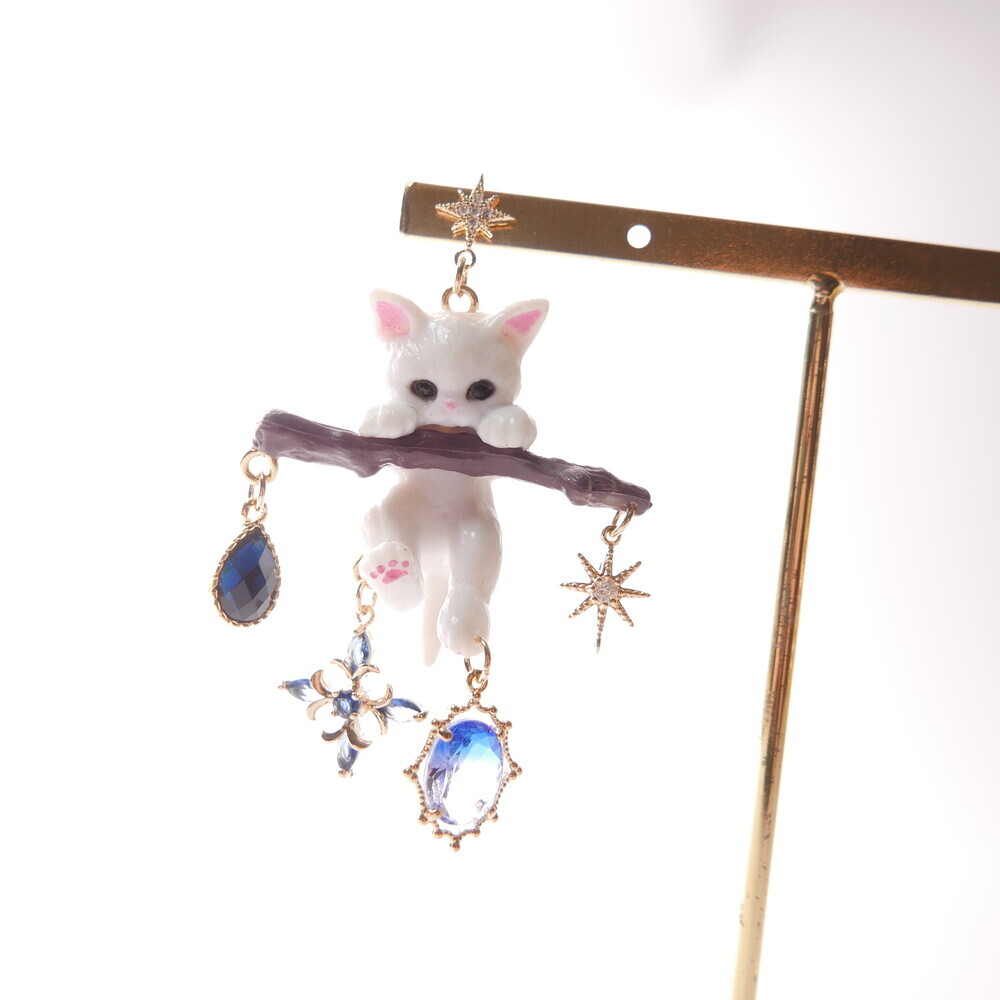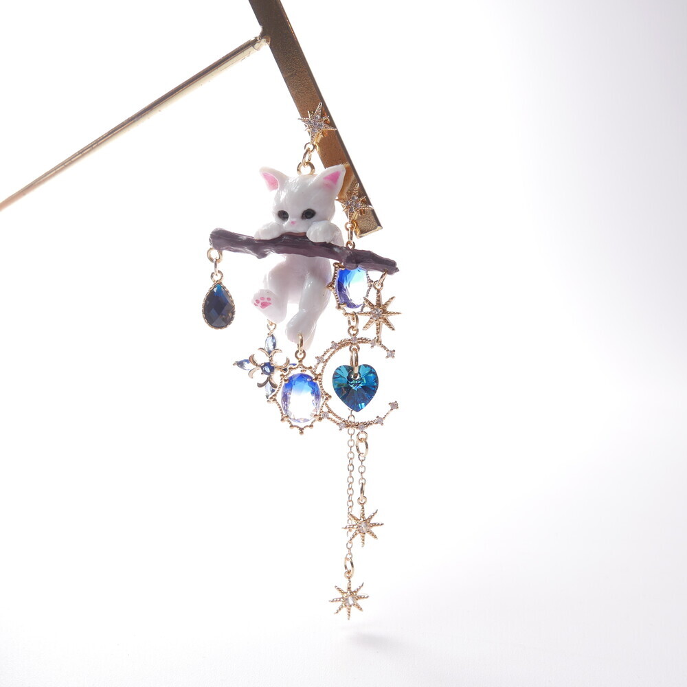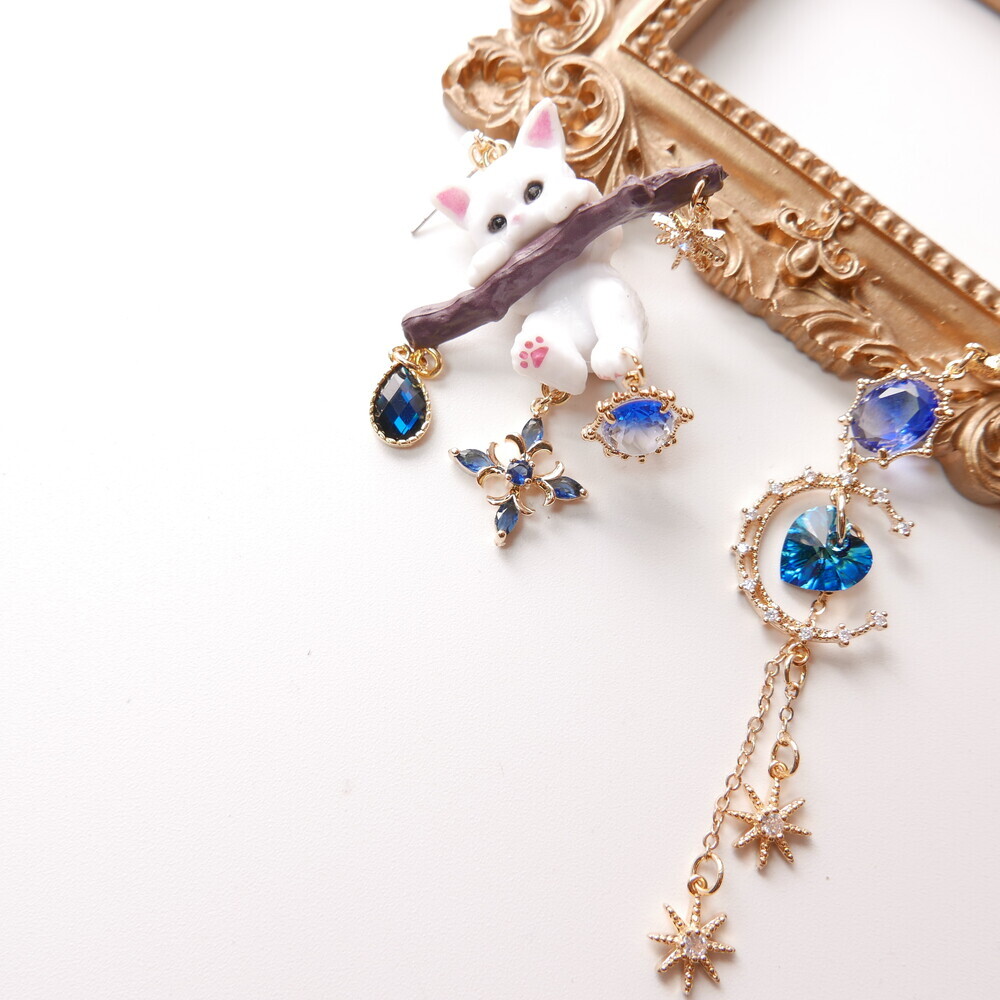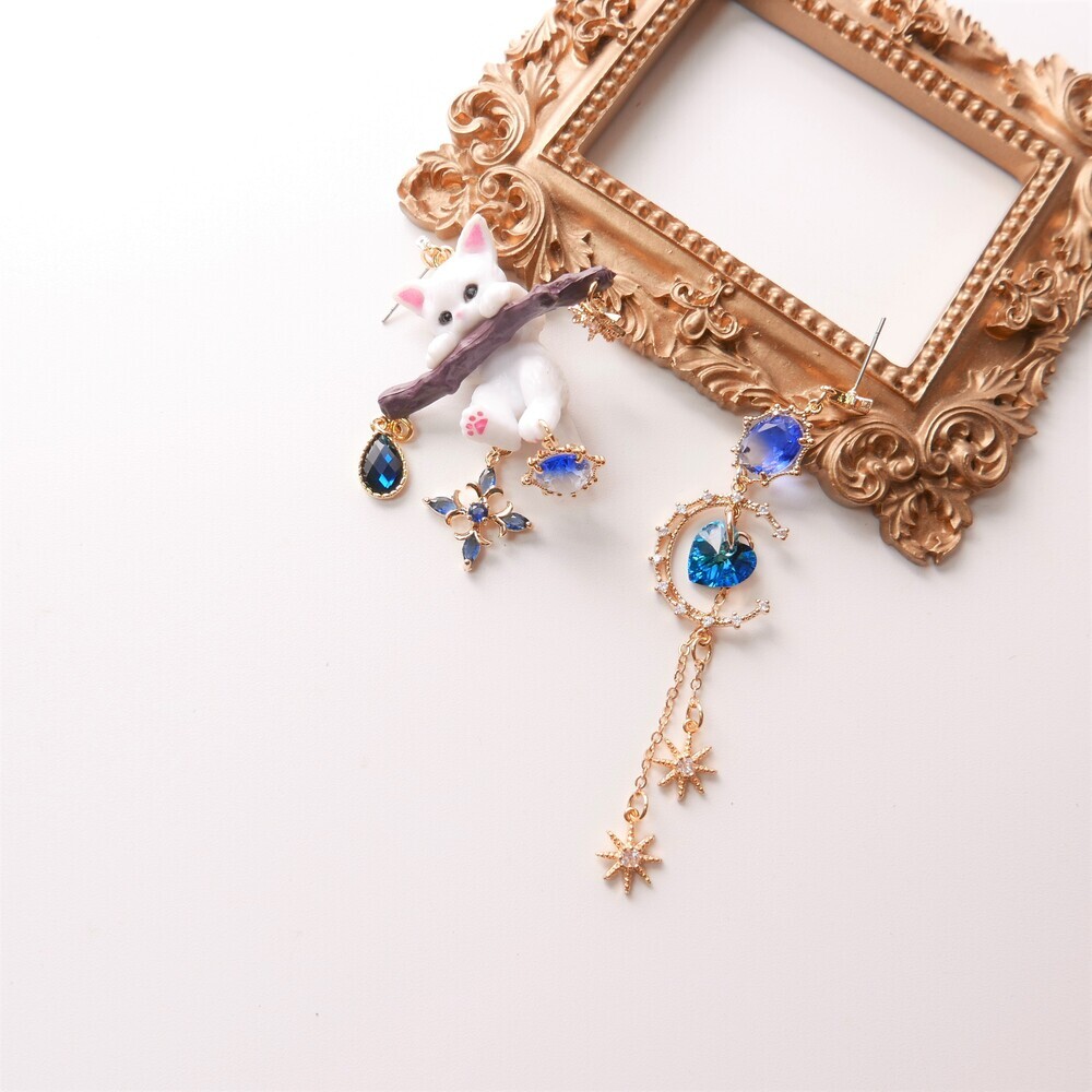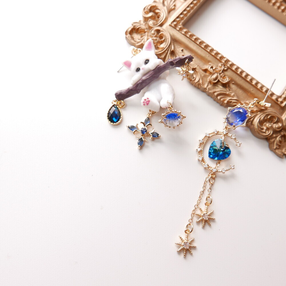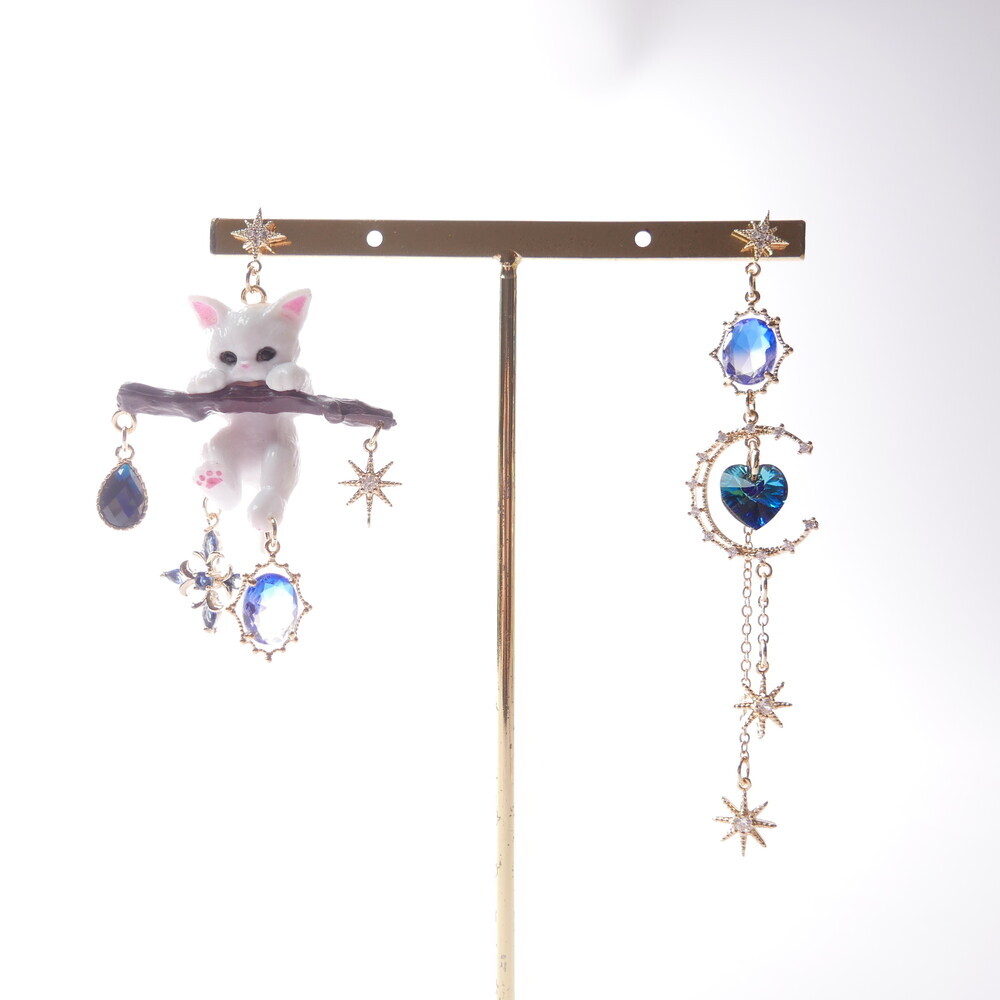 Dive into the dreamy atmosphere of a summer night with these asymmetric earrings featuring a white cat playfully hanging from a branch and sparkling celestial charms. Crafted in cool blue tones with dazzling Swarovski crystals, the combination of stars, moon, and gems evokes a magical night sky. Lightweight yet detailed, these earrings are perfect for those who love unique and whimsical accessories.