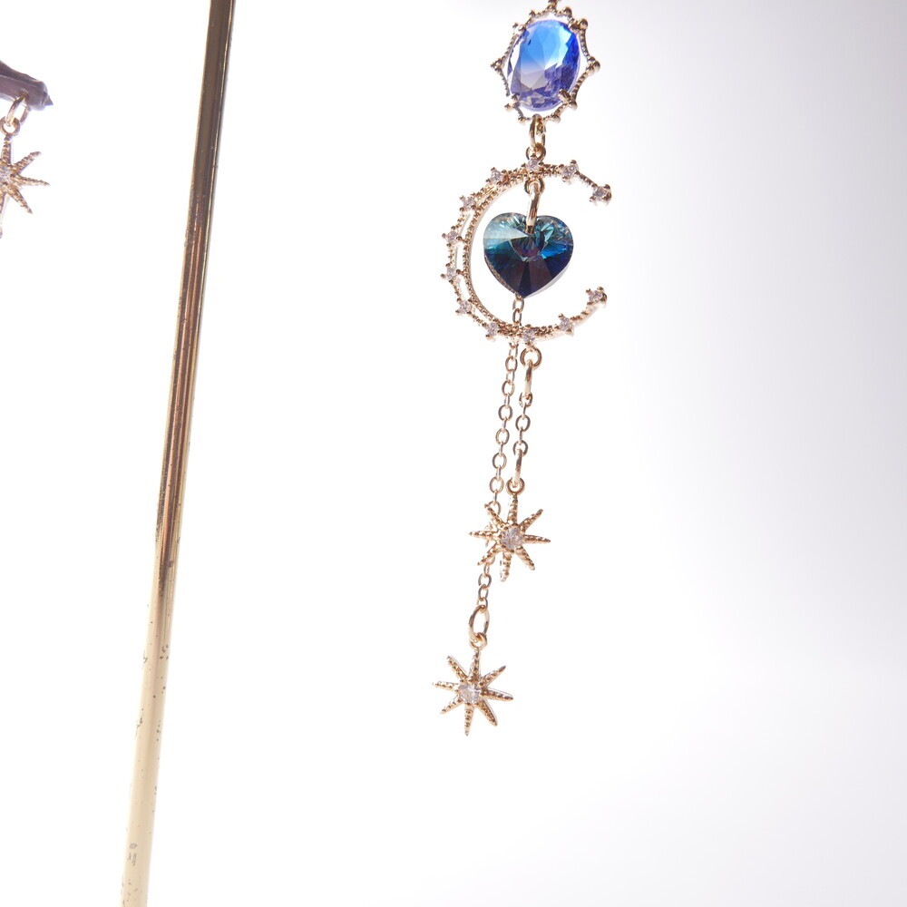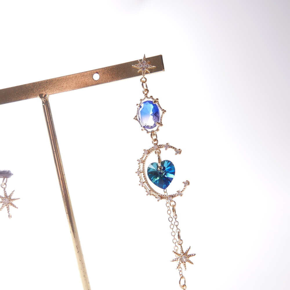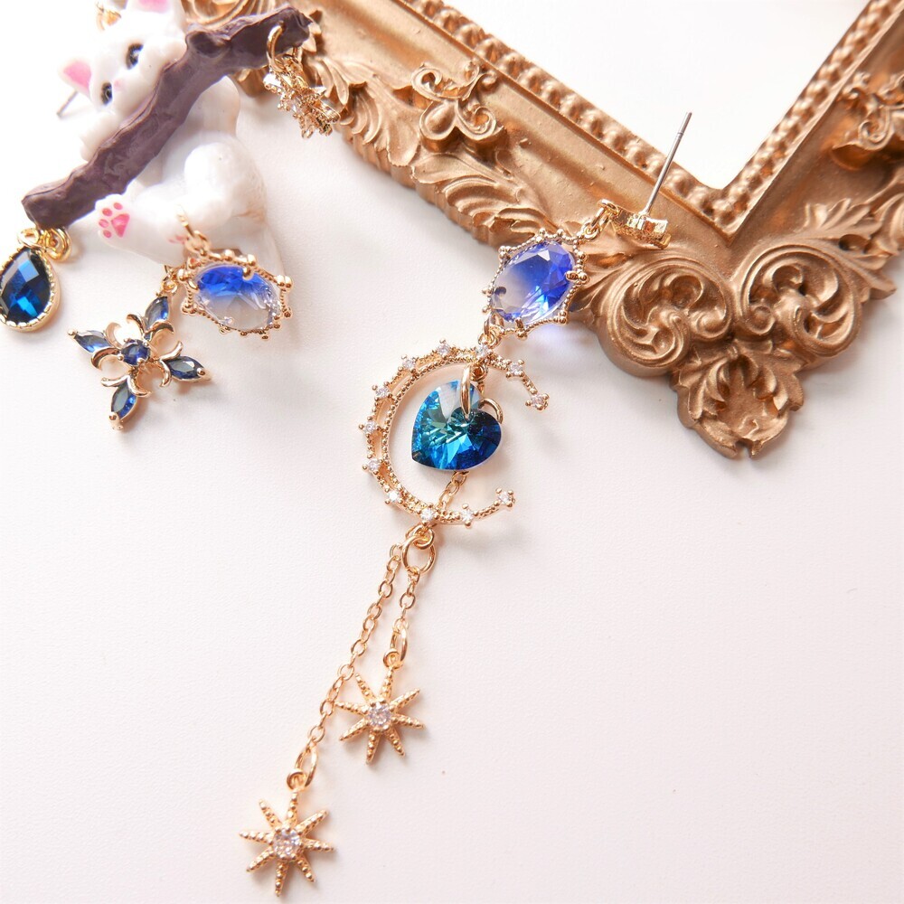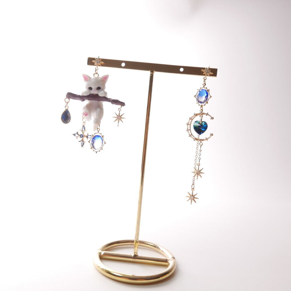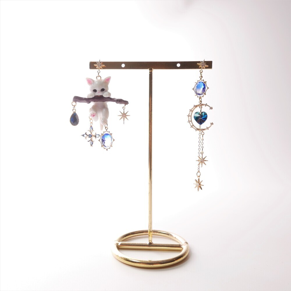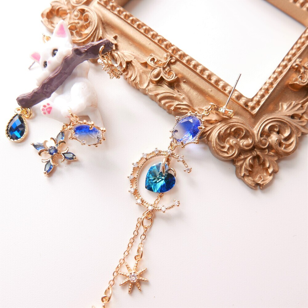 Dive into the dreamy atmosphere of a summer night with these asymmetric earrings featuring a white cat playfully hanging from a branch and sparkling celestial charms. Crafted in cool blue tones with dazzling Swarovski crystals, the combination of stars, moon, and gems evokes a magical night sky. Lightweight yet detailed, these earrings are perfect for those who love unique and whimsical accessories.