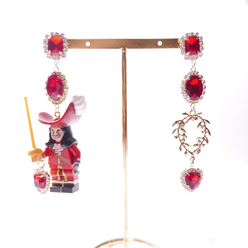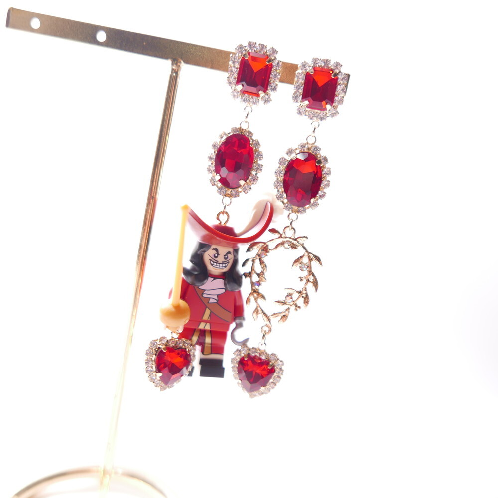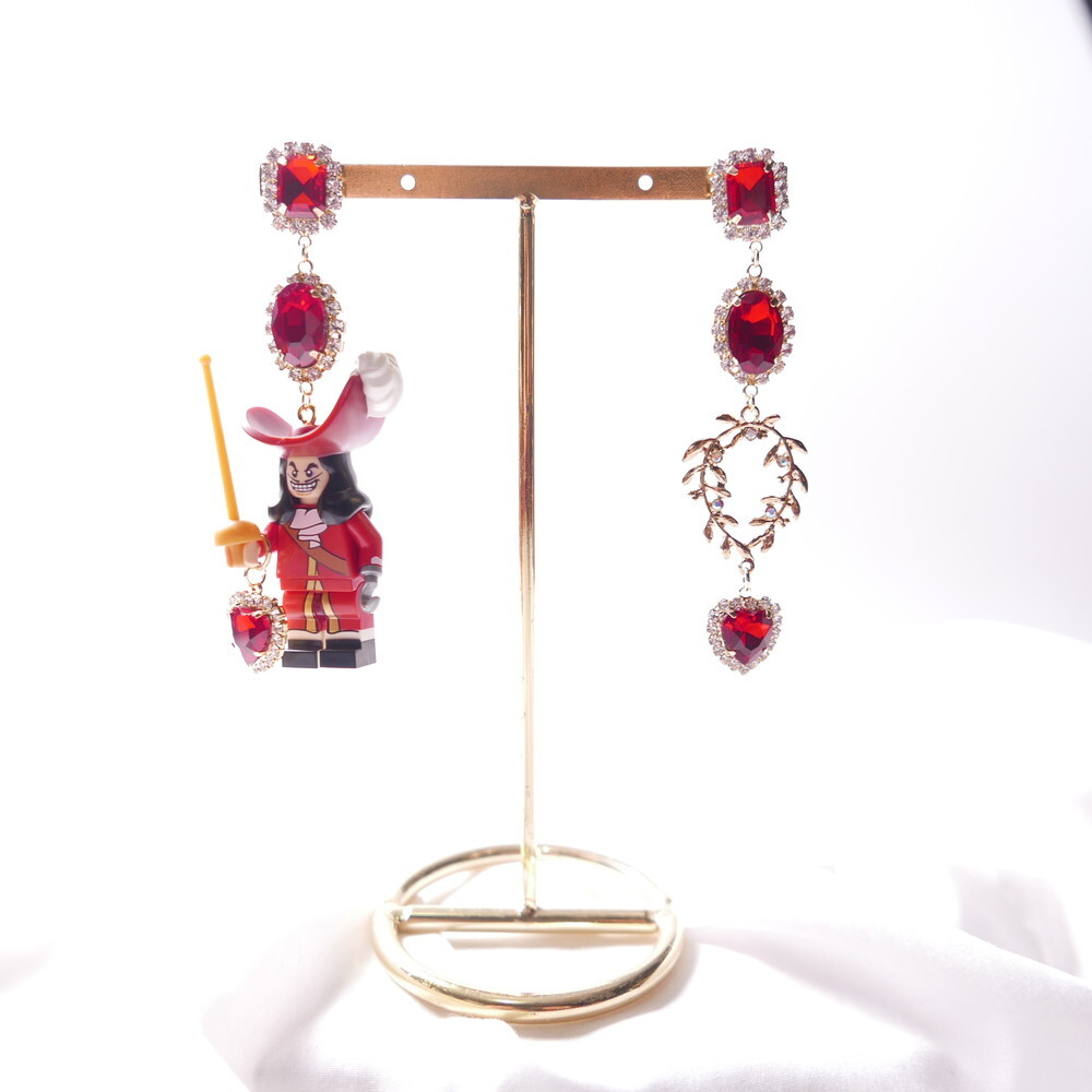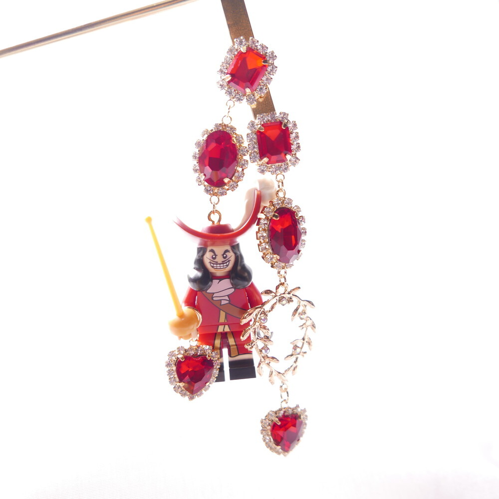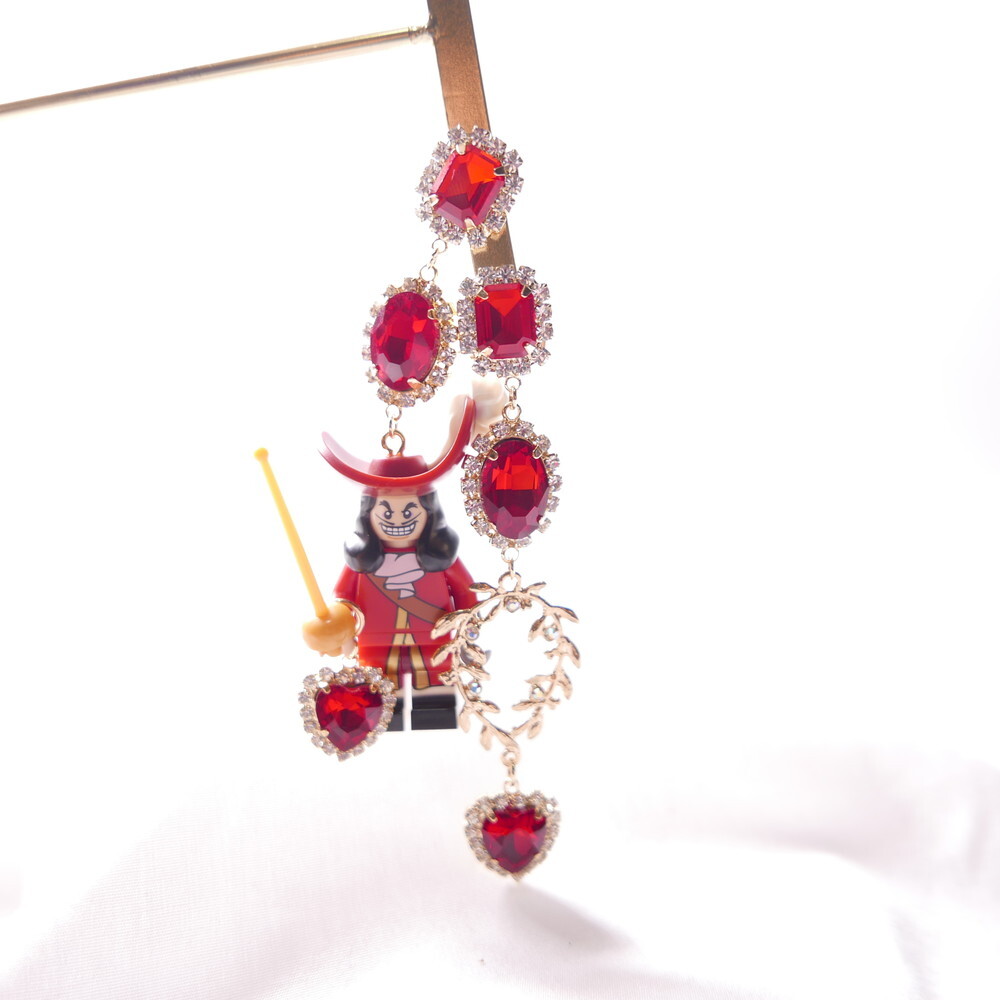 Inspired by the infamous villain from Peter Pan, these dramatic asymmetrical earrings feature Hook’s iconic red outfit, sword, and oversized feather hat.