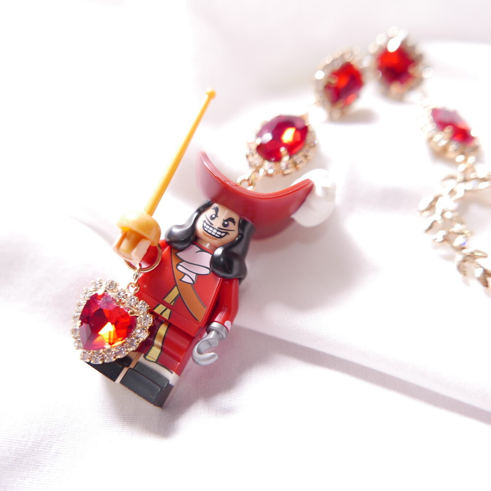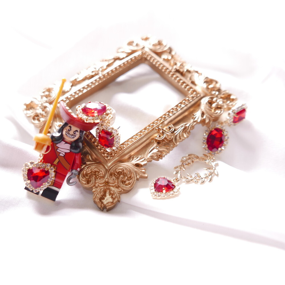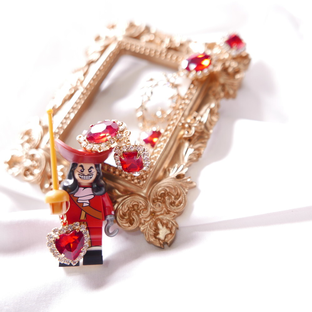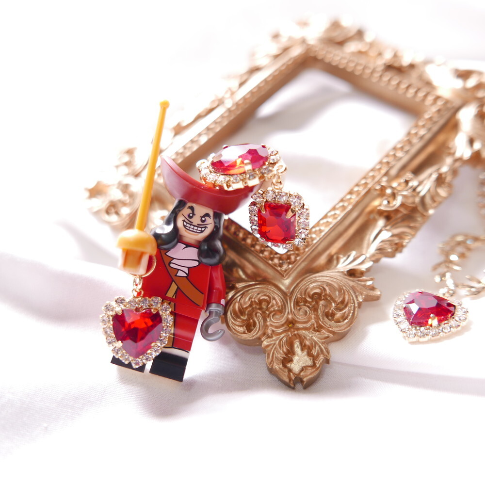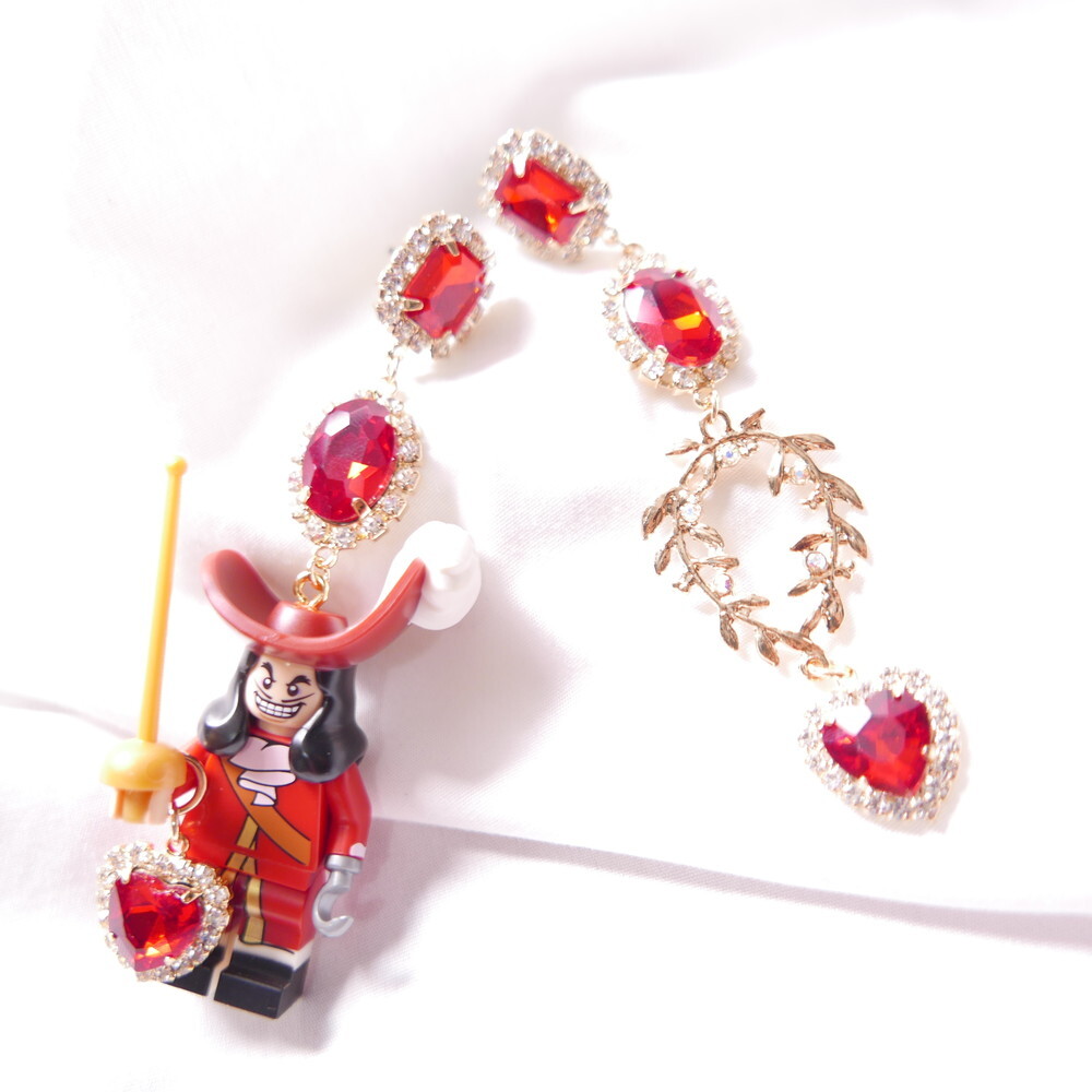 Inspired by the infamous villain from Peter Pan, these dramatic asymmetrical earrings feature Hook’s iconic red outfit, sword, and oversized feather hat.