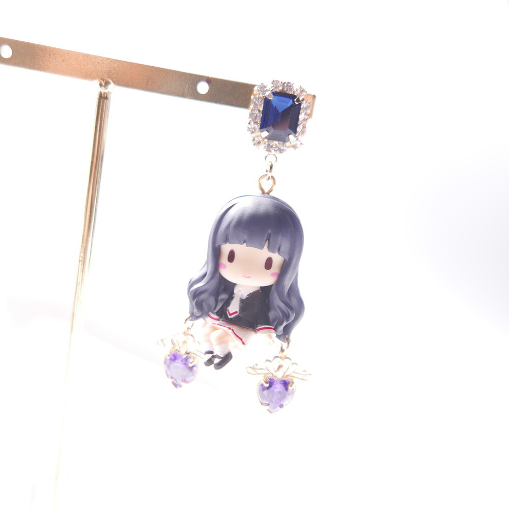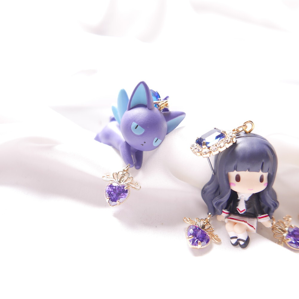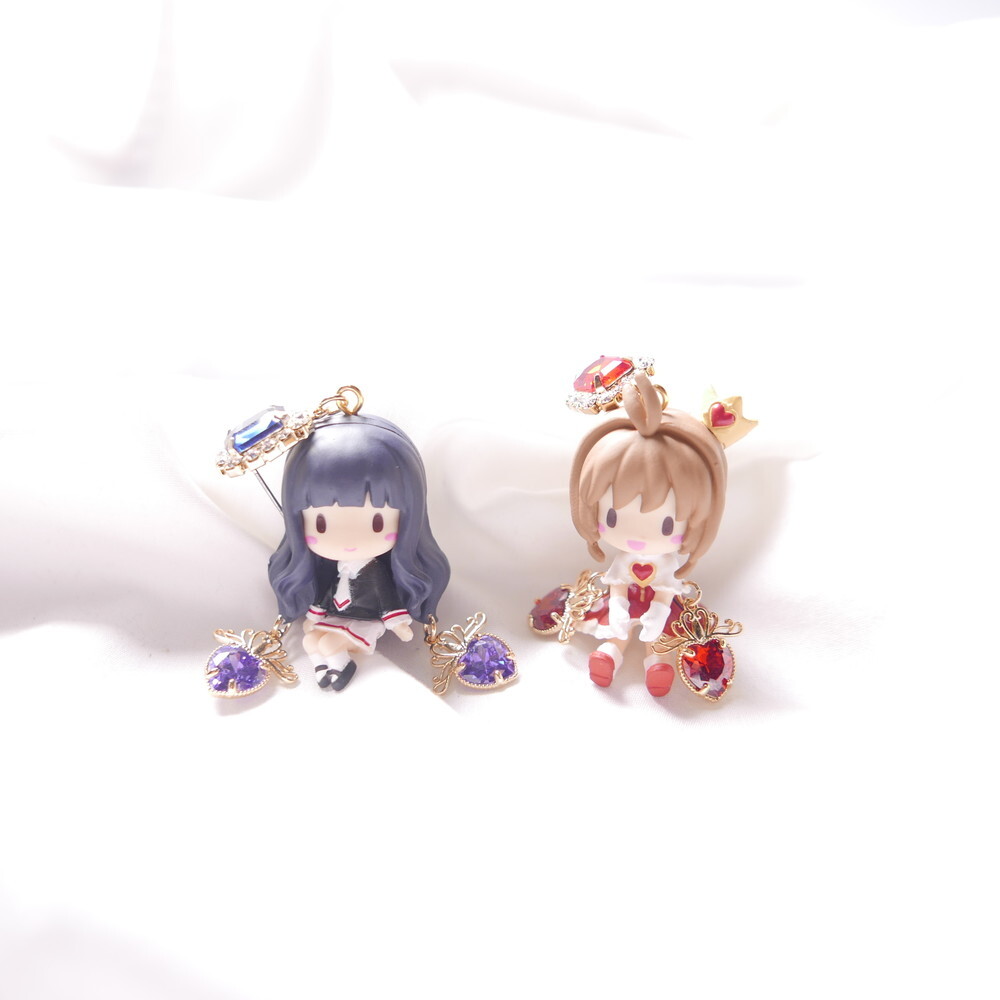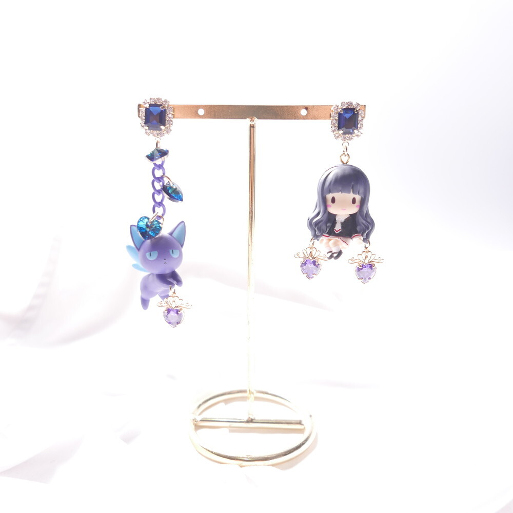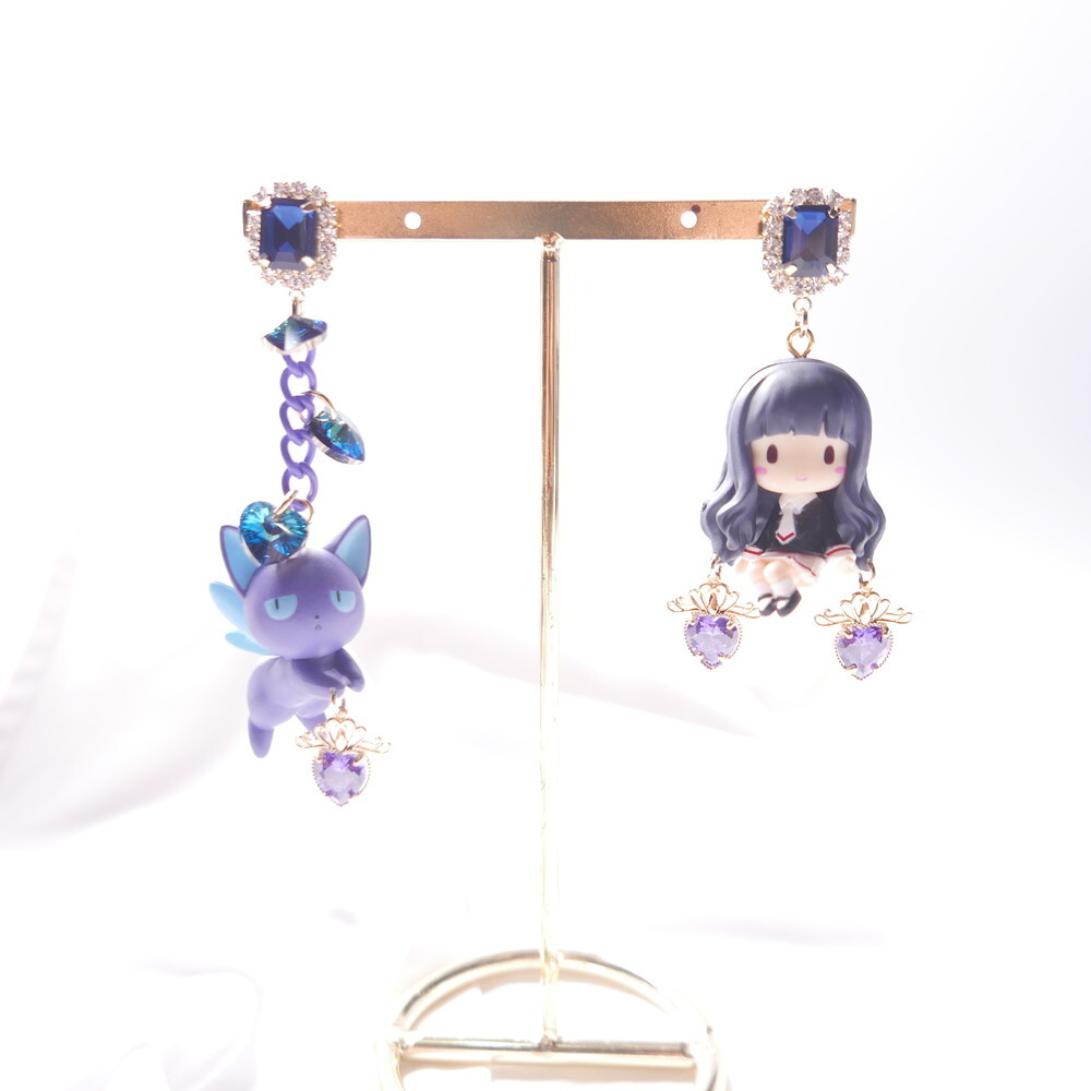 Inspired by Cardcaptor Sakura, these mismatched earrings feature a chibi-style Tomoyo and the cool and calm Spinel. A perfect match in navy and lavender hues, enhanced with sparkling Swarovski crystals and royal blue gem tops. For fans of anime aesthetics and character-based jewelry, these earrings add a touch of magic to any look.