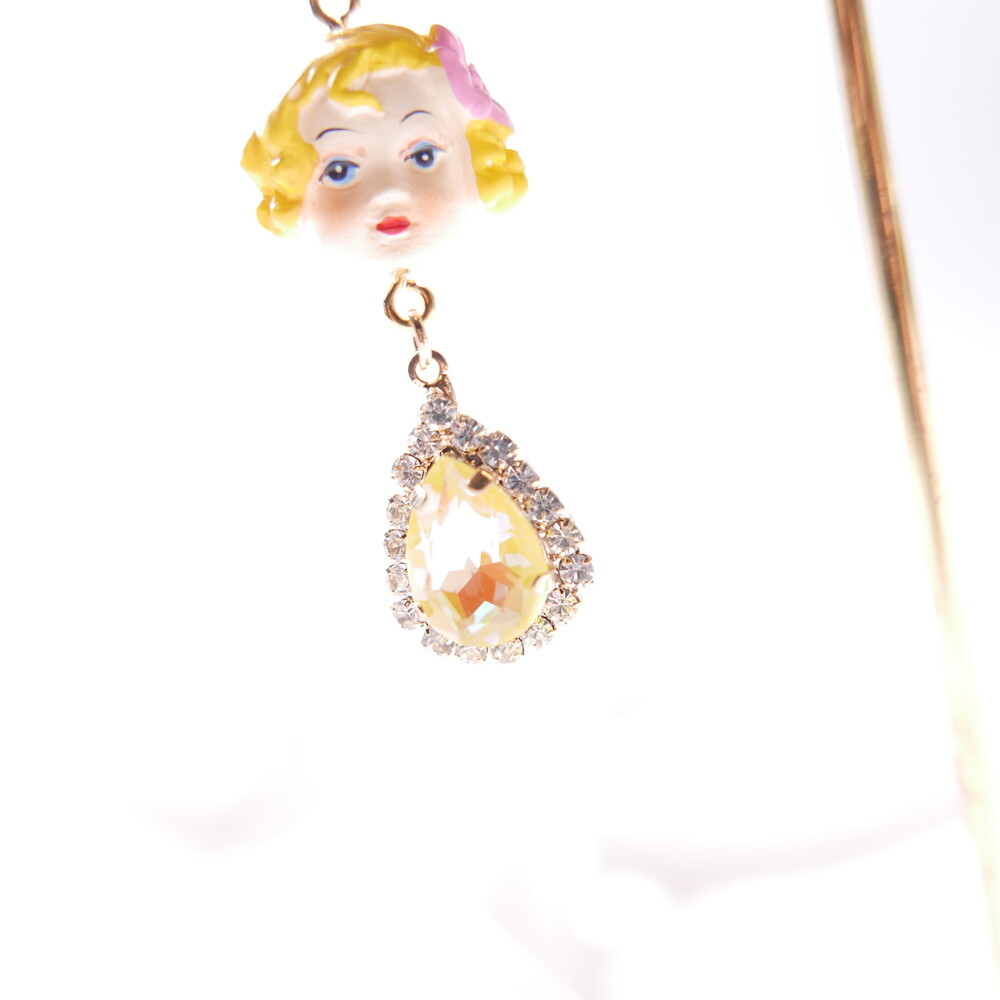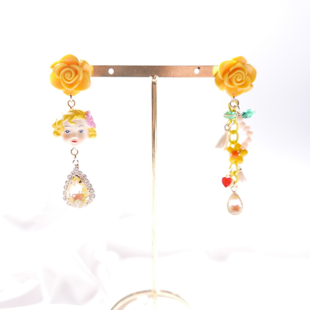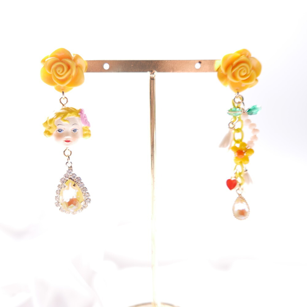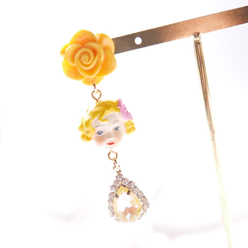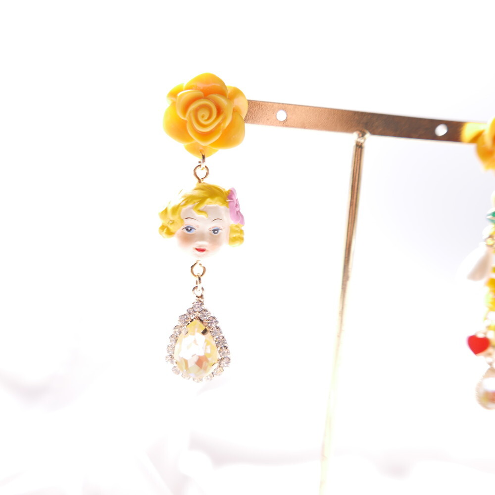 Meet the sunshine-colored French Doll earrings a charming mix of vintage doll elegance and playful beaded accents. One earring features a delicately painted doll head with golden curls and a pink flower detail, paired with a teardrop crystal charm. The other sparkles with yellow flower beads, faux pearls, and a red heart, creating a cheerful asymmetry. These earrings offer a nostalgic yet youthful style that's perfect for playful fashion lovers.