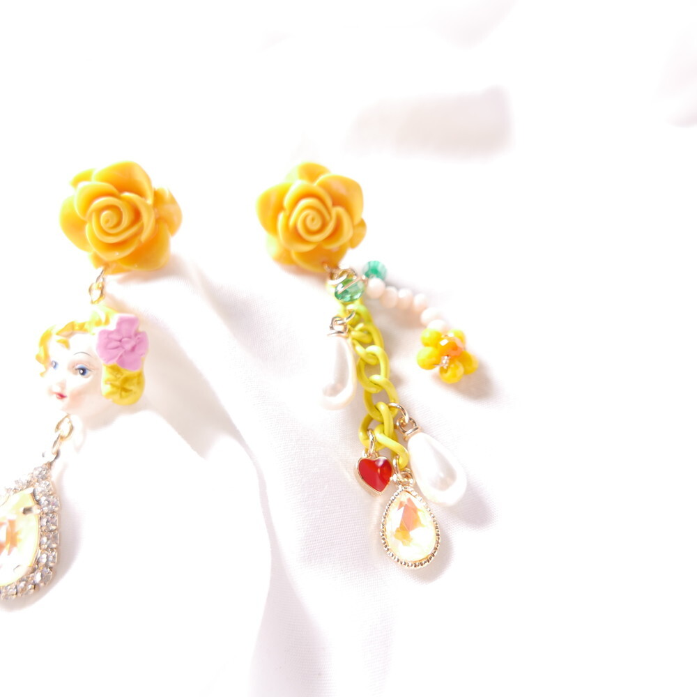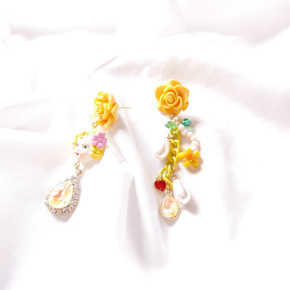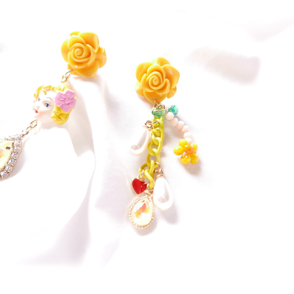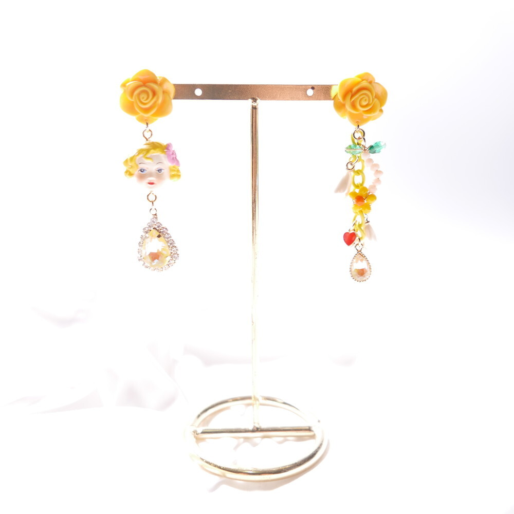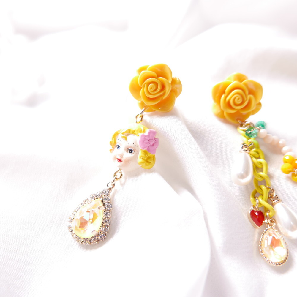 Meet the sunshine-colored French Doll earrings a charming mix of vintage doll elegance and playful beaded accents. One earring features a delicately painted doll head with golden curls and a pink flower detail, paired with a teardrop crystal charm. The other sparkles with yellow flower beads, faux pearls, and a red heart, creating a cheerful asymmetry. These earrings offer a nostalgic yet youthful style that's perfect for playful fashion lovers.
