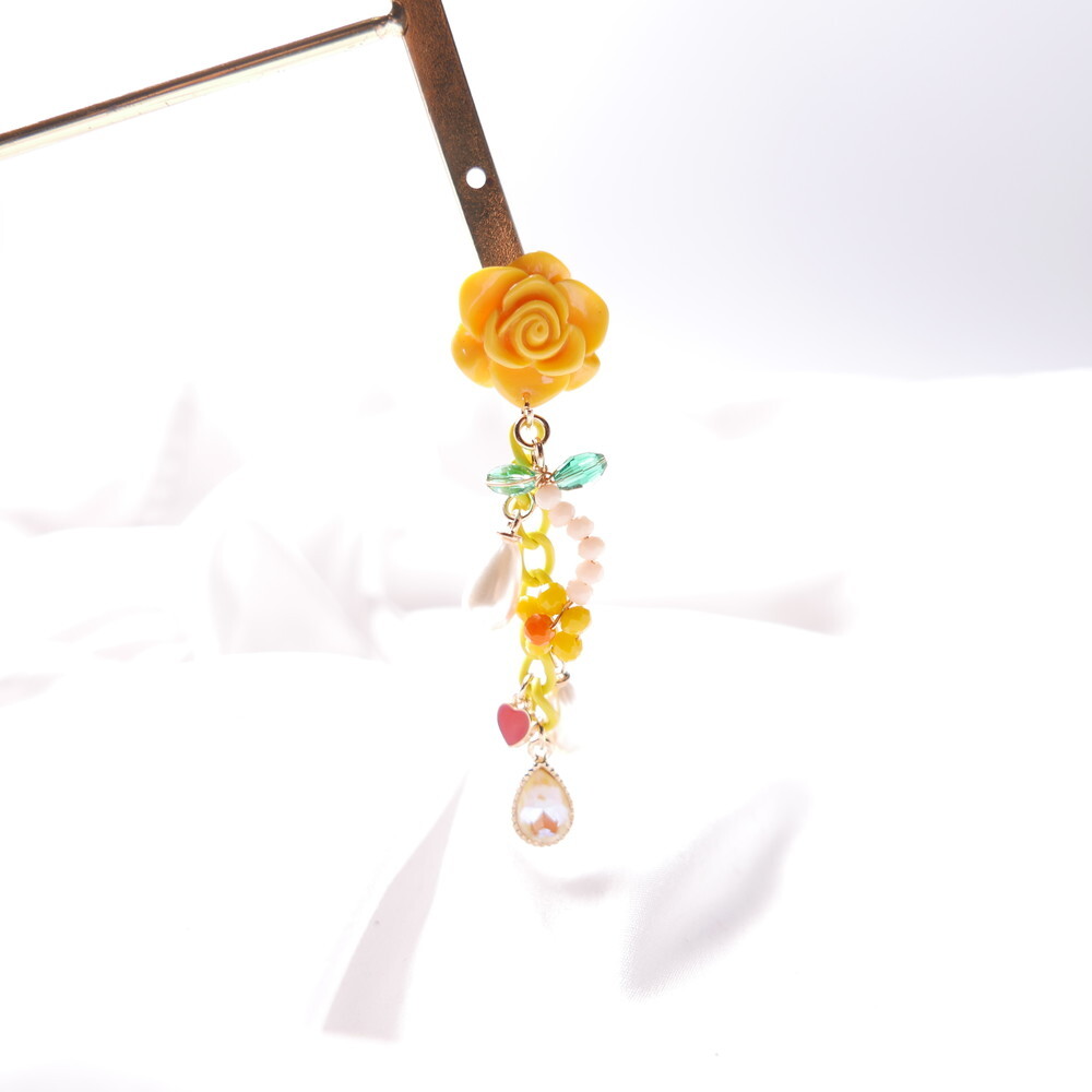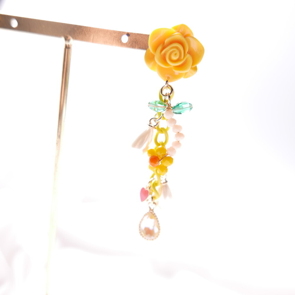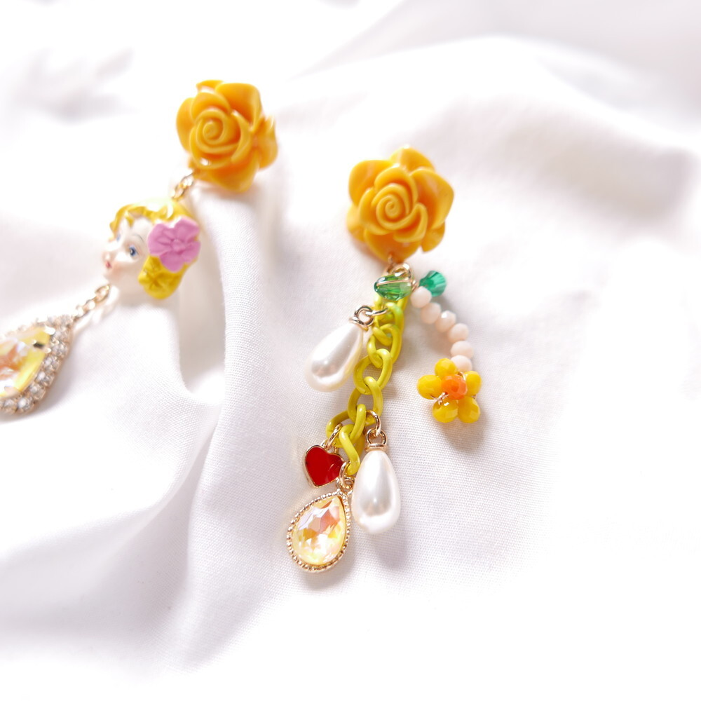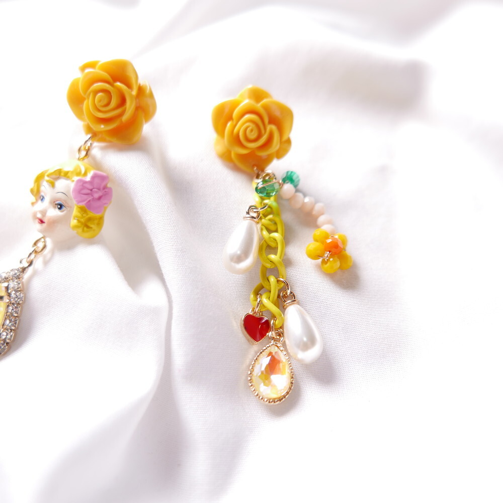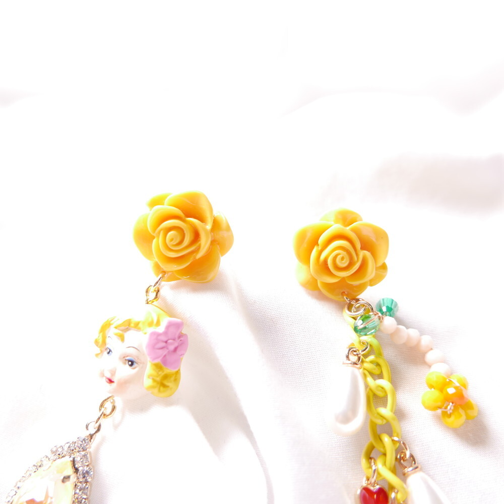 Meet the sunshine-colored French Doll earrings a charming mix of vintage doll elegance and playful beaded accents. One earring features a delicately painted doll head with golden curls and a pink flower detail, paired with a teardrop crystal charm. The other sparkles with yellow flower beads, faux pearls, and a red heart, creating a cheerful asymmetry. These earrings offer a nostalgic yet youthful style that's perfect for playful fashion lovers.