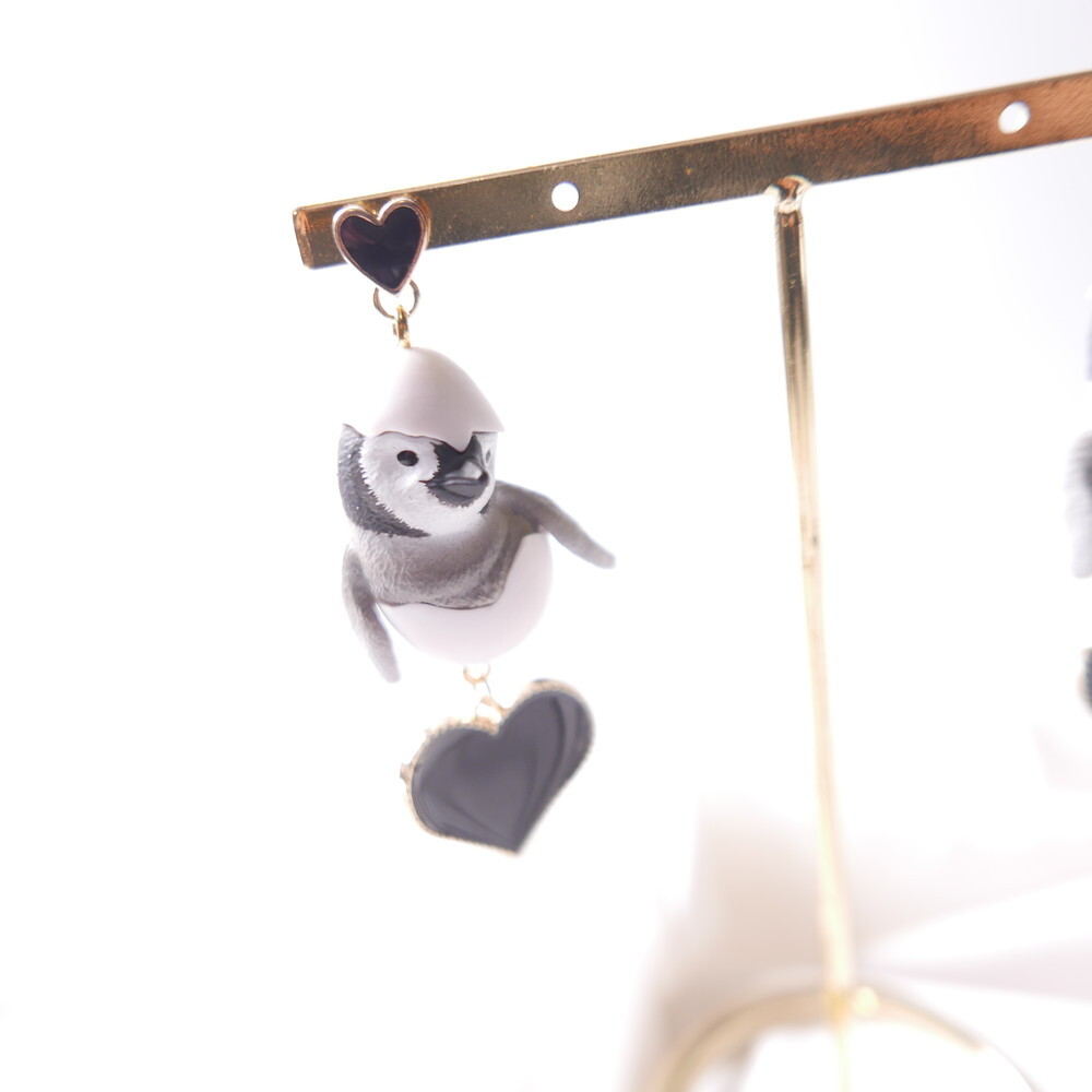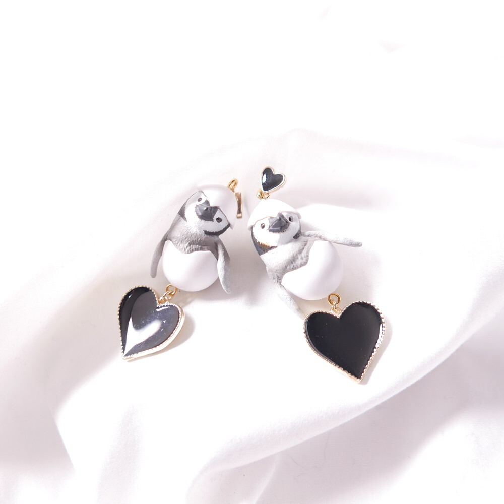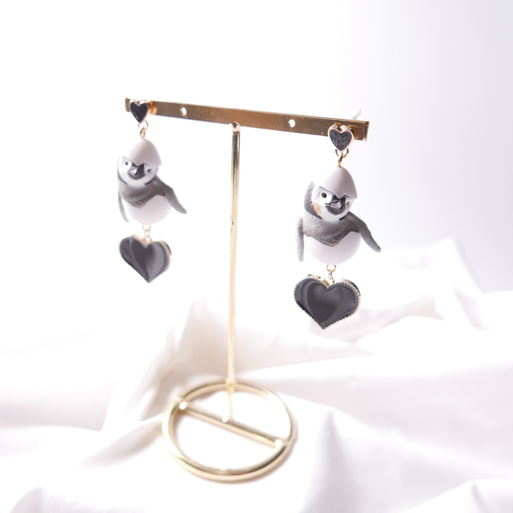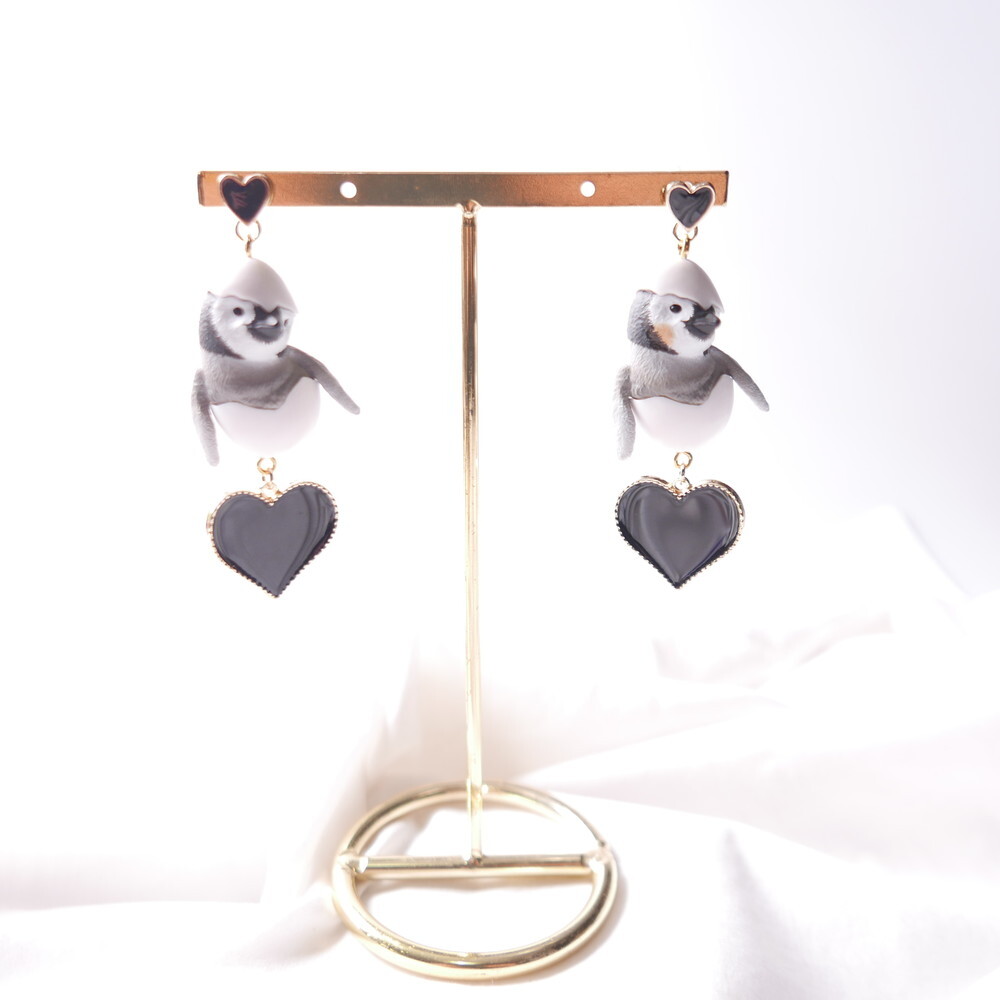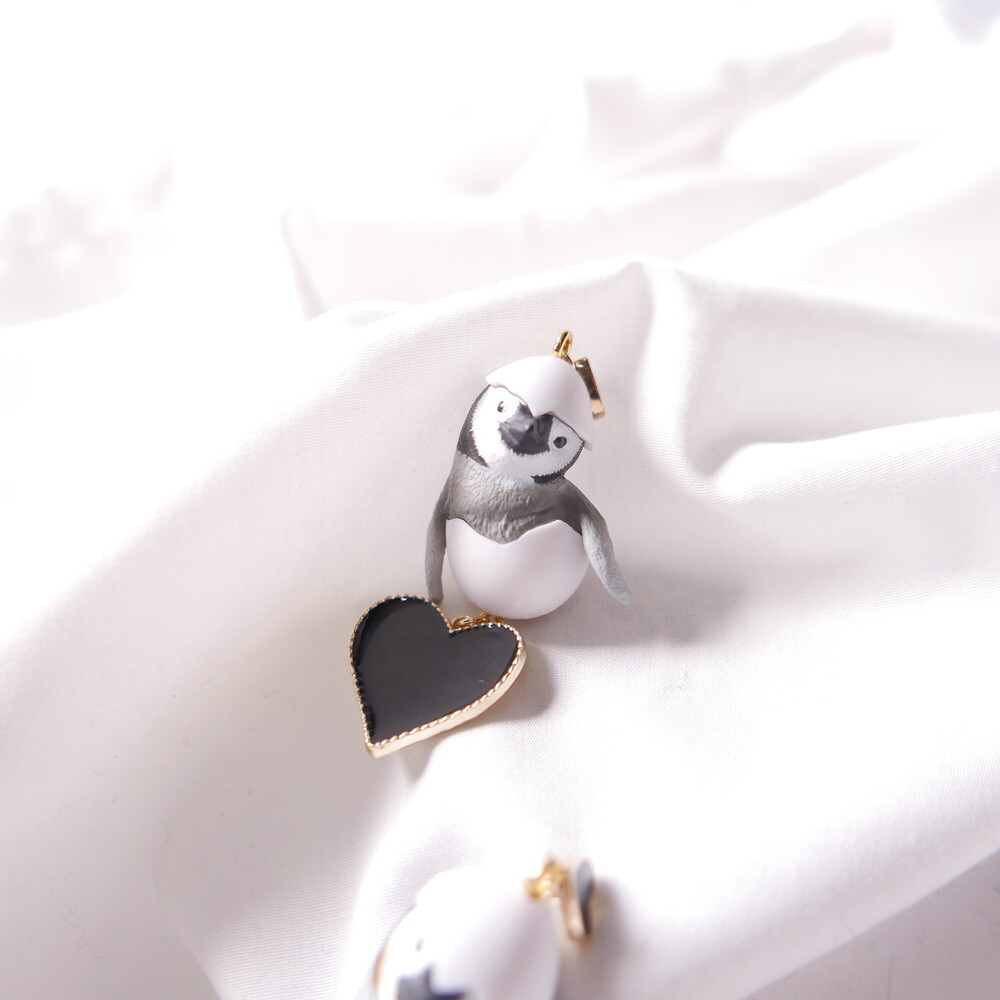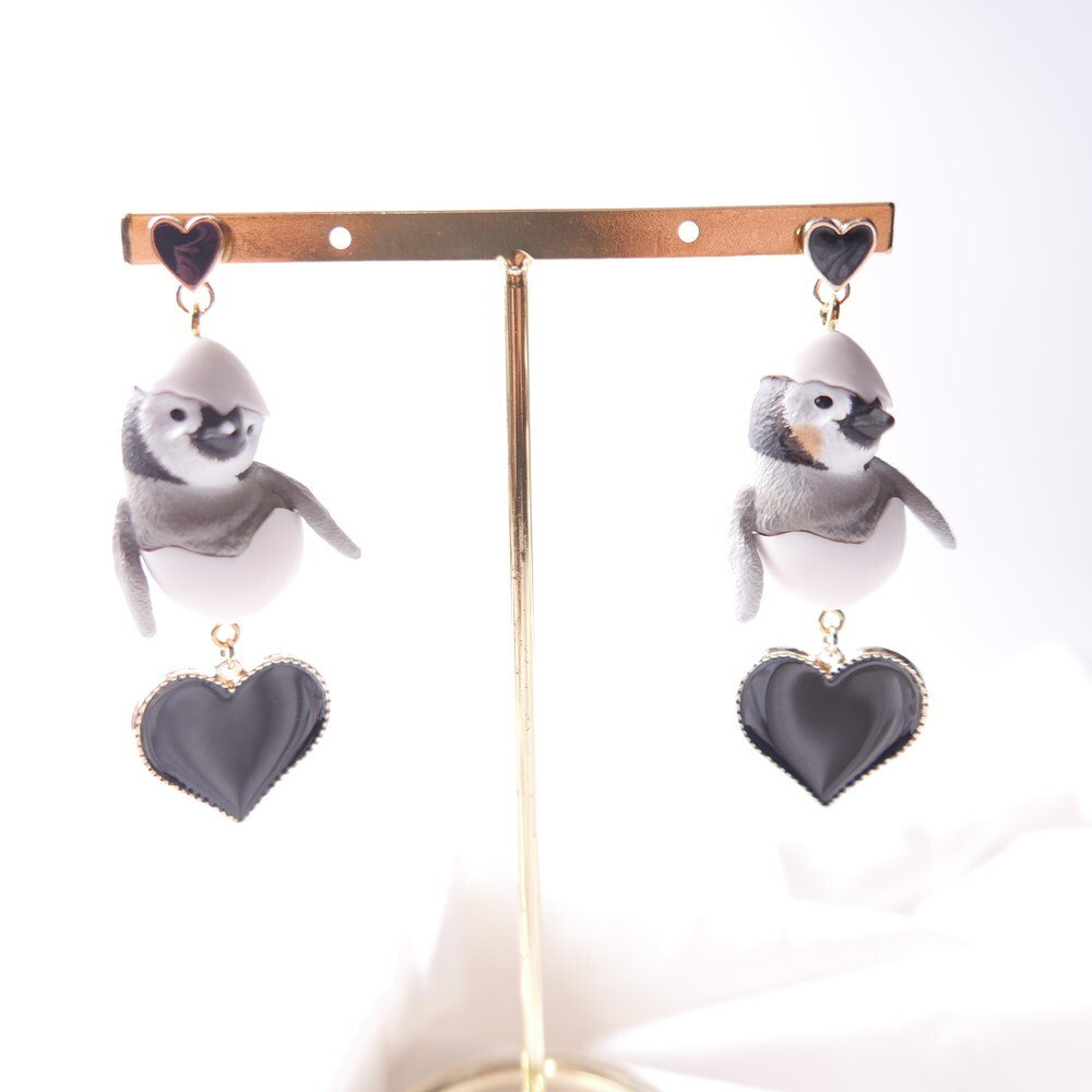 These adorable earrings feature a tiny penguin (Koupen-Chan) peeking out of an eggshell, paired with a bold black heart charm below. The clean black-and-white color contrast and the simple silhouette create a charming yet modern look that can easily elevate both casual and dressy outfits.