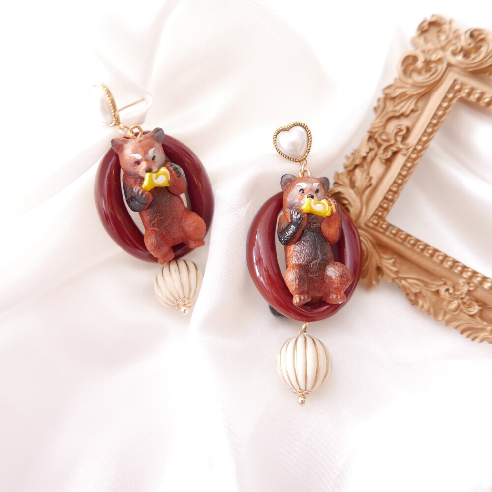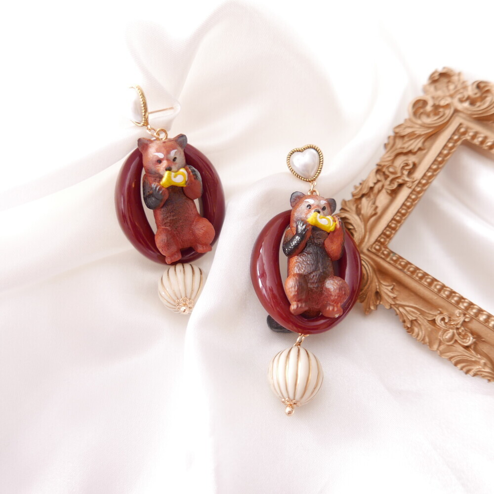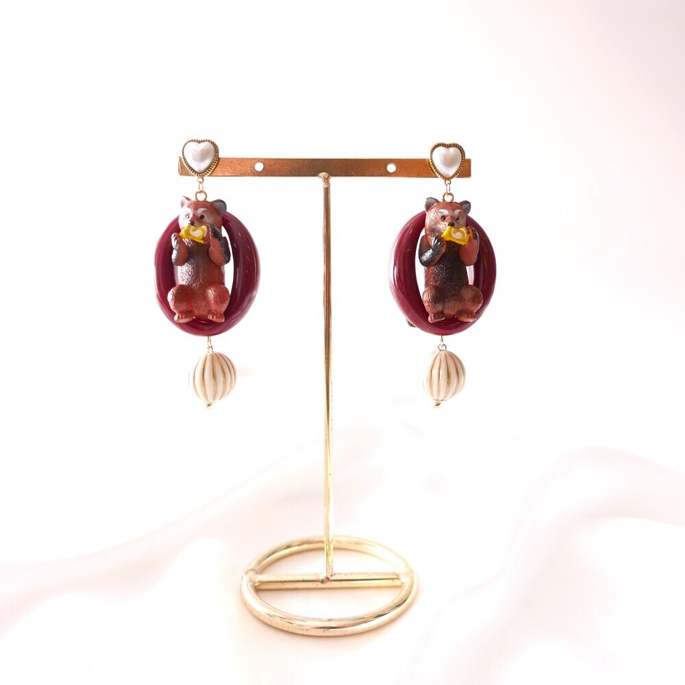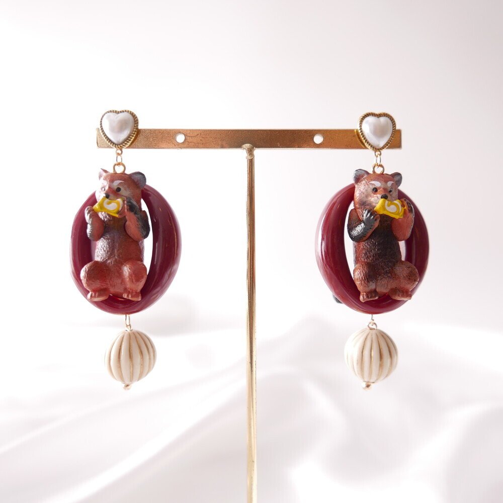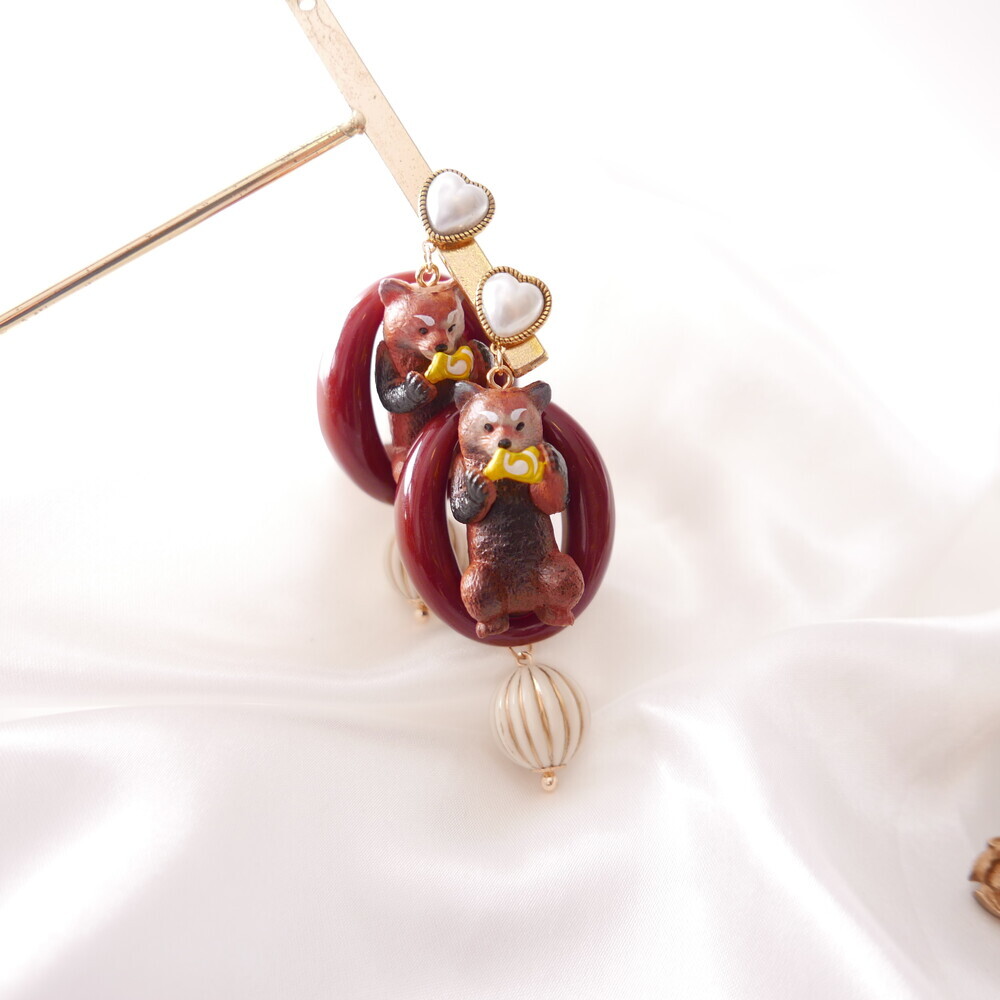 Say hello to the adorable Racoon earrings! These feature a sweet little raccoon happily munching on a croissant, framed by a bold burgundy hoop and accented with a cream-toned drop bead. The soft brown tones and whimsical design make this a standout accessory for playful fashion lovers.