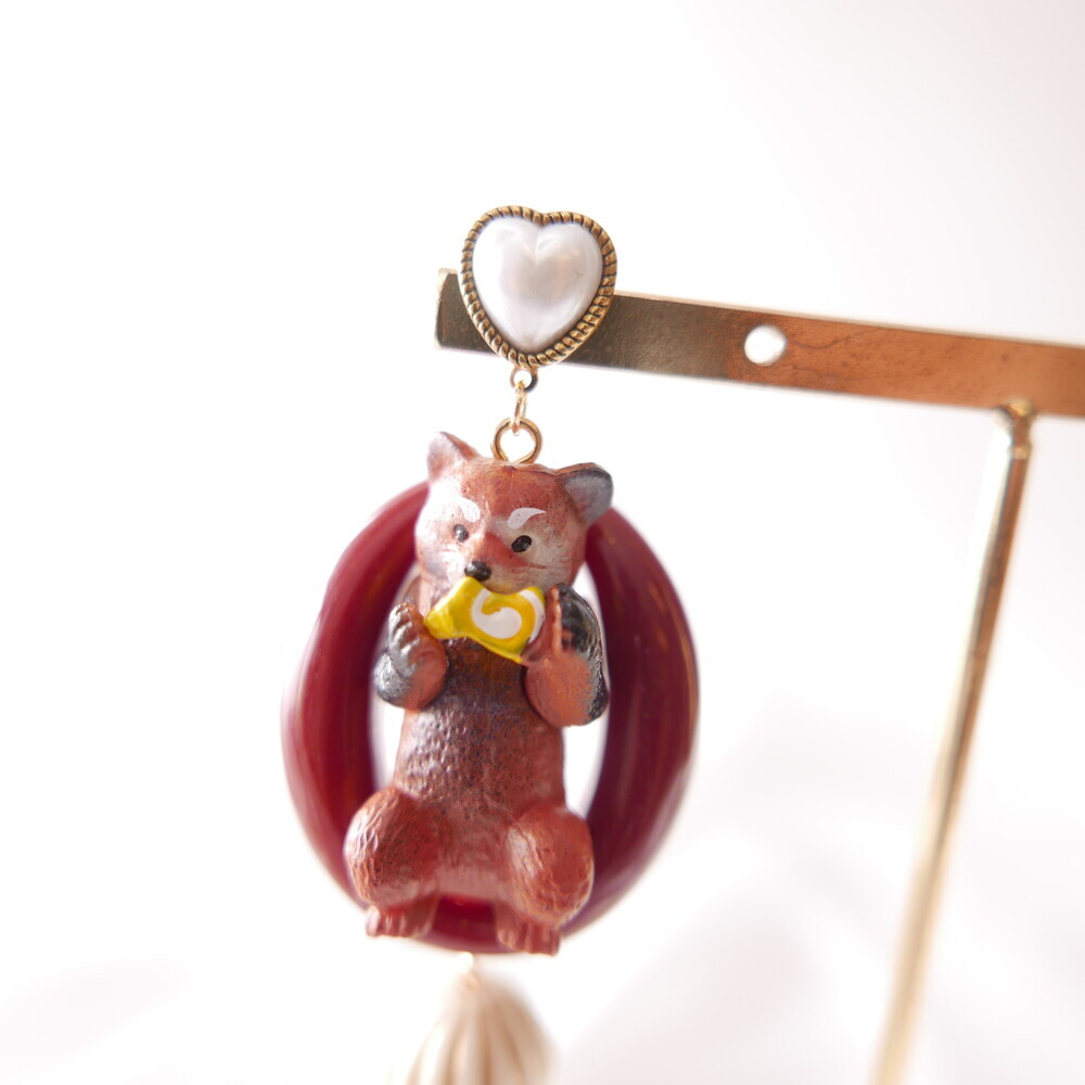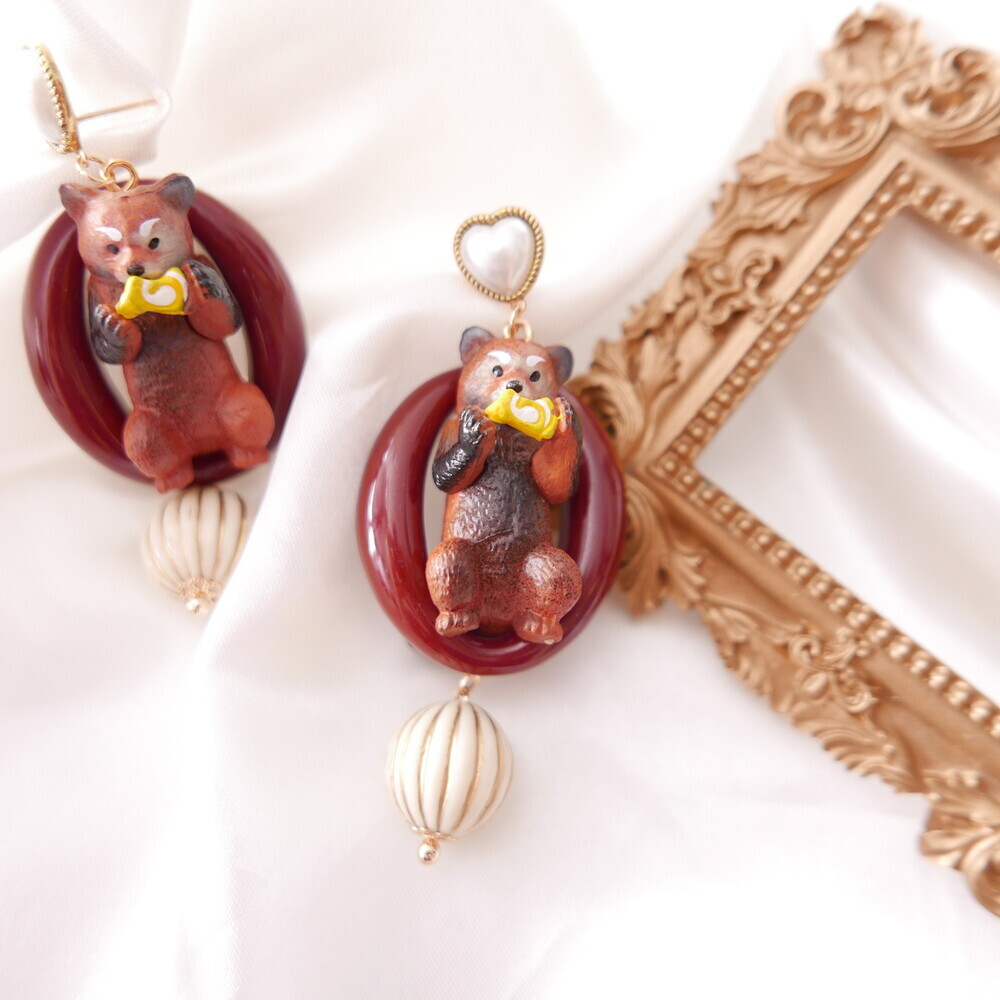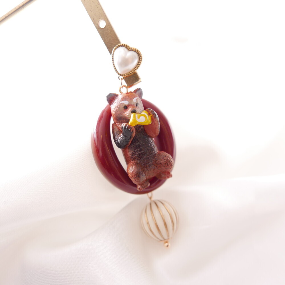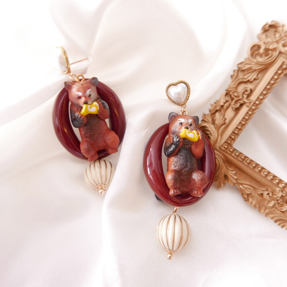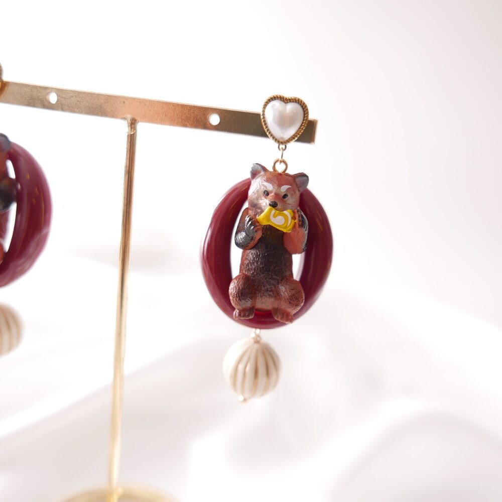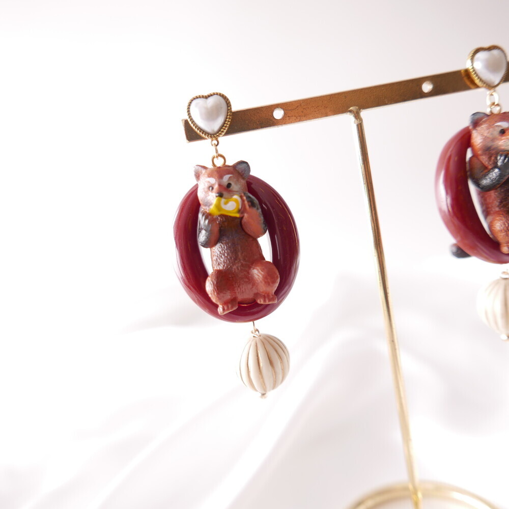 Say hello to the adorable Racoon earrings! These feature a sweet little raccoon happily munching on a croissant, framed by a bold burgundy hoop and accented with a cream-toned drop bead. The soft brown tones and whimsical design make this a standout accessory for playful fashion lovers.