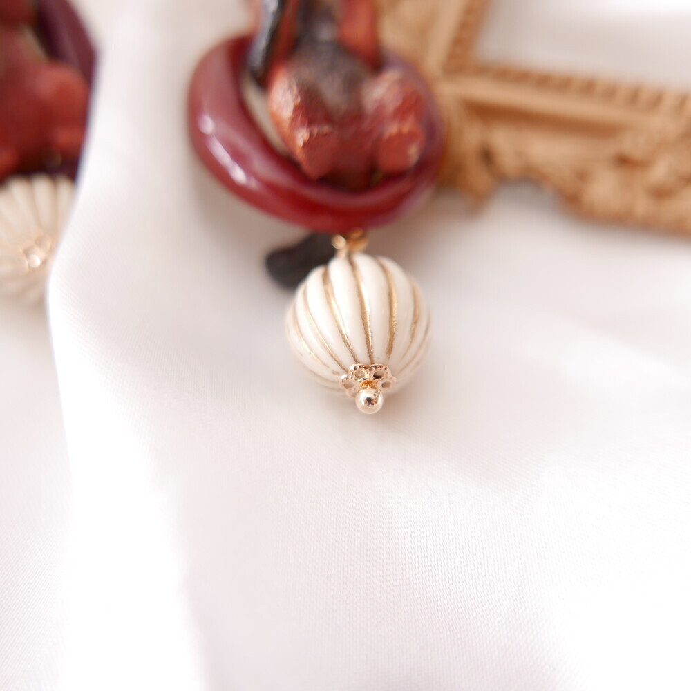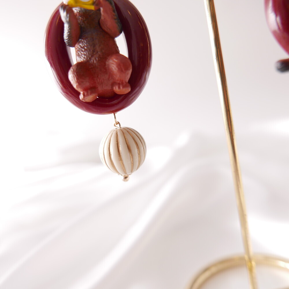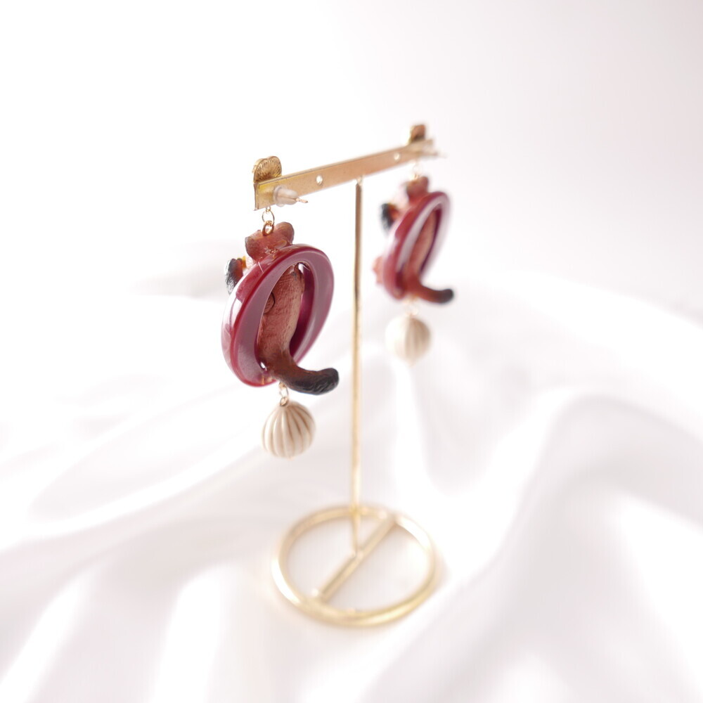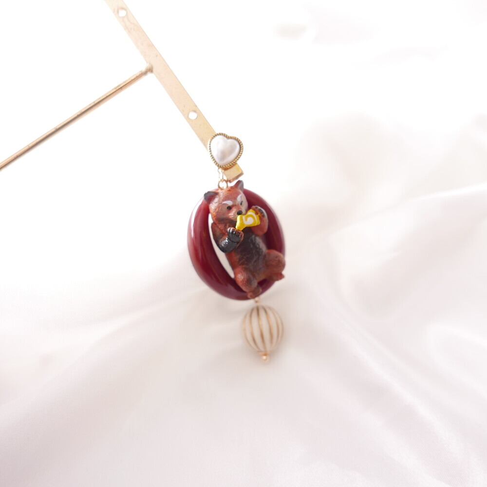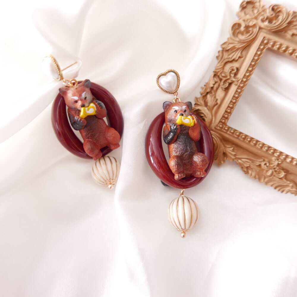 Say hello to the adorable Racoon earrings! These feature a sweet little raccoon happily munching on a croissant, framed by a bold burgundy hoop and accented with a cream-toned drop bead. The soft brown tones and whimsical design make this a standout accessory for playful fashion lovers.
