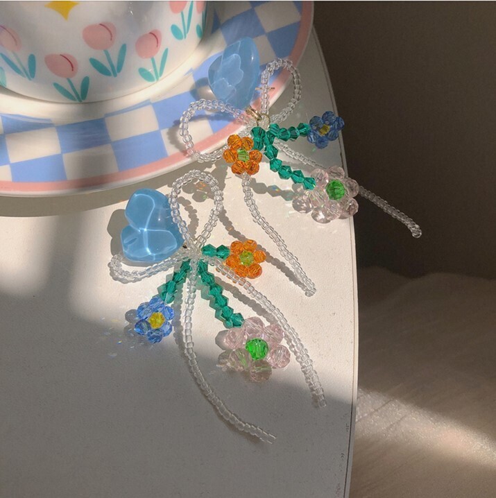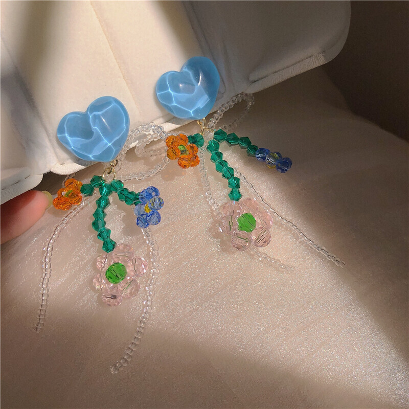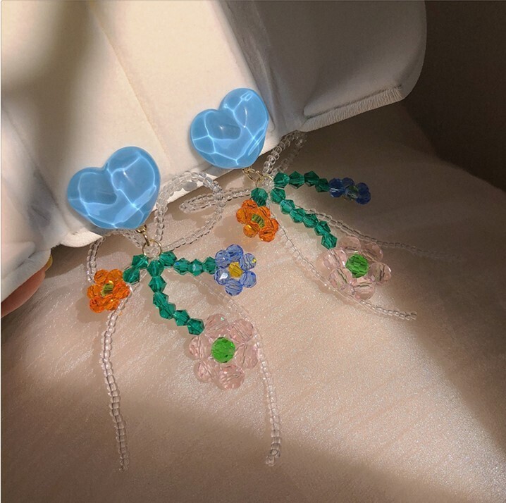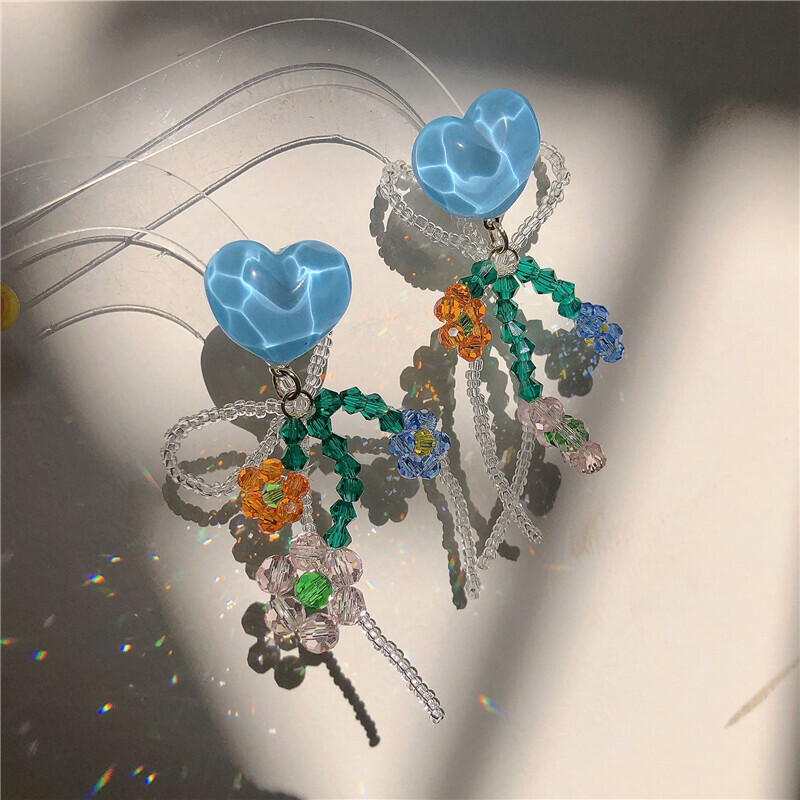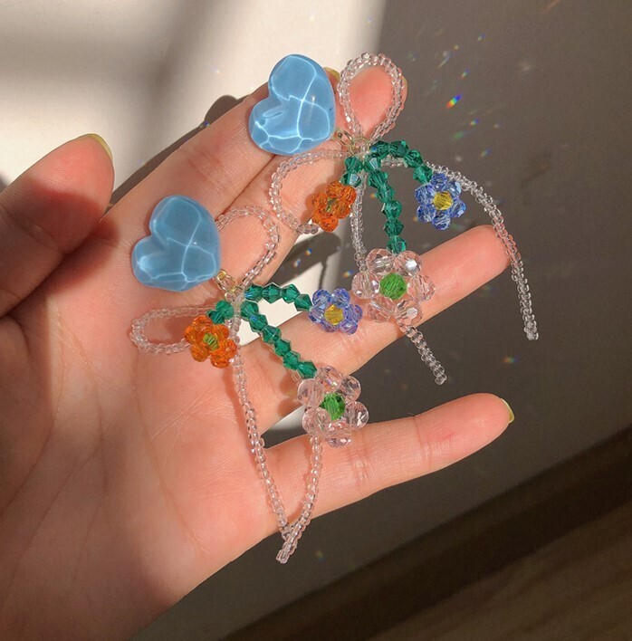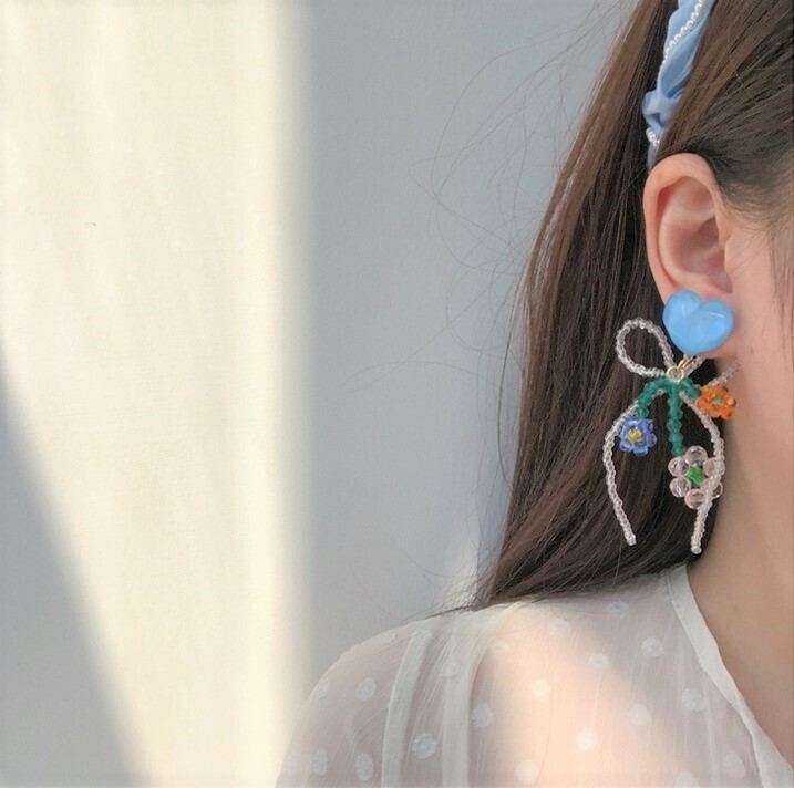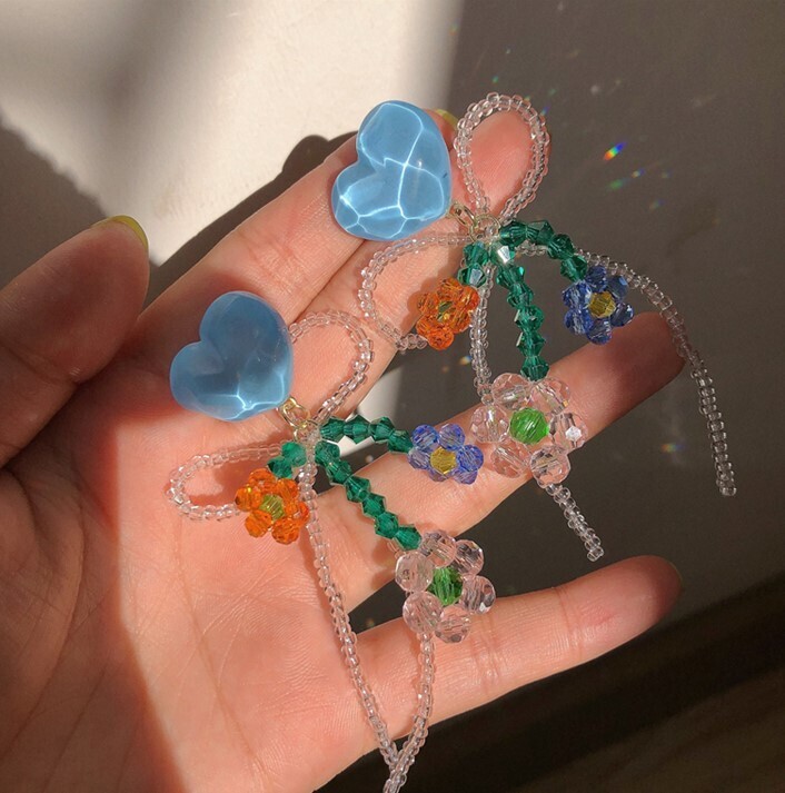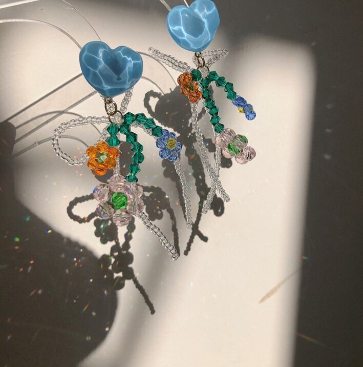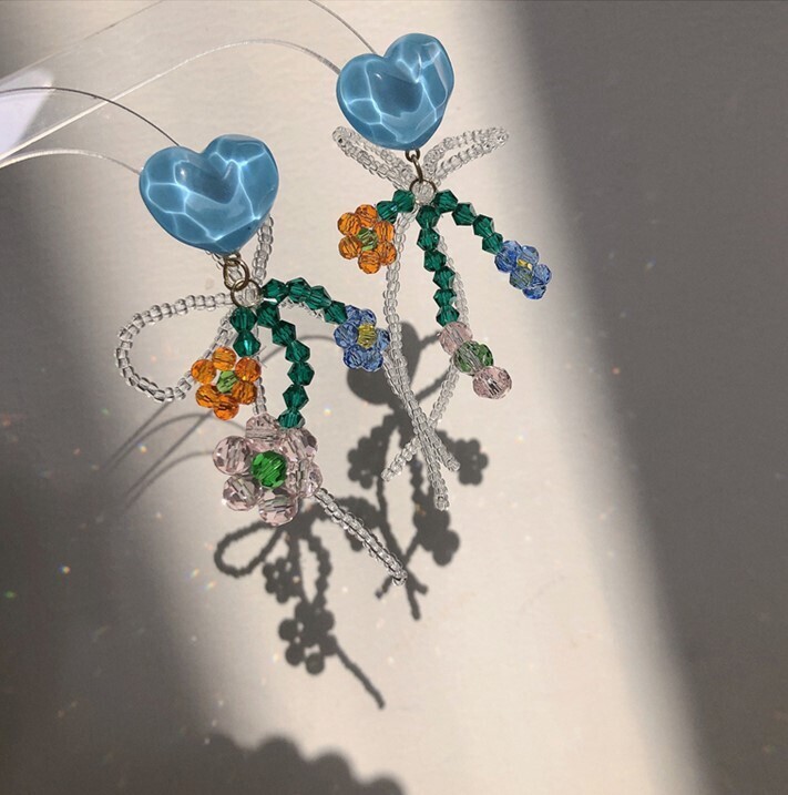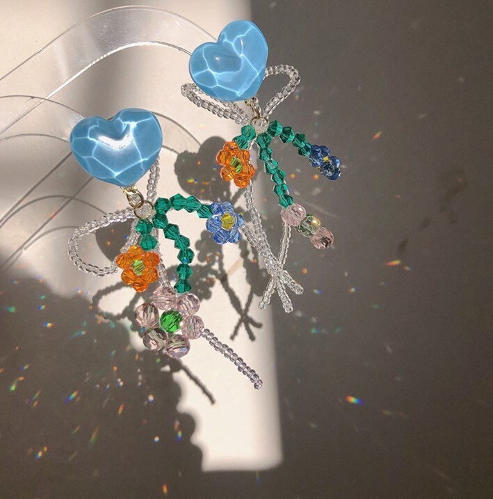 A dreamy bouquet in earring form!These handmade earrings combine a translucent blue heart, delicate glass beads, and colorful floral accents to bring a playful, romantic mood to any look.
