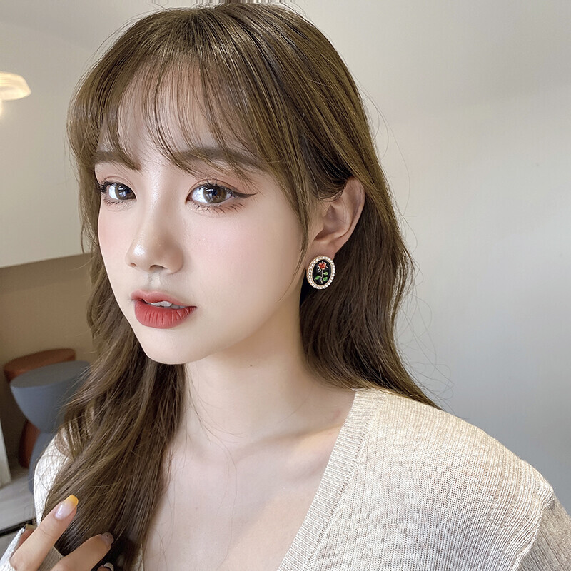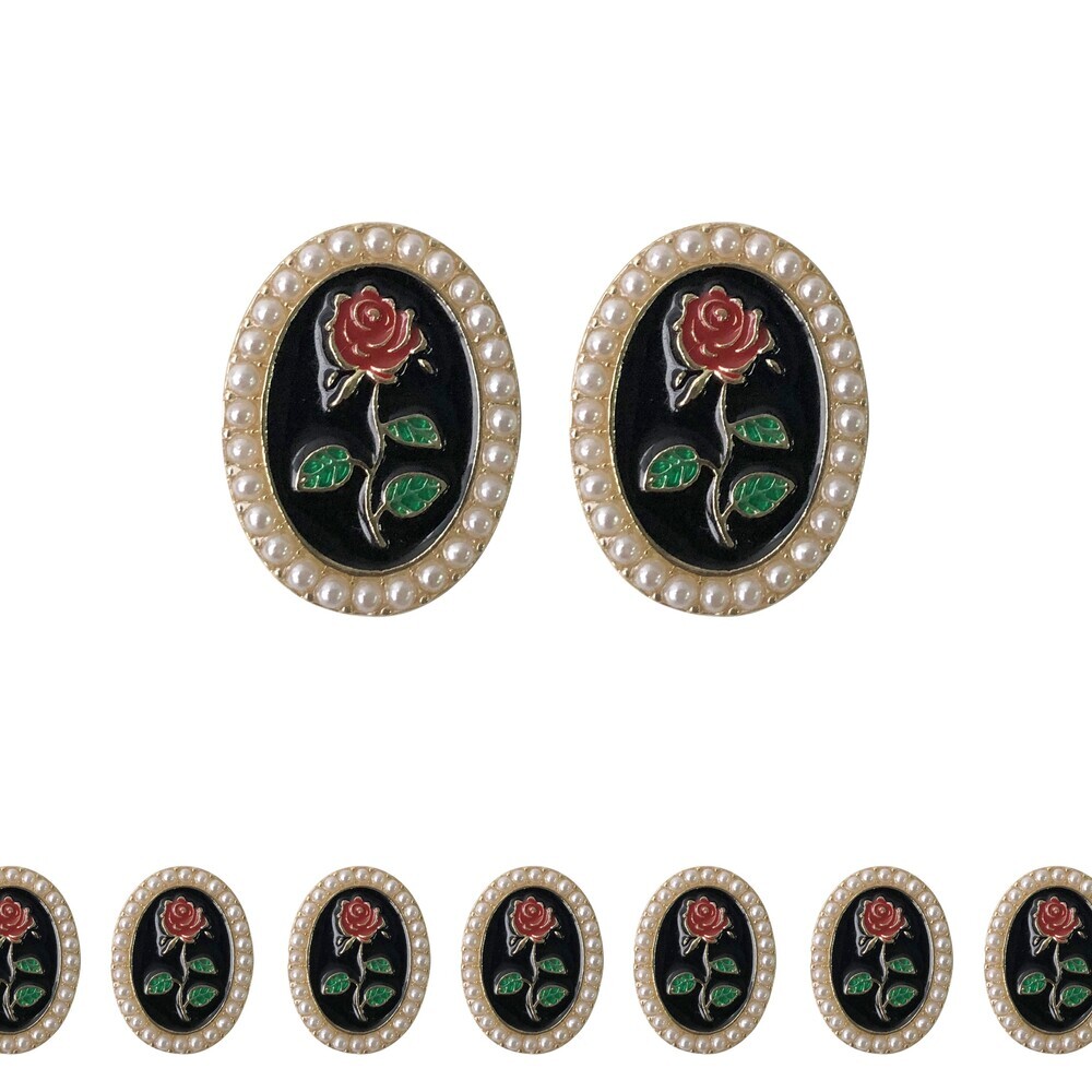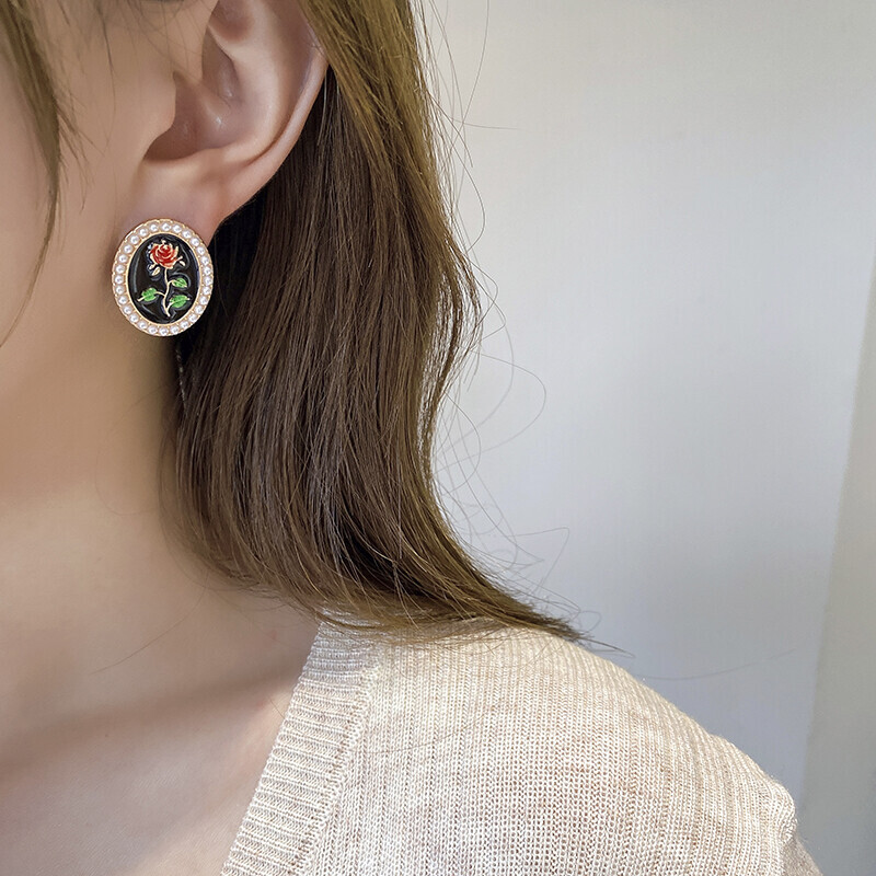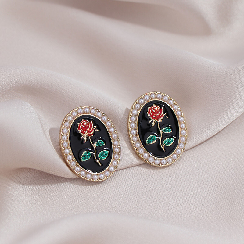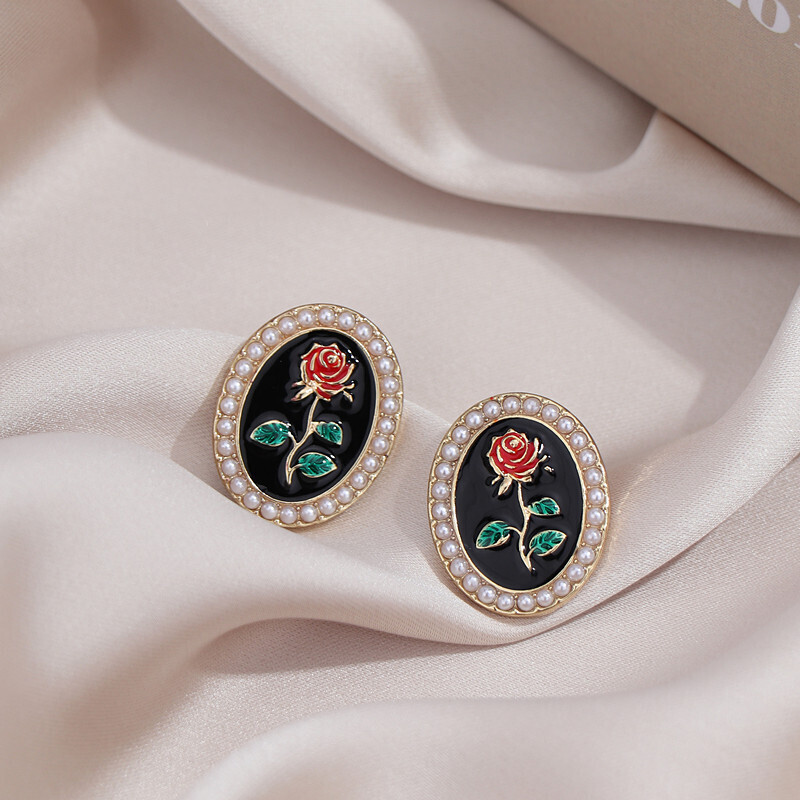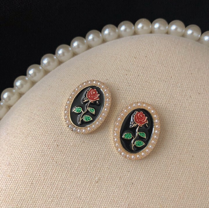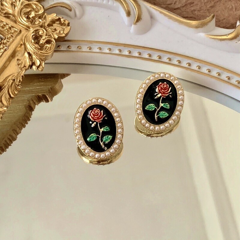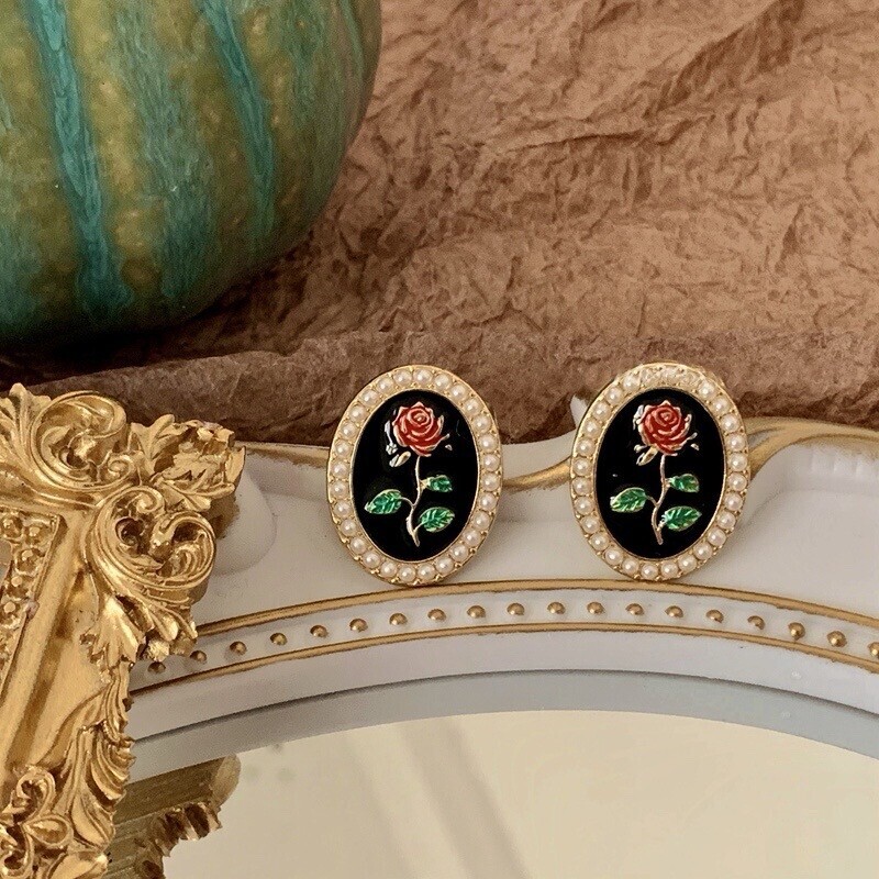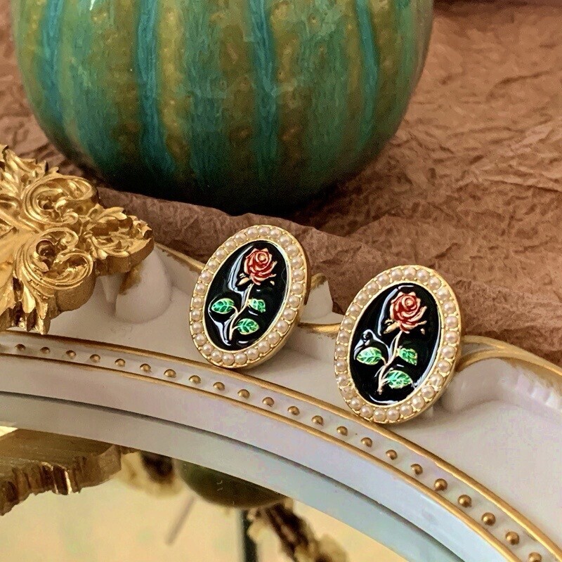 A rose from the past —The Grandma’s Vanity Earrings feature a romantic rose motif encased in an oval black enamel setting, surrounded by a delicate pearl frame.Inspired by the timeless elegance of heirloom jewelry, these vintage-style earrings add charm to any look.
