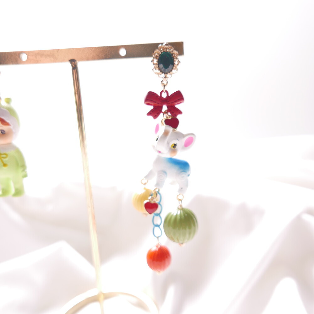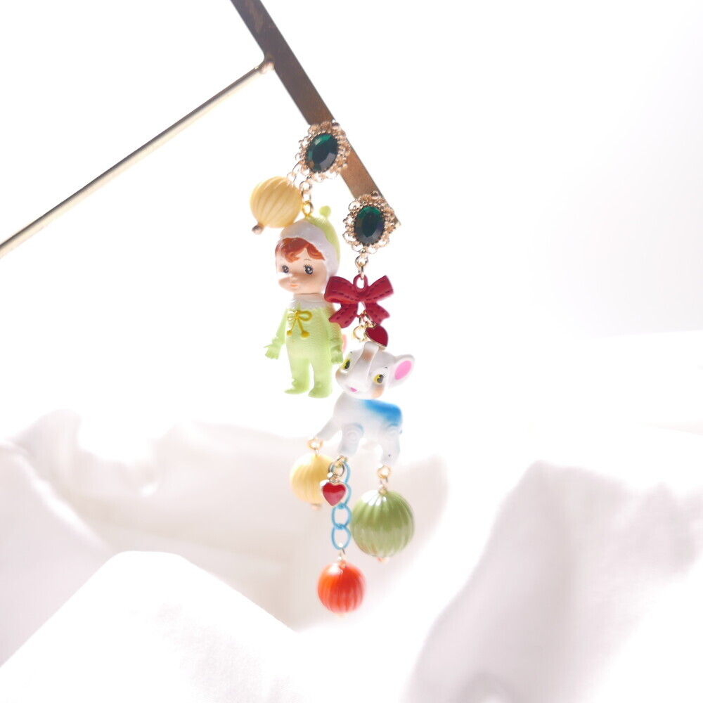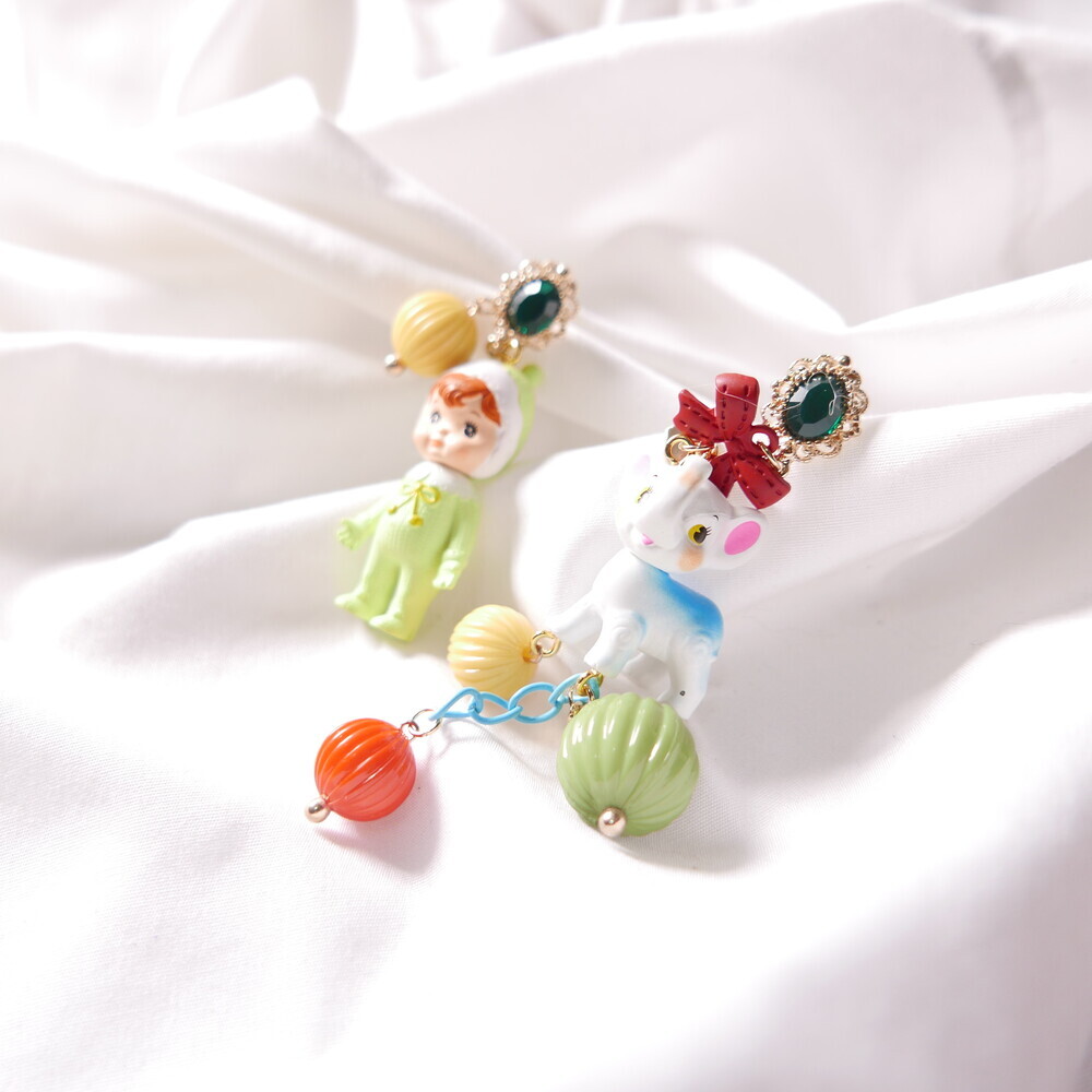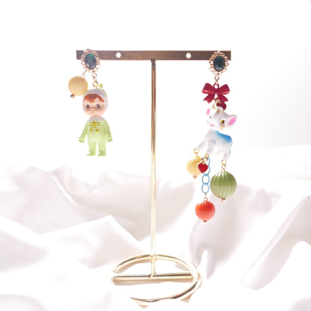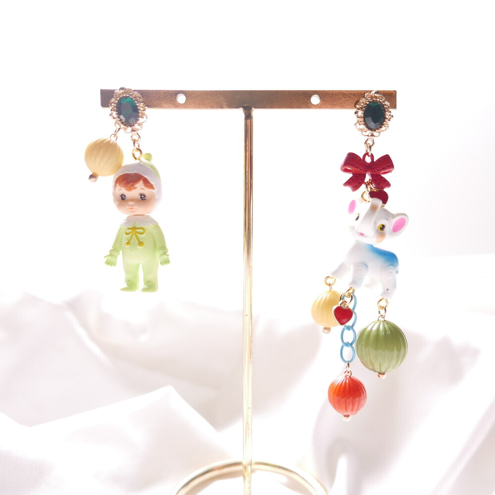 A nostalgic charm brought to life! This mismatched pair features a retro-style baby figure (Akachan) and a playful elephant toy with colorful dangling beads. The bright, kitschy palette and unexpected combination make these earrings irresistibly cute and eye-catching.