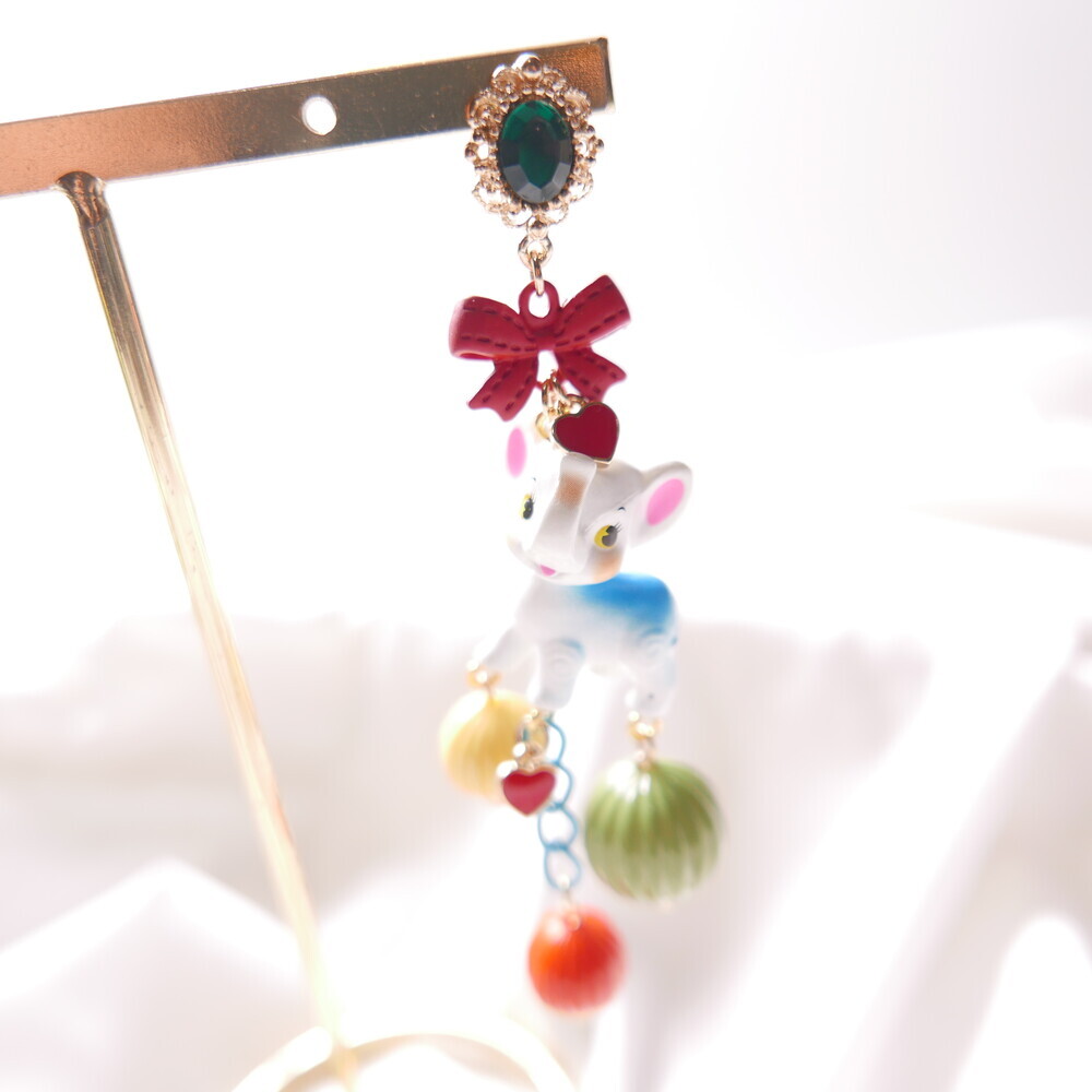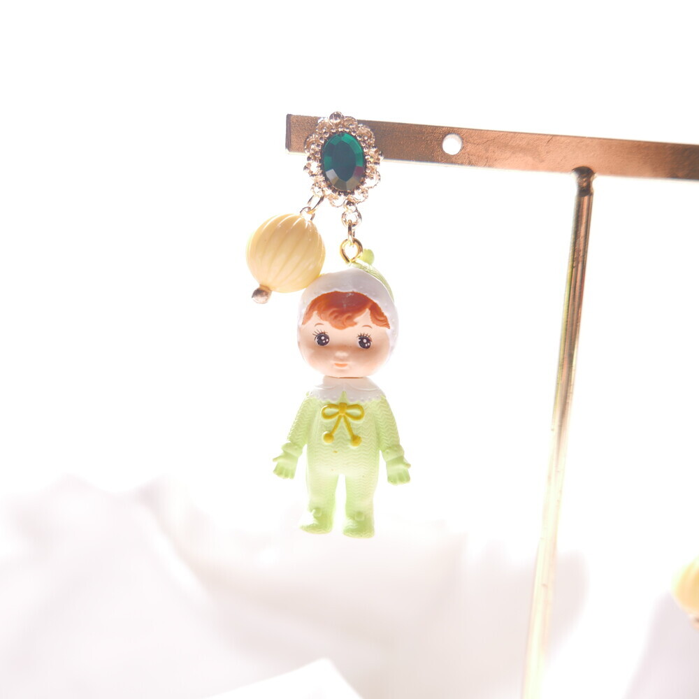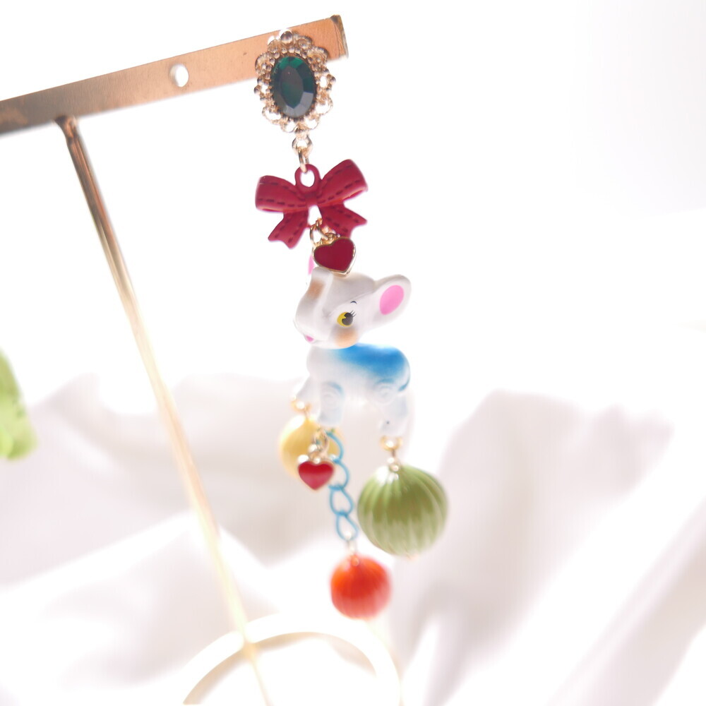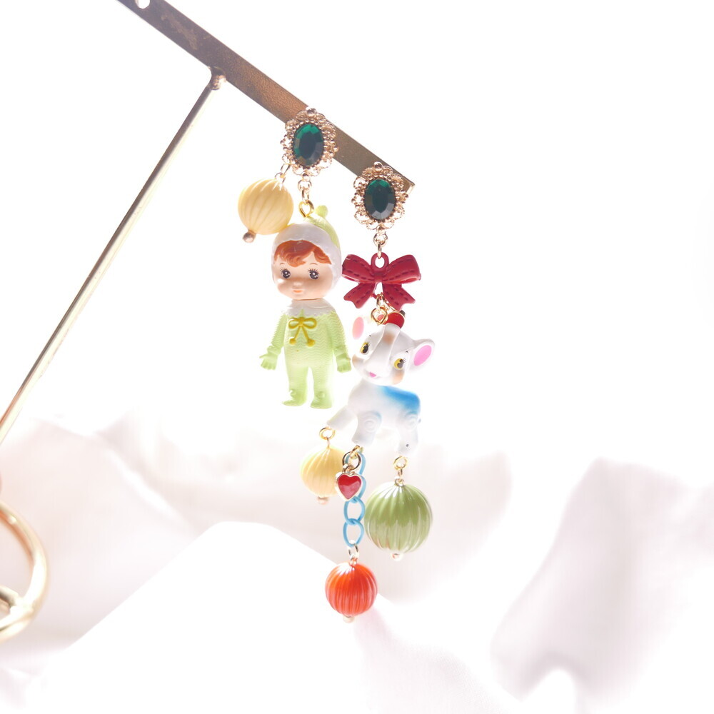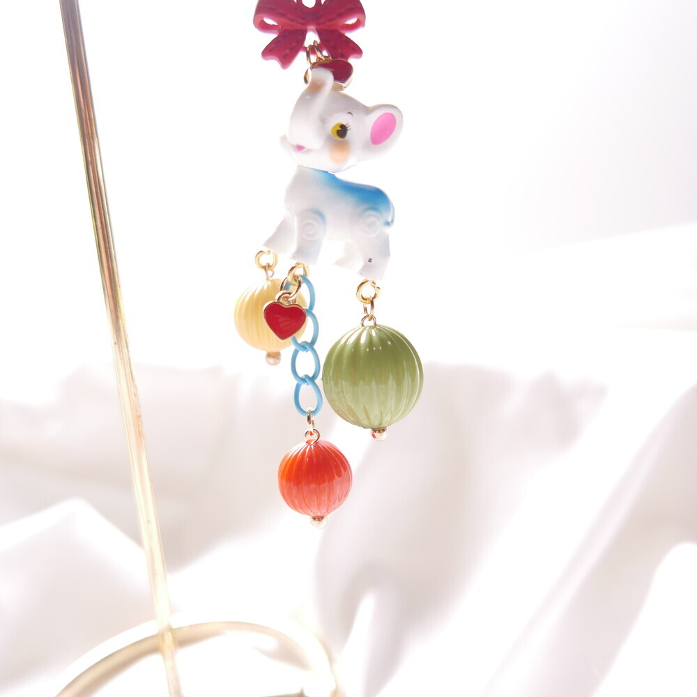 A nostalgic charm brought to life! This mismatched pair features a retro-style baby figure (Akachan) and a playful elephant toy with colorful dangling beads. The bright, kitschy palette and unexpected combination make these earrings irresistibly cute and eye-catching.