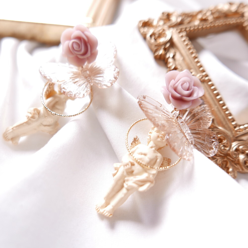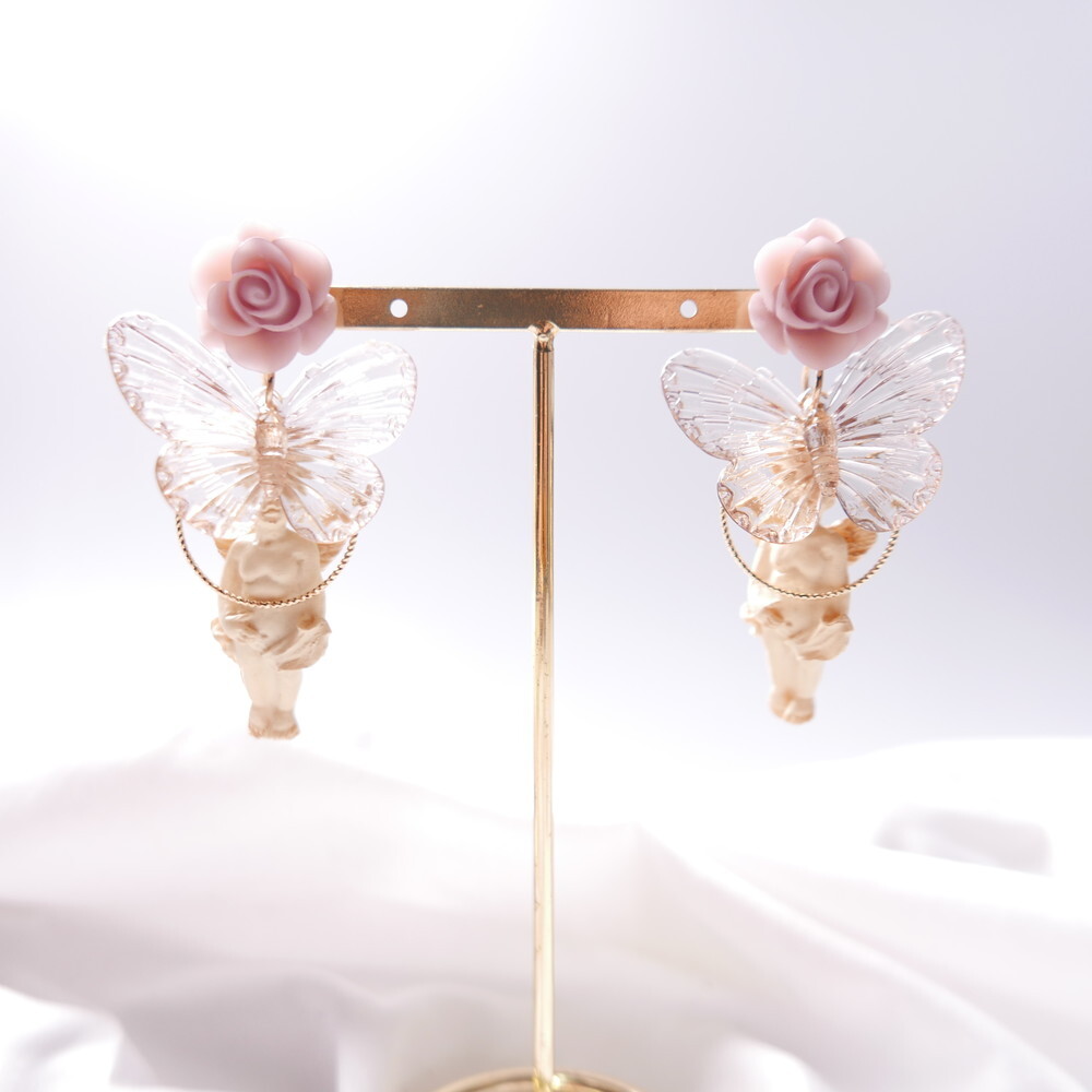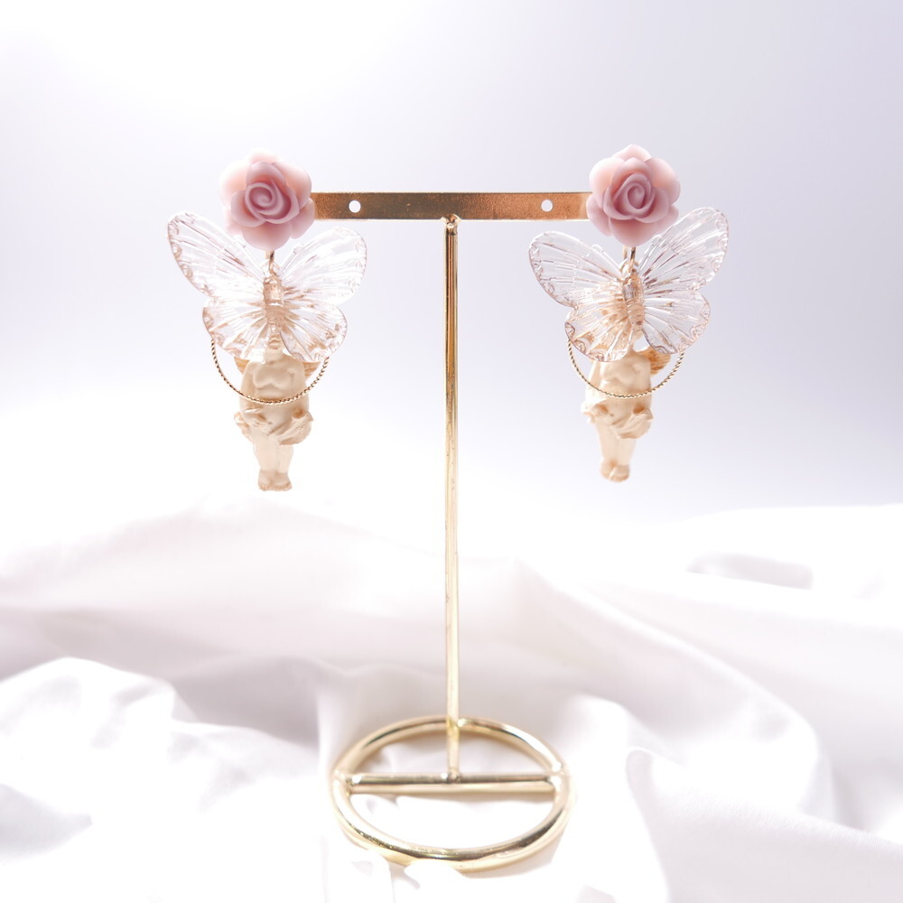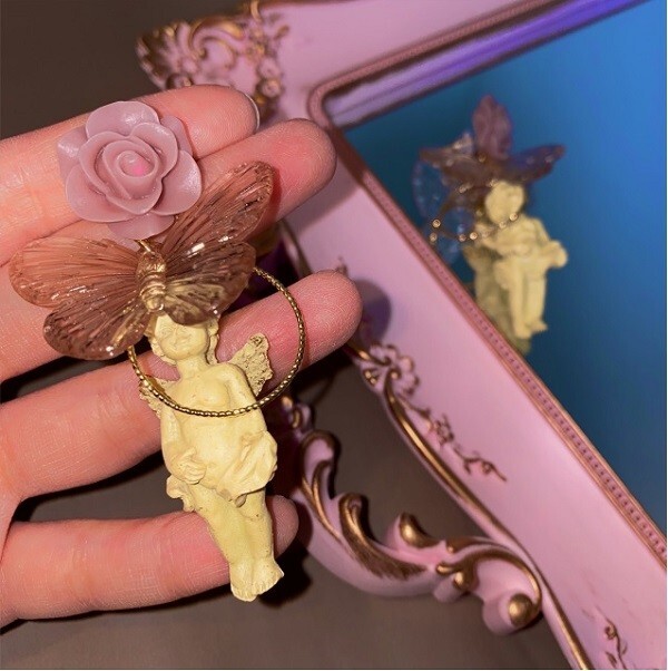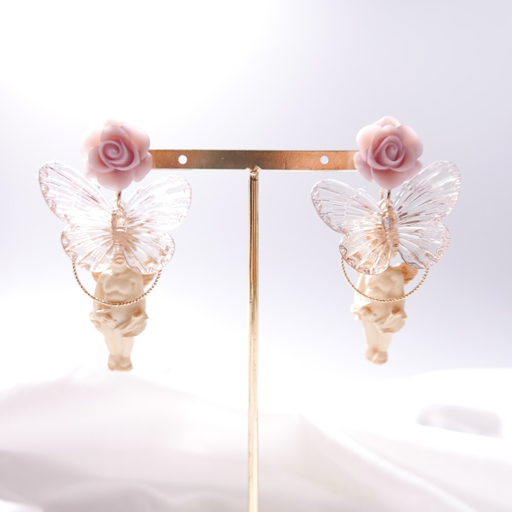 A dreamy combination of a vintage-style cherub, delicate butterfly wings, and a soft rose stud. The dusty rose flower base supports a floating clear butterfly and a sweet angel figurine, gently framed with a gold hoop. This piece blends antique charm with a modern, kitschy vibe.