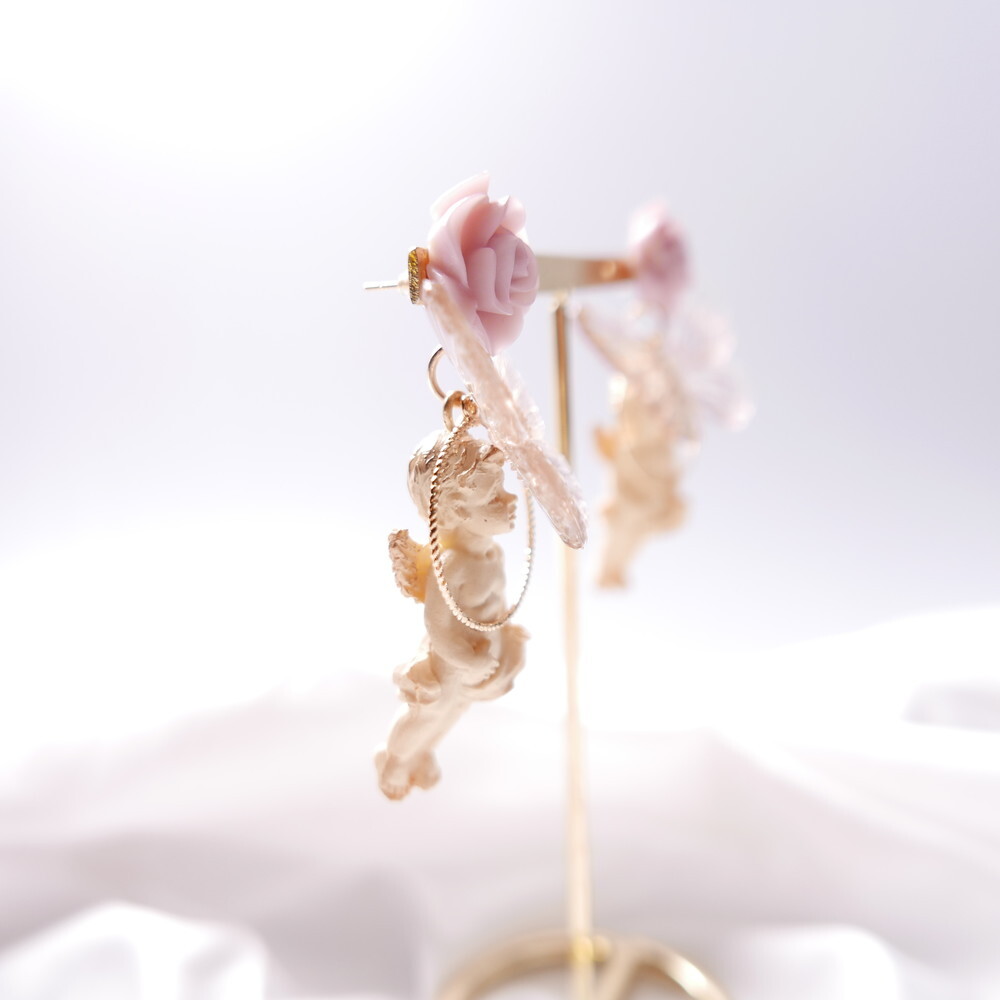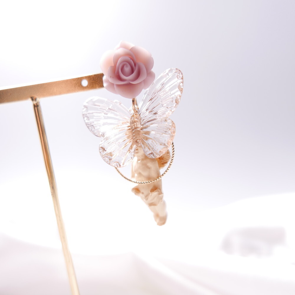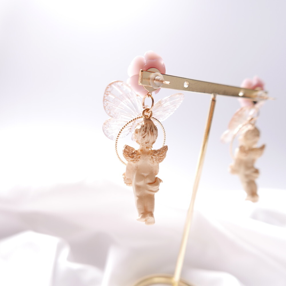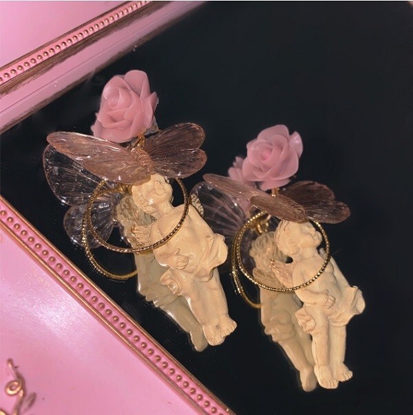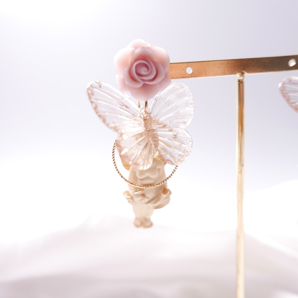A dreamy combination of a vintage-style cherub, delicate butterfly wings, and a soft rose stud. The dusty rose flower base supports a floating clear butterfly and a sweet angel figurine, gently framed with a gold hoop. This piece blends antique charm with a modern, kitschy vibe.