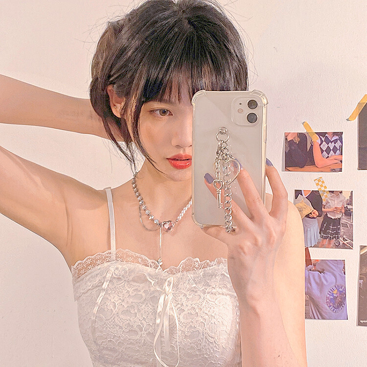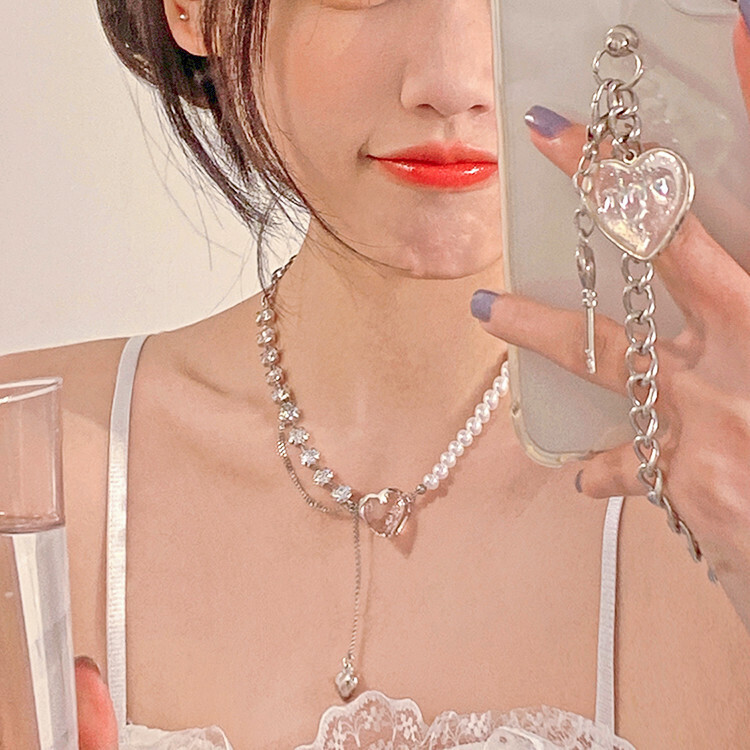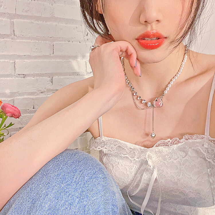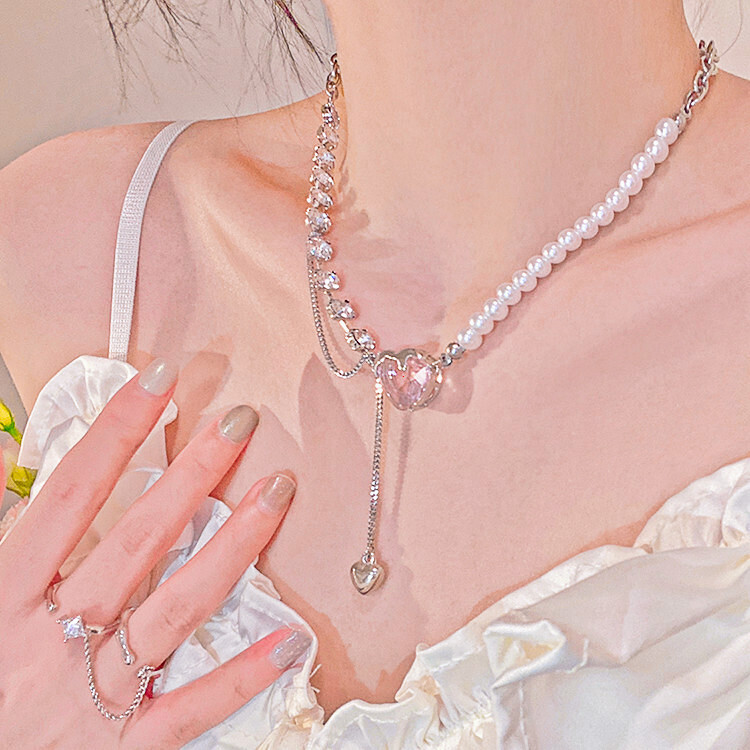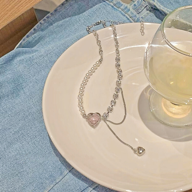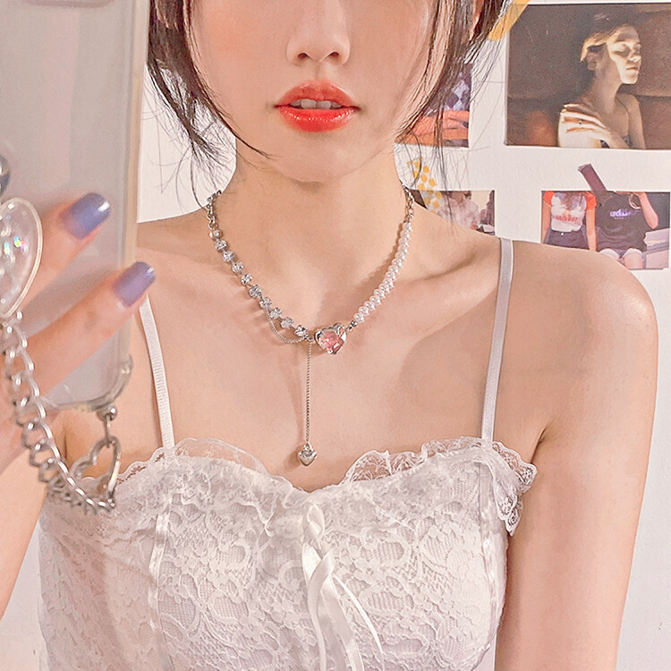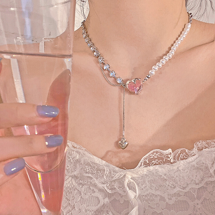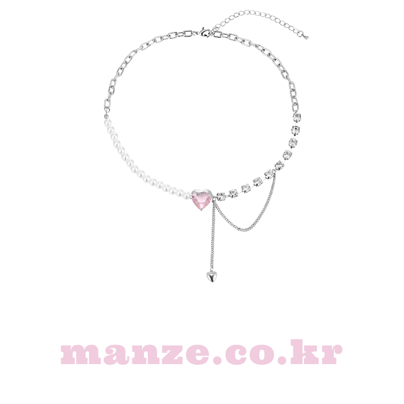 Fall in love with the perfect balance of edgy and sweet. This unique choker features a romantic pink heart pendant nestled between a bold rhinestone chain and classic pearls. Draping silver chains add movement and charm for an effortlessly stylish look.