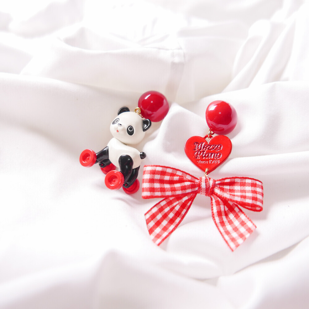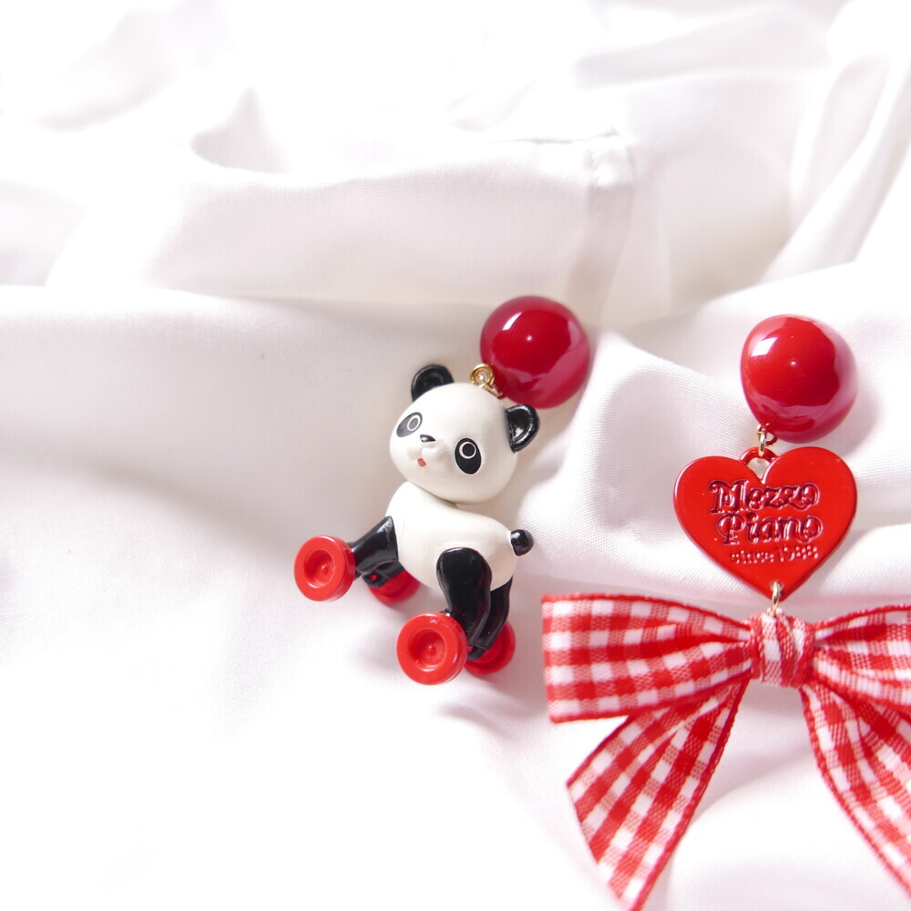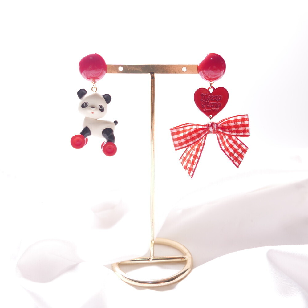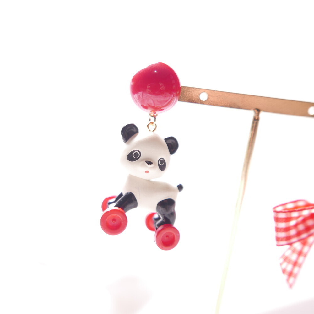This playful earring set features a panda riding a tiny toy horse—its wheels actually spin!Paired with a red gingham ribbon and heart charm, this piece brings nostalgic joy and quirky flair to your outfit.Crafted with a rare, limited-edition toy component for added charm and collectability.