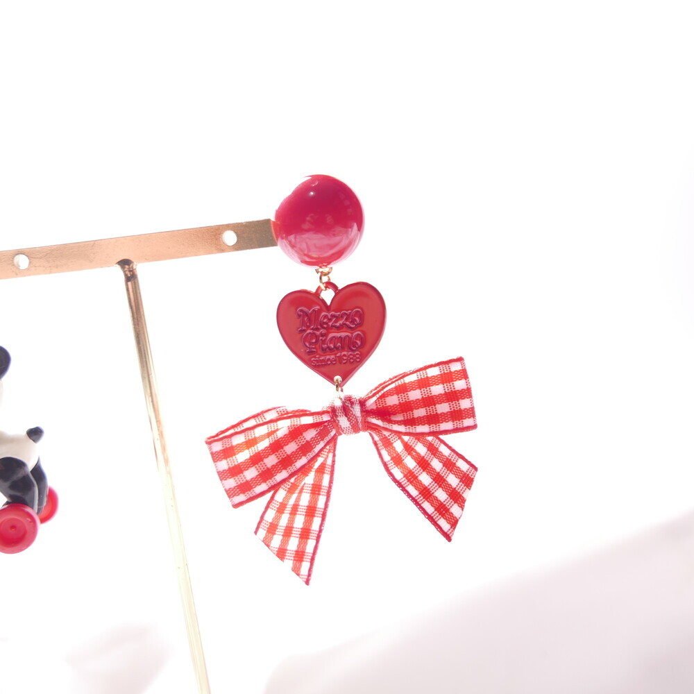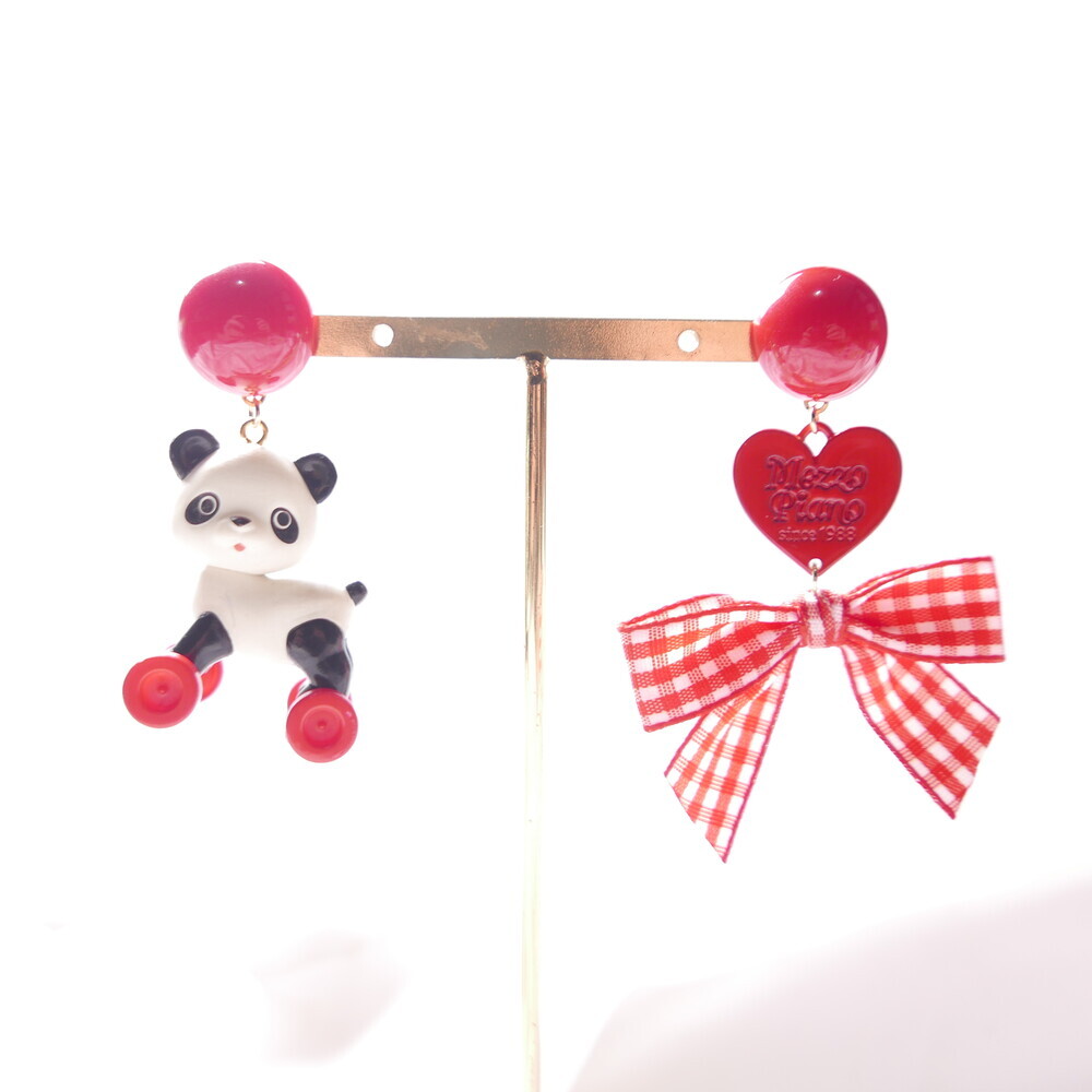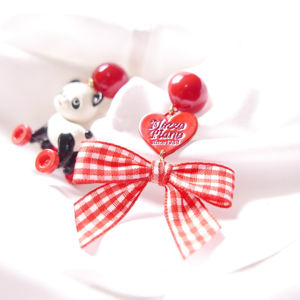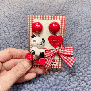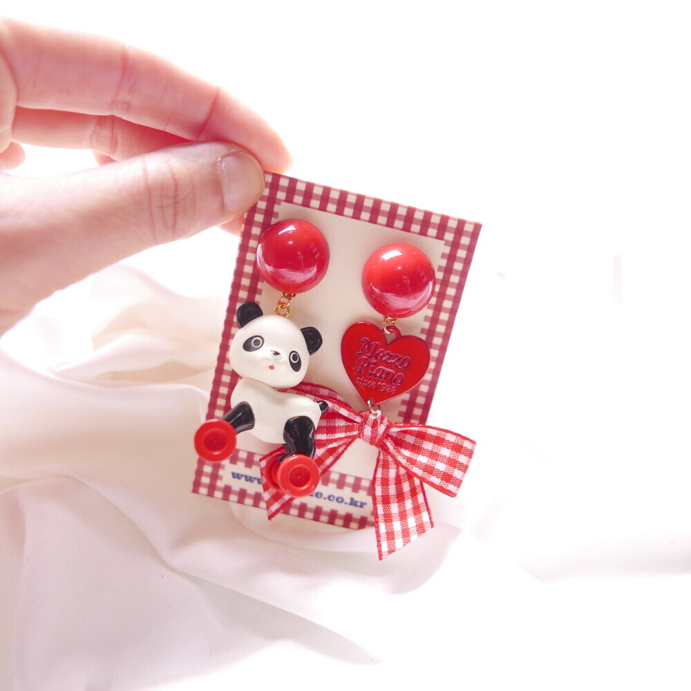 This playful earring set features a panda riding a tiny toy horse—its wheels actually spin!Paired with a red gingham ribbon and heart charm, this piece brings nostalgic joy and quirky flair to your outfit.Crafted with a rare, limited-edition toy component for added charm and collectability.