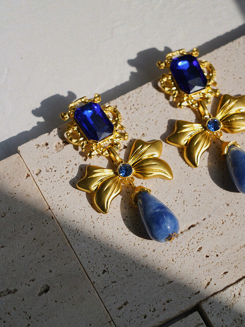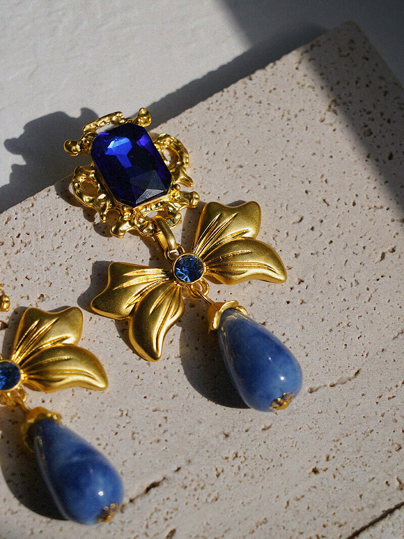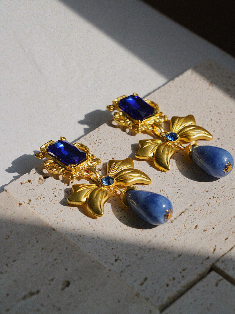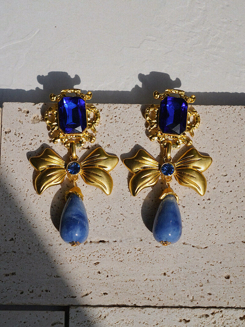A vivid blue gemstone paired with a golden bow and teardrop charm creates this enchanting statement earring. The elegance of deep sapphire tones and fluid design adds charm and glamour to any outfit. Made with Silver 92.5% posts for comfort and durability.