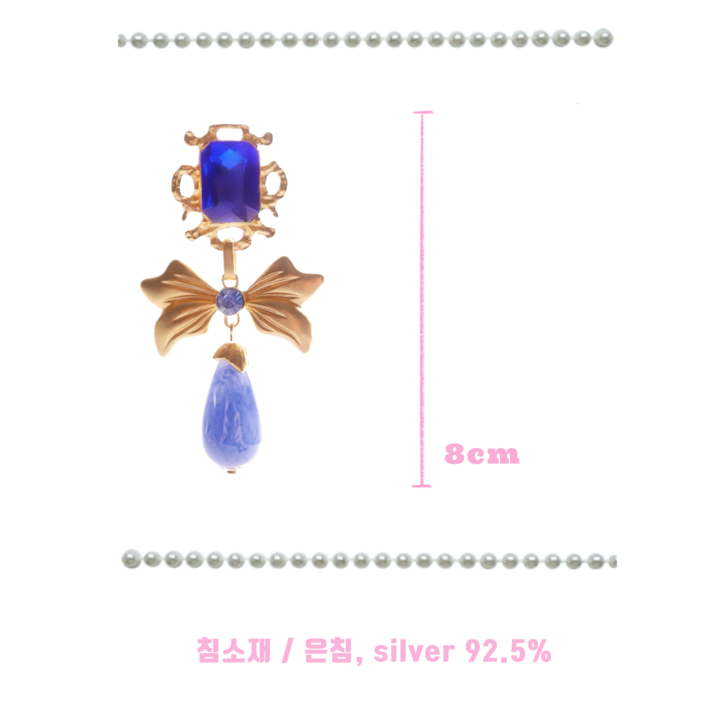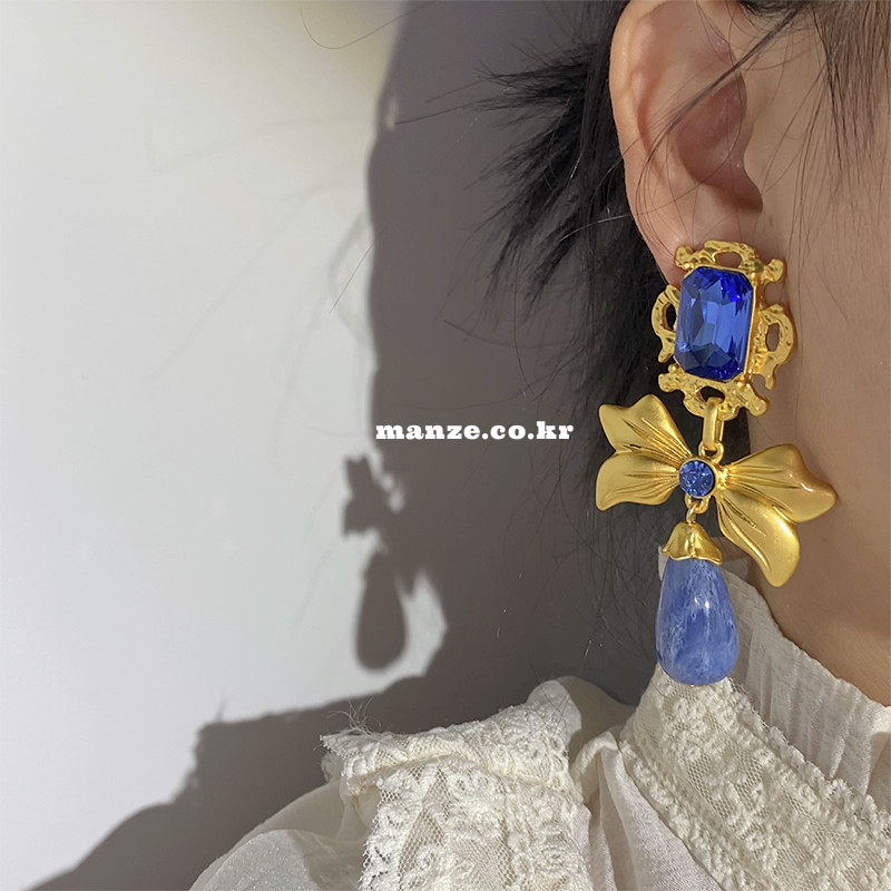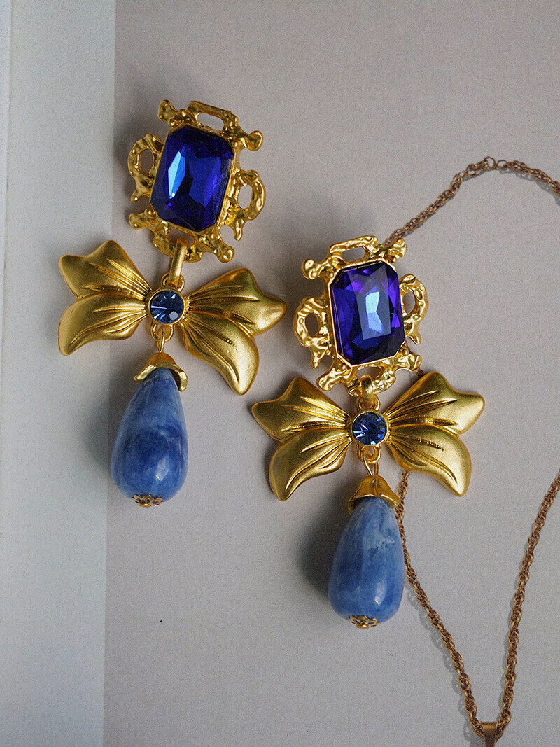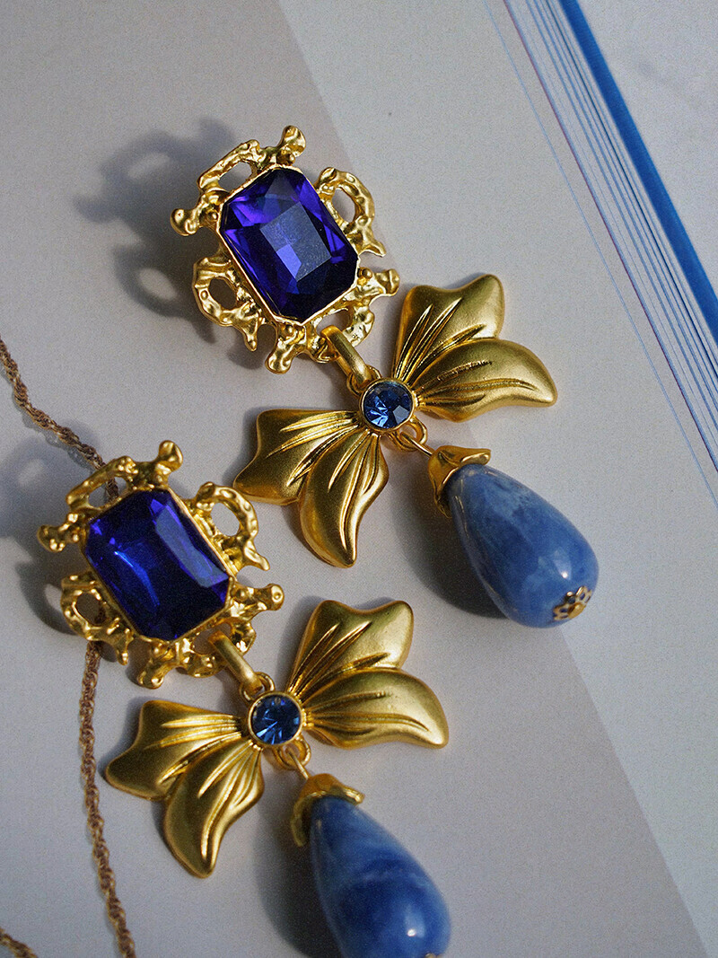 A vivid blue gemstone paired with a golden bow and teardrop charm creates this enchanting statement earring. The elegance of deep sapphire tones and fluid design adds charm and glamour to any outfit. Made with Silver 92.5% posts for comfort and durability.