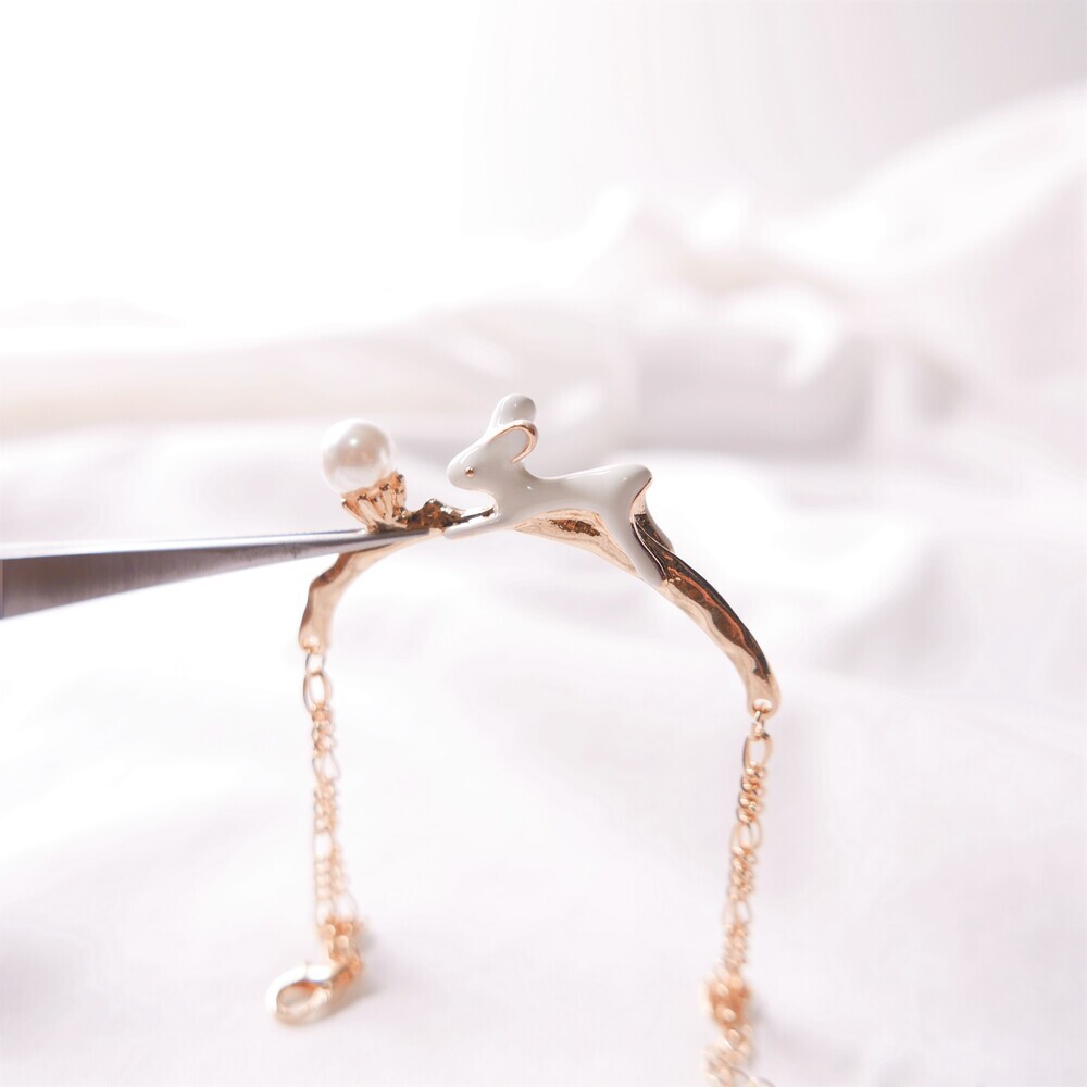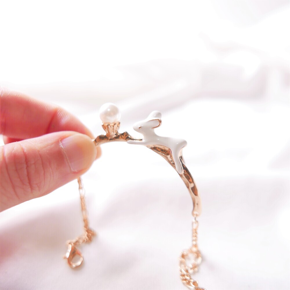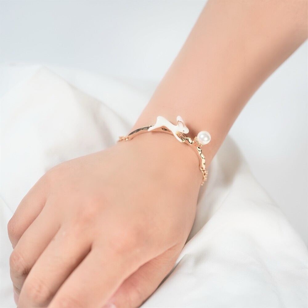 A soft white pearl and a charming little bunny meet in this lovely bracelet. The arched gold-tone frame gleams beautifully atop your wrist, making it a perfect accent piece for both casual and elegant outfits.