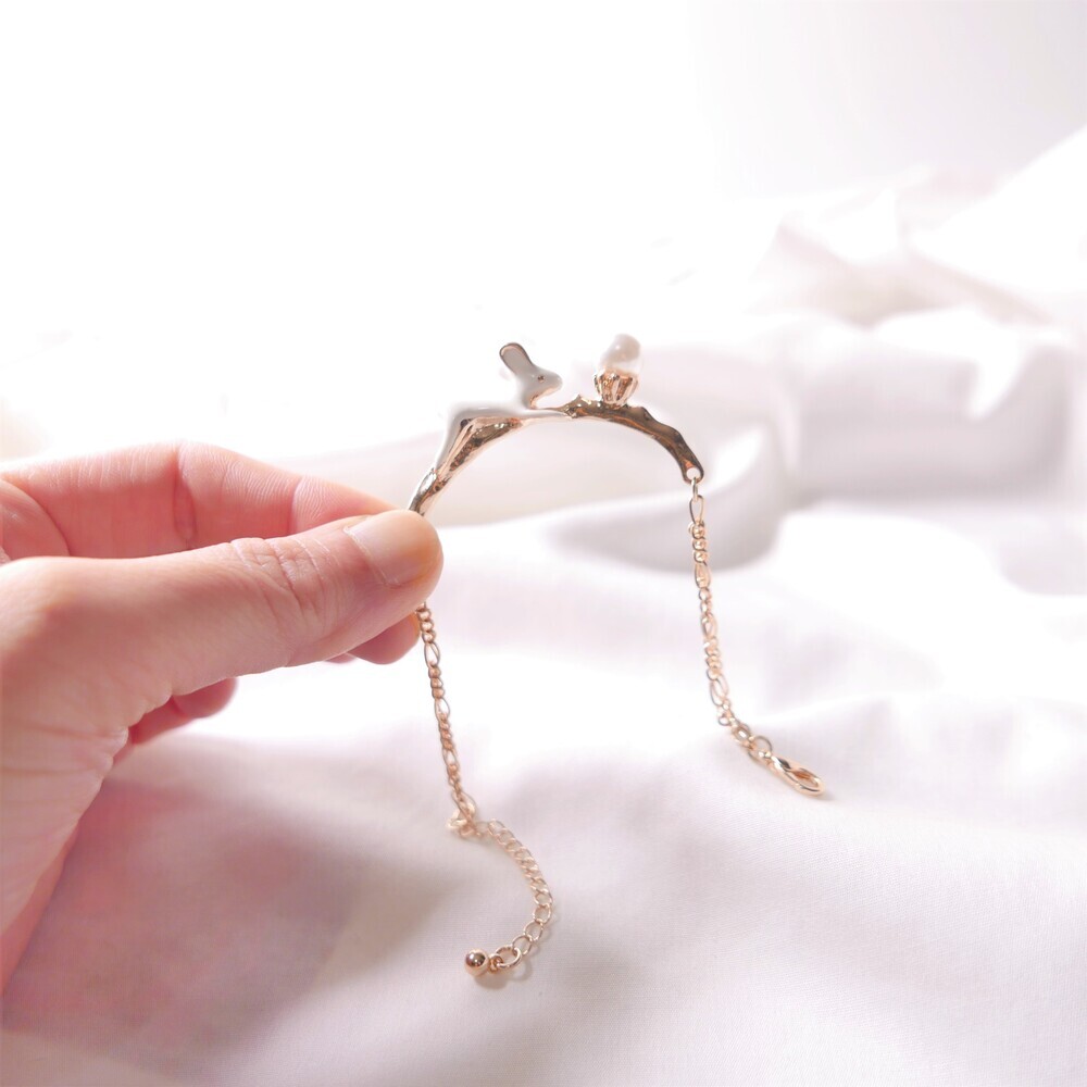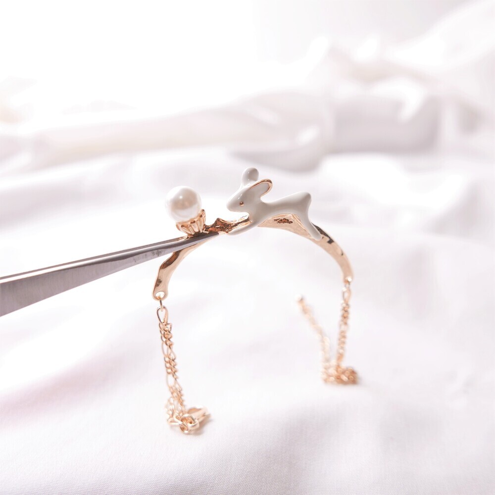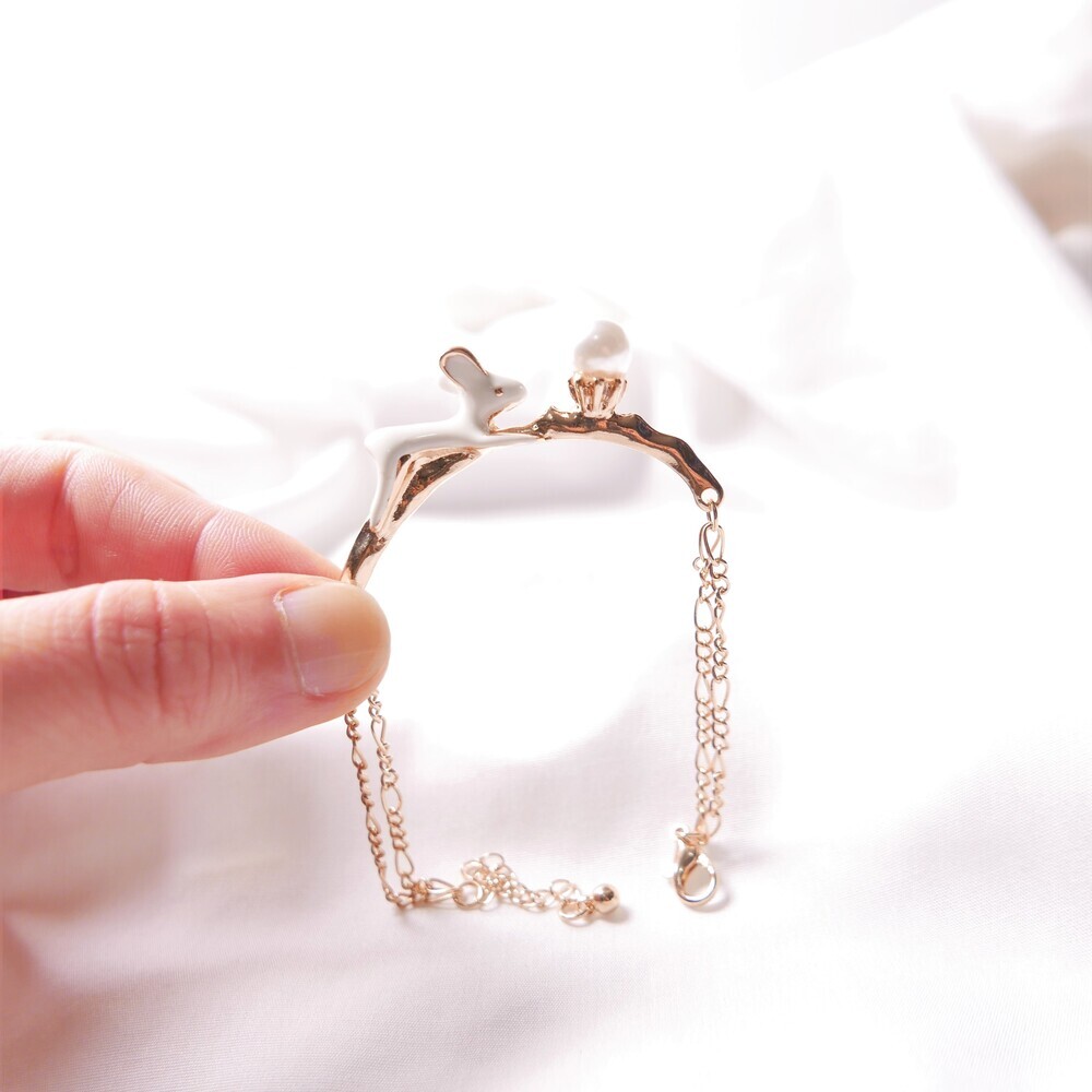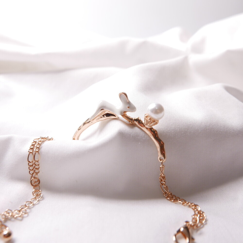 A soft white pearl and a charming little bunny meet in this lovely bracelet. The arched gold-tone frame gleams beautifully atop your wrist, making it a perfect accent piece for both casual and elegant outfits.
