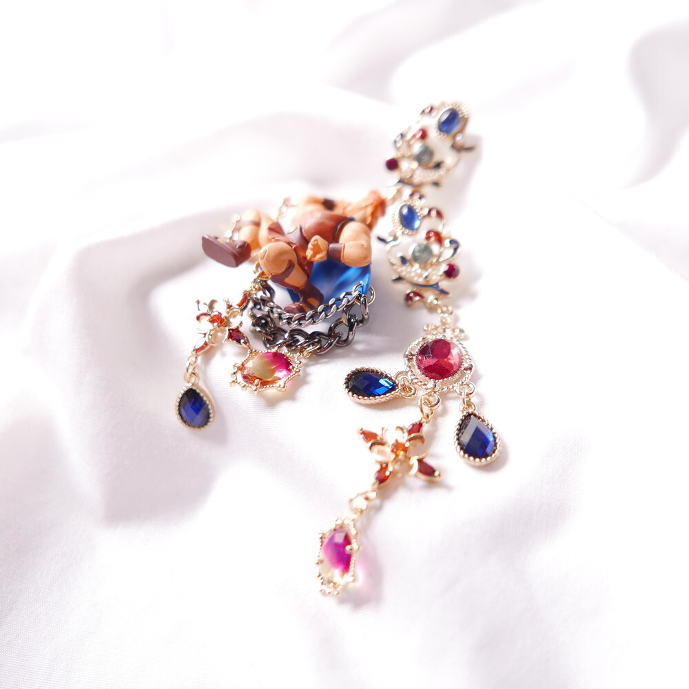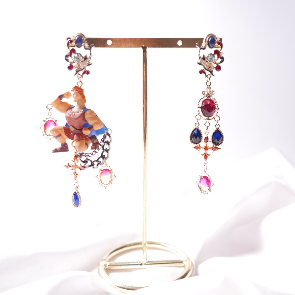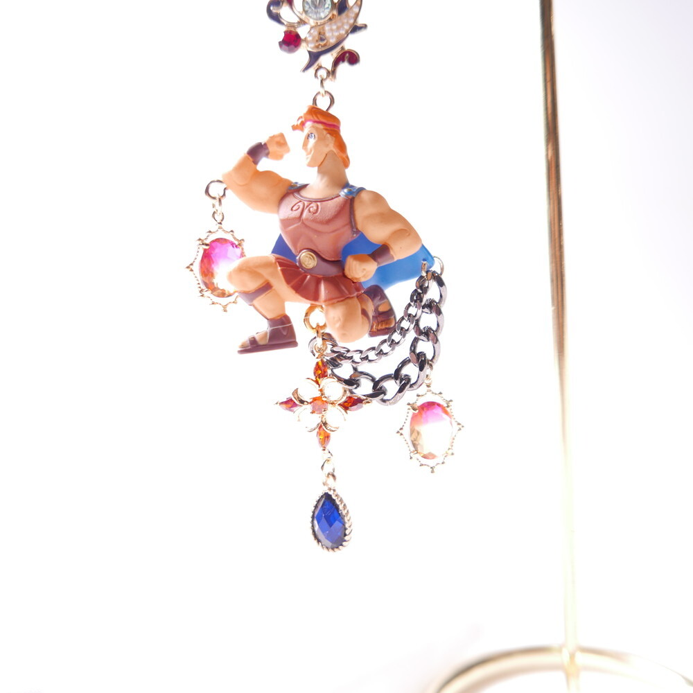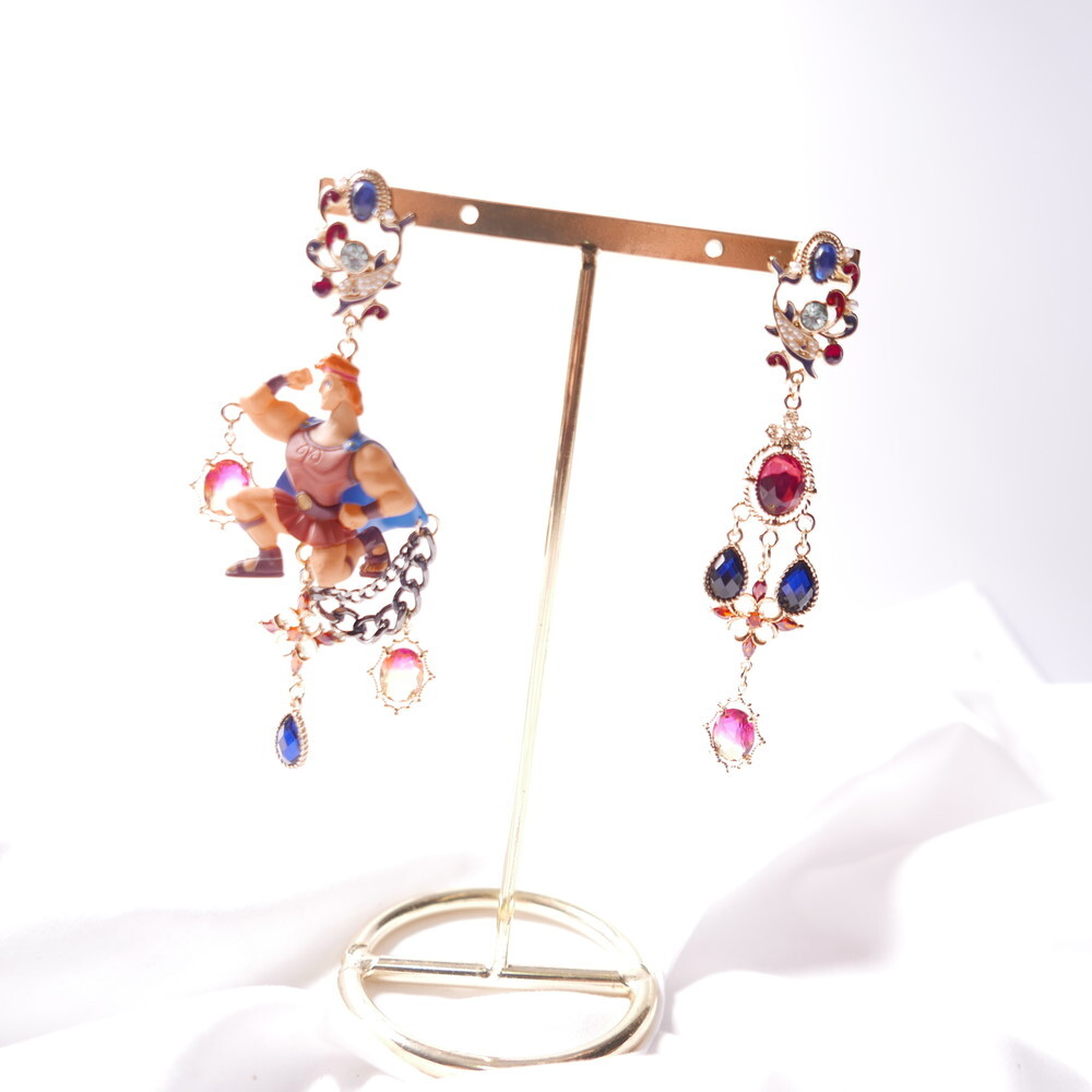 Inspired by the legendary Greek hero, these bold asymmetrical earrings feature a miniature Hercules paired with ornate jewel embellishments. The design combines a heroic pose, flowing blue cape, and a layered mix of chunky and delicate chains. Deep red and blue gemstone elements highlight the dramatic flair, making this a powerful statement piece for mythology or fantasy lovers.