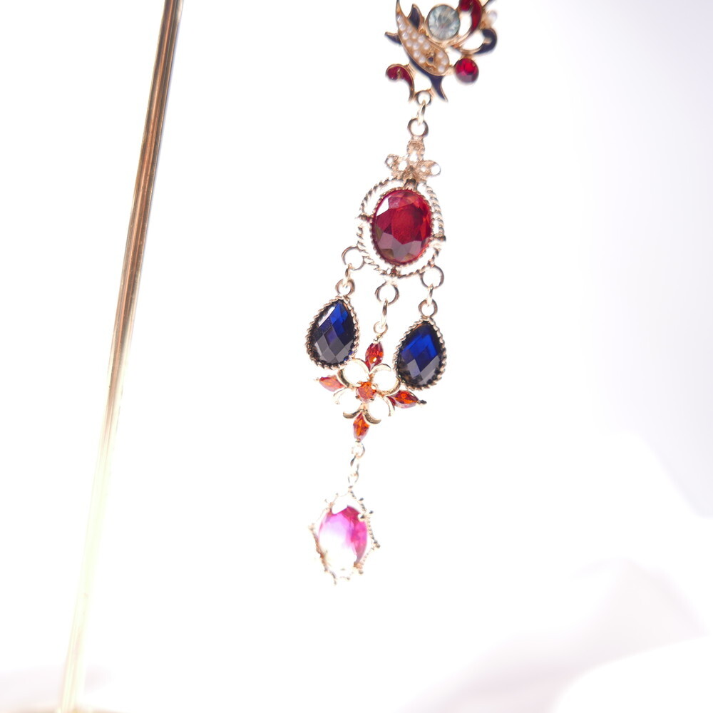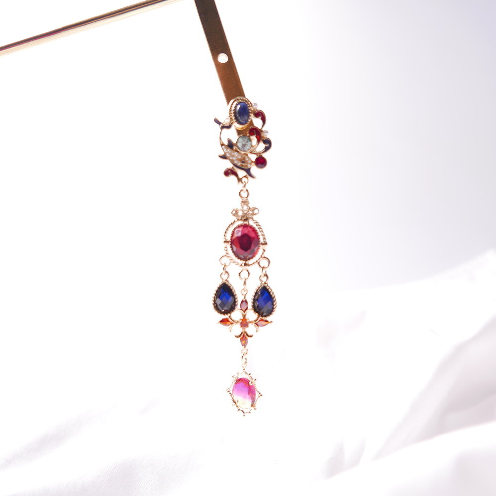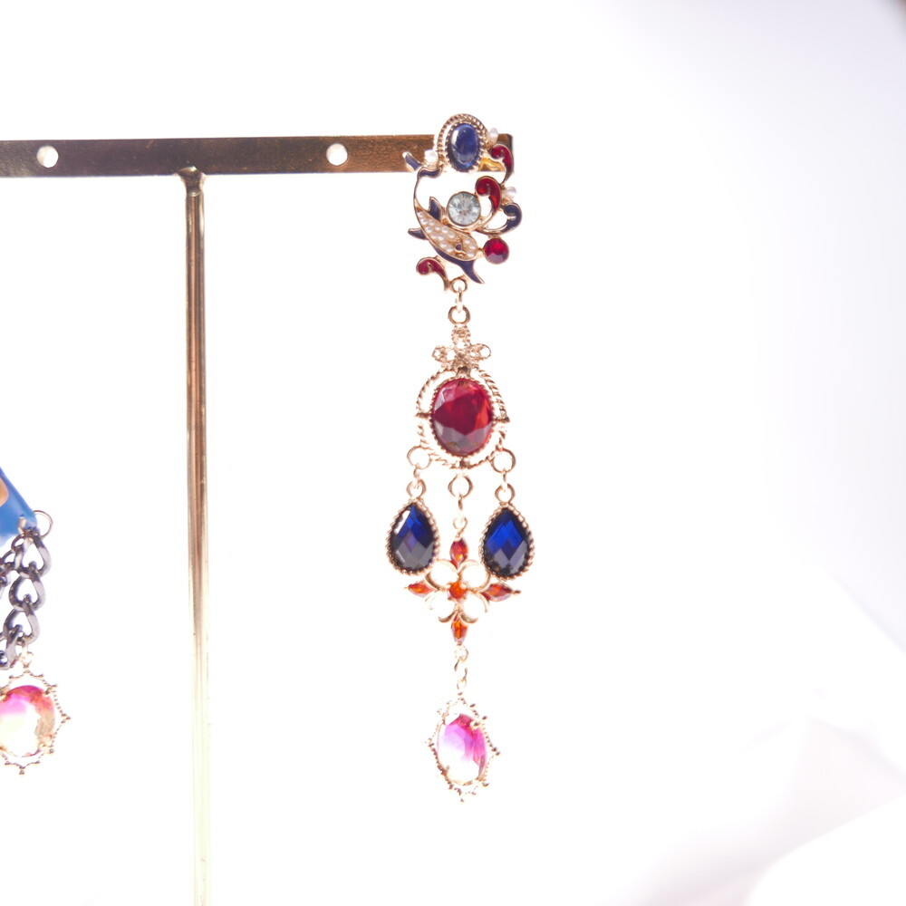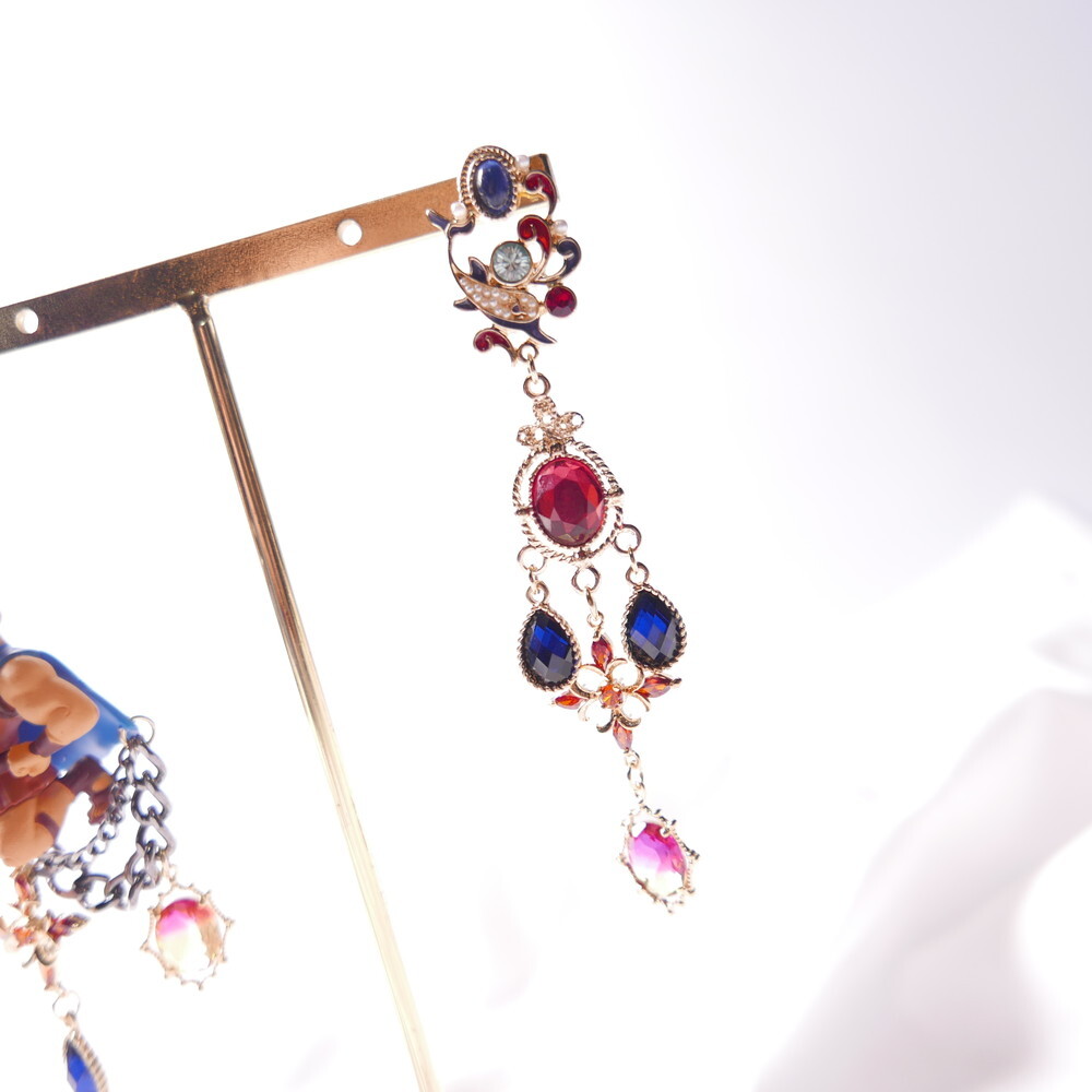 Inspired by the legendary Greek hero, these bold asymmetrical earrings feature a miniature Hercules paired with ornate jewel embellishments. The design combines a heroic pose, flowing blue cape, and a layered mix of chunky and delicate chains. Deep red and blue gemstone elements highlight the dramatic flair, making this a powerful statement piece for mythology or fantasy lovers.