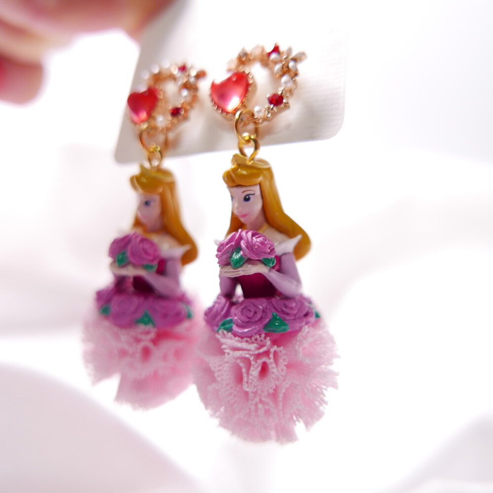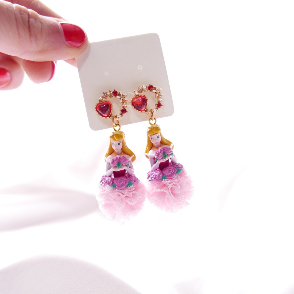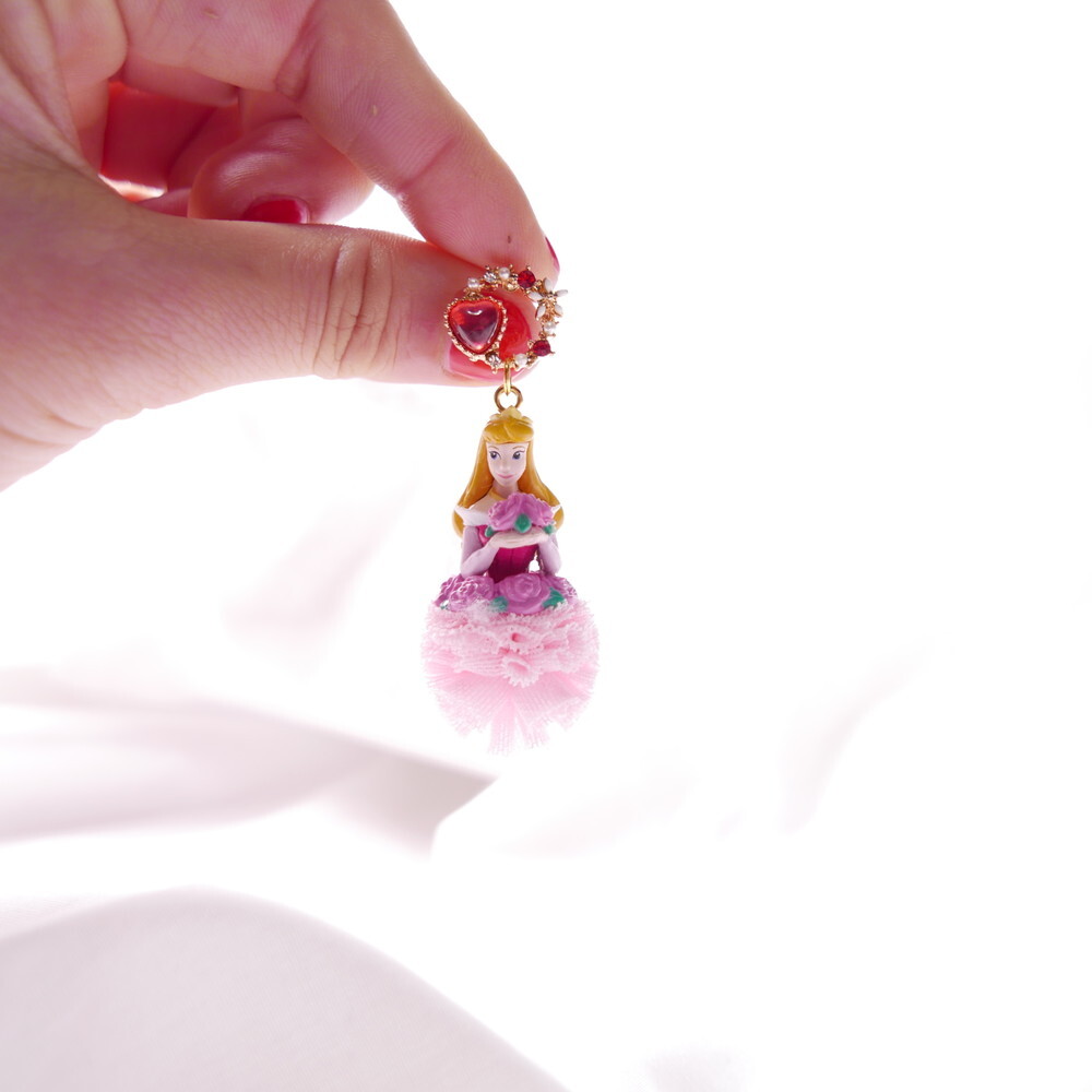 These sweet and romantic earrings feature Aurora in a detailed pink rose dress with lace trim. The soft pastel colors and intricate floral detailing are paired with translucent pink heart studs, adding a fairytale sparkle. Lightweight and dainty, perfect for those who love classic princess vibes with a touch of handmade charm.