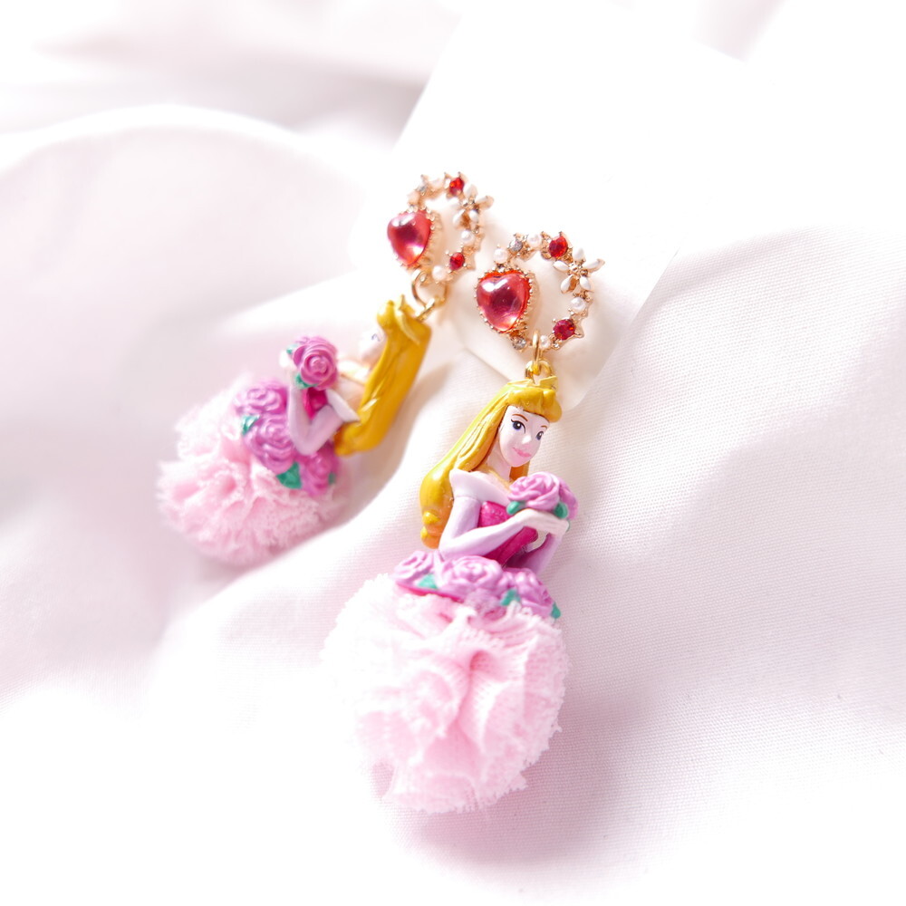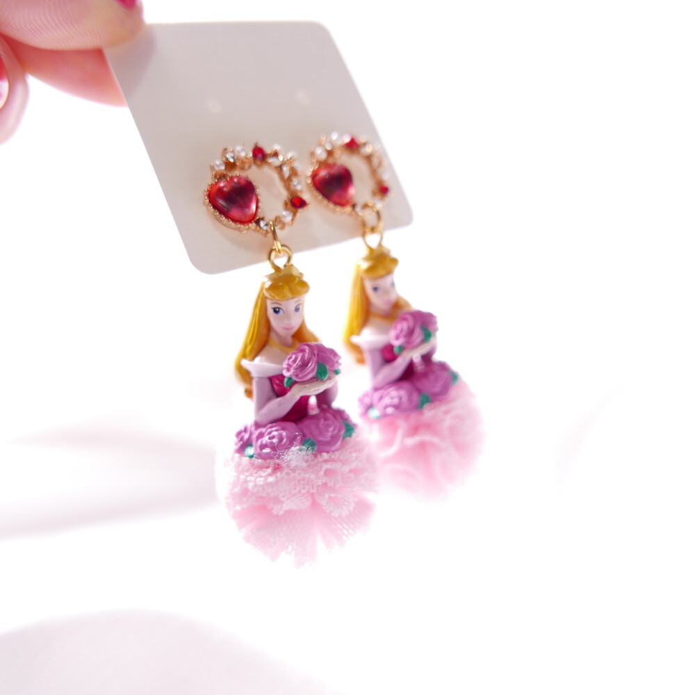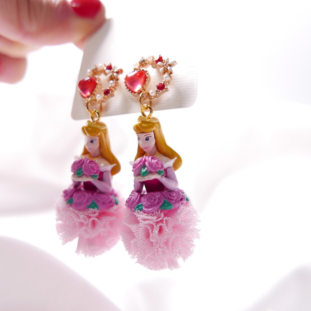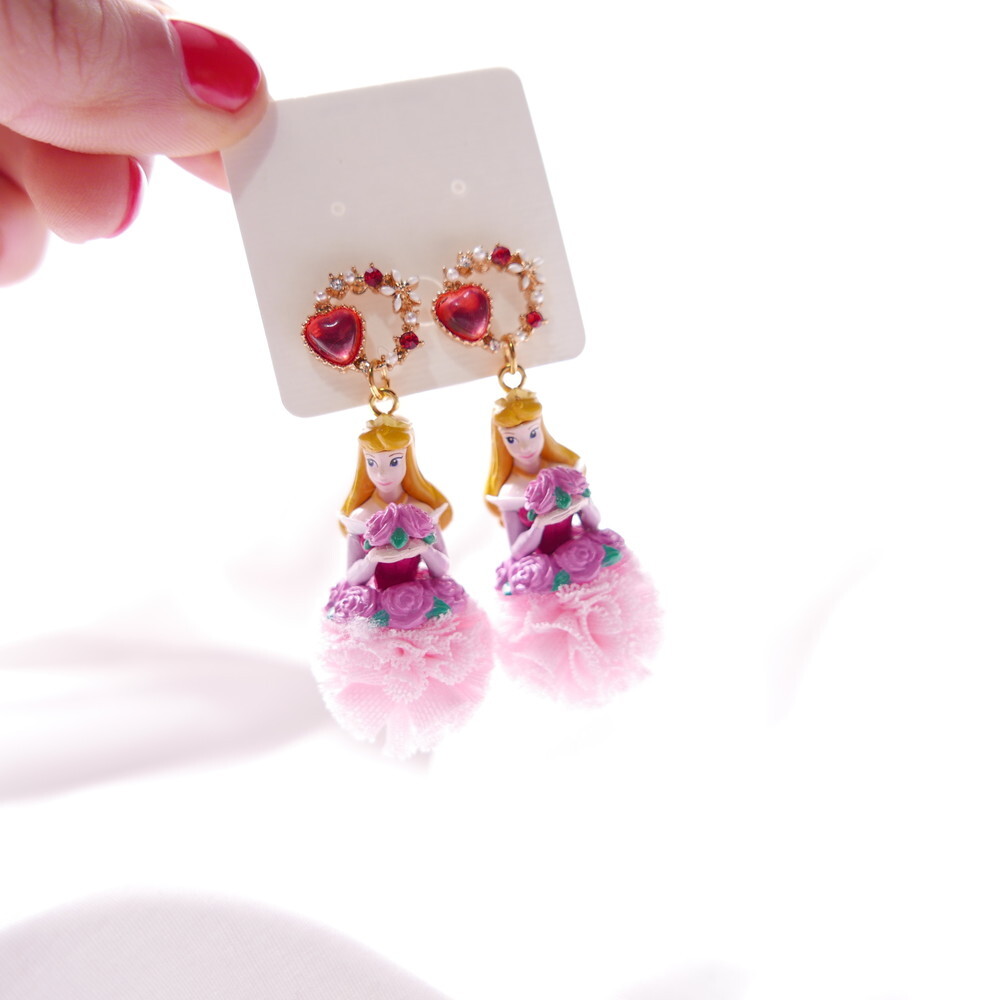 These sweet and romantic earrings feature Aurora in a detailed pink rose dress with lace trim. The soft pastel colors and intricate floral detailing are paired with translucent pink heart studs, adding a fairytale sparkle. Lightweight and dainty, perfect for those who love classic princess vibes with a touch of handmade charm.